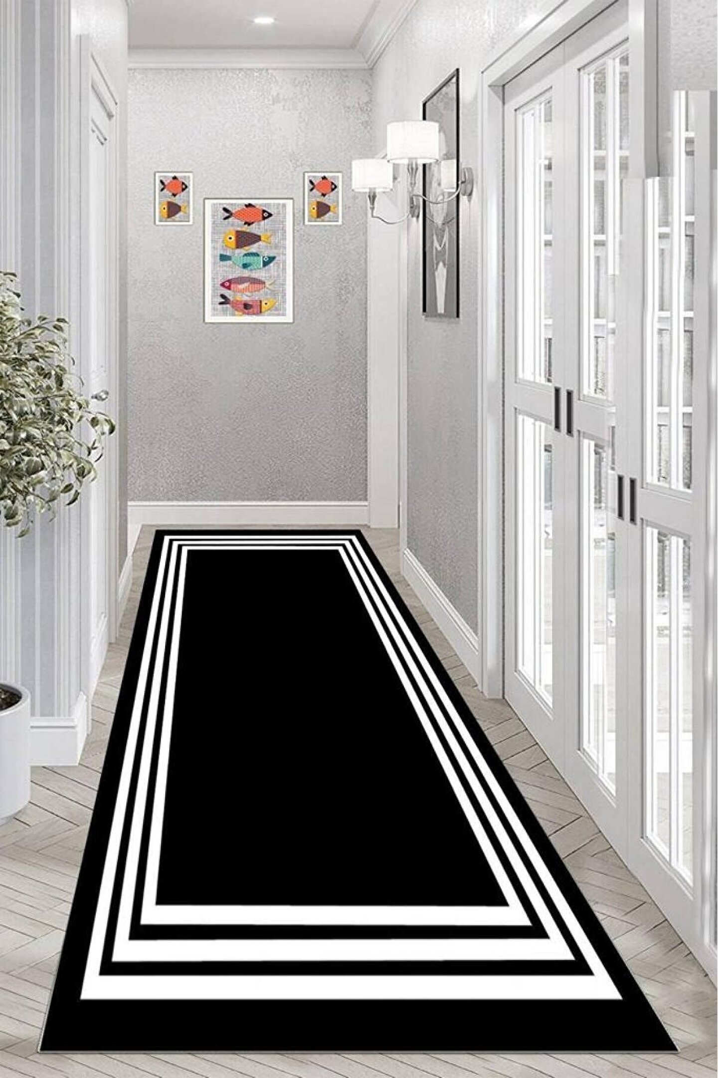 Dijital Baskı Yıkanabilir Kaymaz Taban Siyah Zemin Üç Çizgili Yolluk Halı