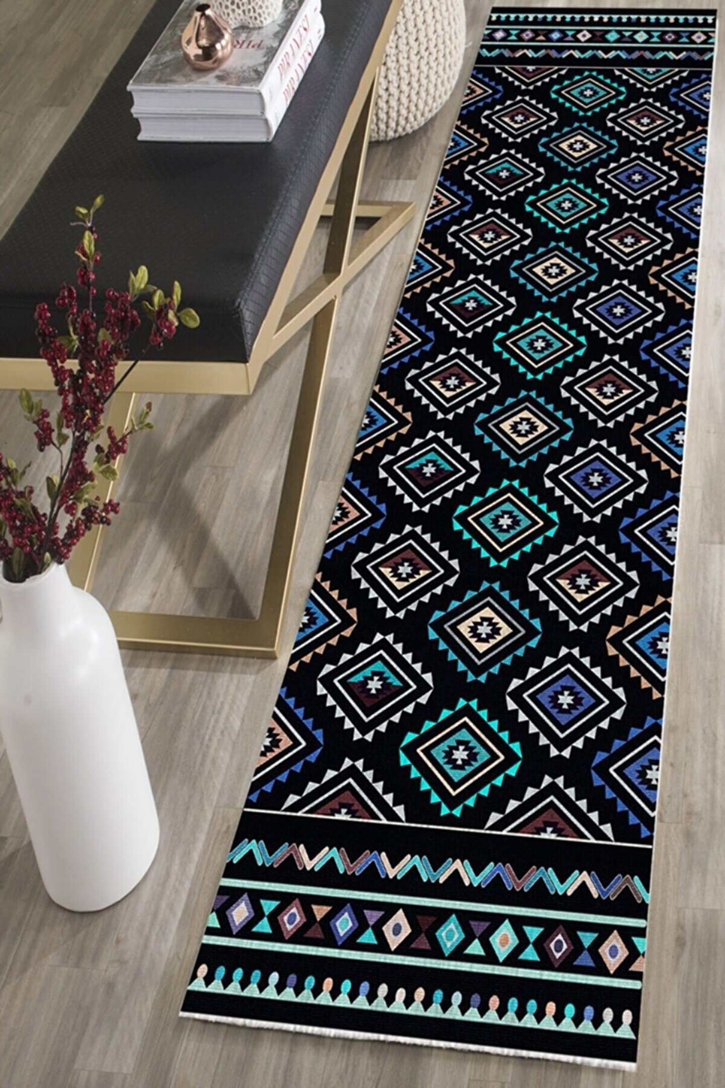 Siyah Zeminli Renkli Kilim Desenli Yolluk Ve Halı