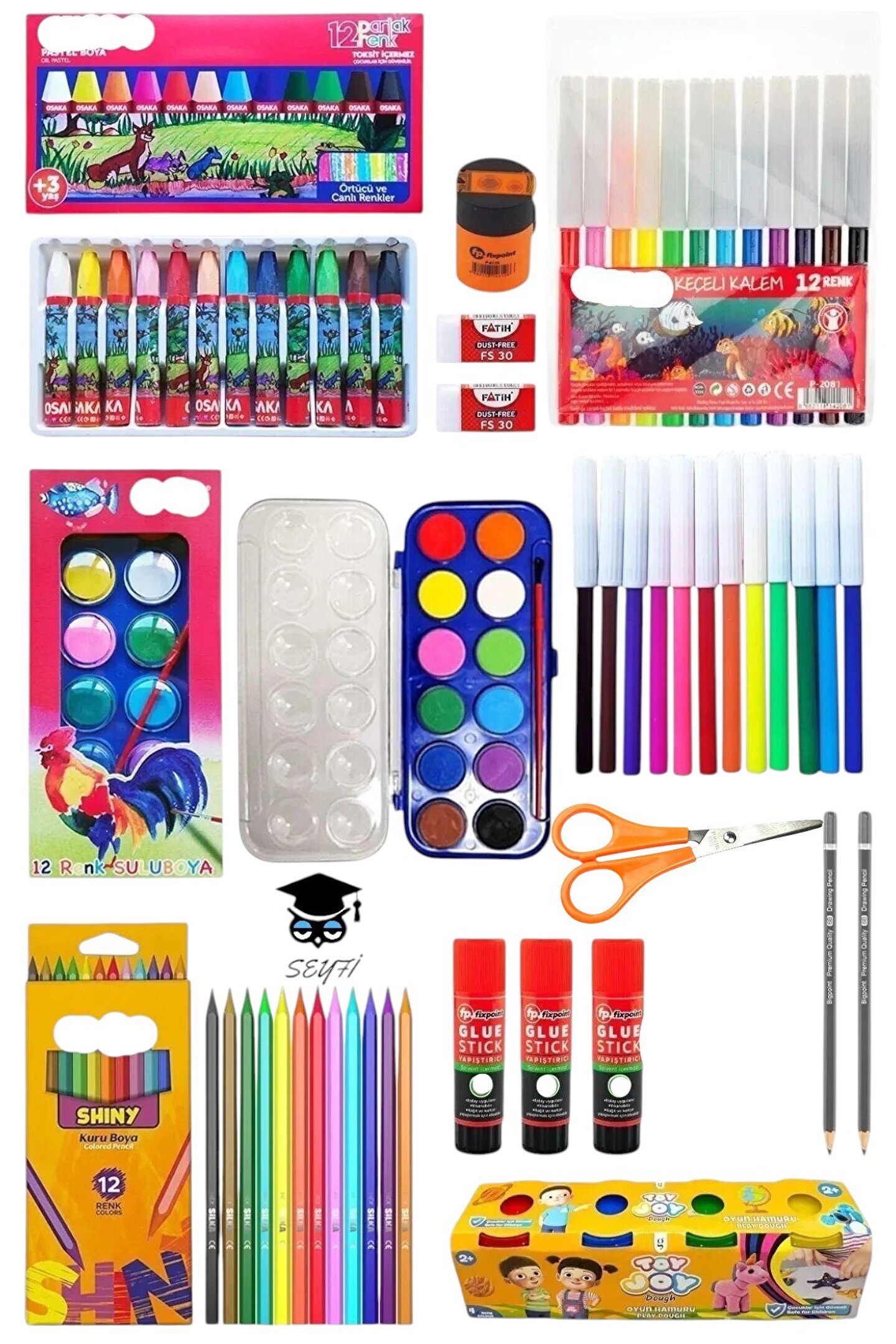 Ürün İçeriği : ; 1 Adet - Pastel Boya Seti 12’li ; 1 Adet - Sulu Boya Seti 12’li ; 1 Adet - Keçeli Kalem 12’li ; 1 Adet - Kuru Boya Seti 12’li ; 1 Adet - Oyun Hamuru 4x120 gram ; 3 Adet - Stick Yapıştırıcı 9 g ; 2 Adet Kalem 6B ; 1 Adet - Okul Makası ; 2 Adet - Beyaz Silgi ; 1 Adet - Çift Hazneli Kalemtıraş ;