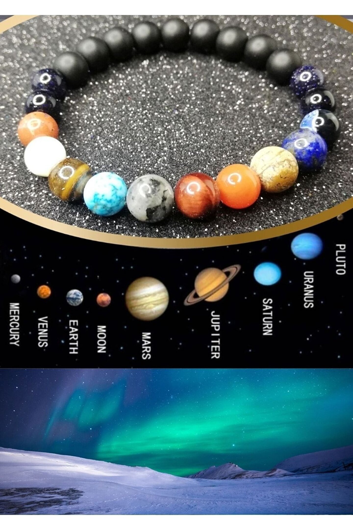 *Güneş Sistemi (Gezegenler) Doğal taş Bileklik *Görselde ki Gezegenler sırasıyla sol baştan; Güneş, Merkür, Venüs, Dünya, Ay, Mars, Jüpiter, Satürn, Uranüs ve Neptün 'dur.; Kullanılan Taşlar; Oniks ,Yıldıztaşı, Akik, , Kaplangözü, Spektrolit, Şahingözü, Akik, Jasper, Azurit Bulunmaktadır.; *Taşlarını Boyutu 8mm.; standart boydadır.; Elastik misina ile gönderilmektedir.; Unisex modeldir.; *Ürünümüzün yanına yedek taş ve elastik misinası ile gönderilmektedir.; *Çakraları dengelemeye yardımcı olur.; Enerji ve canlılık verir.; Nazara karşı etkilidir.; Korku, evham gibi duyguları azaltır.; Pozitif enerjisi yüksektir.; Enerjinizi tüketen insanlara karşı kalkan görevi görür.