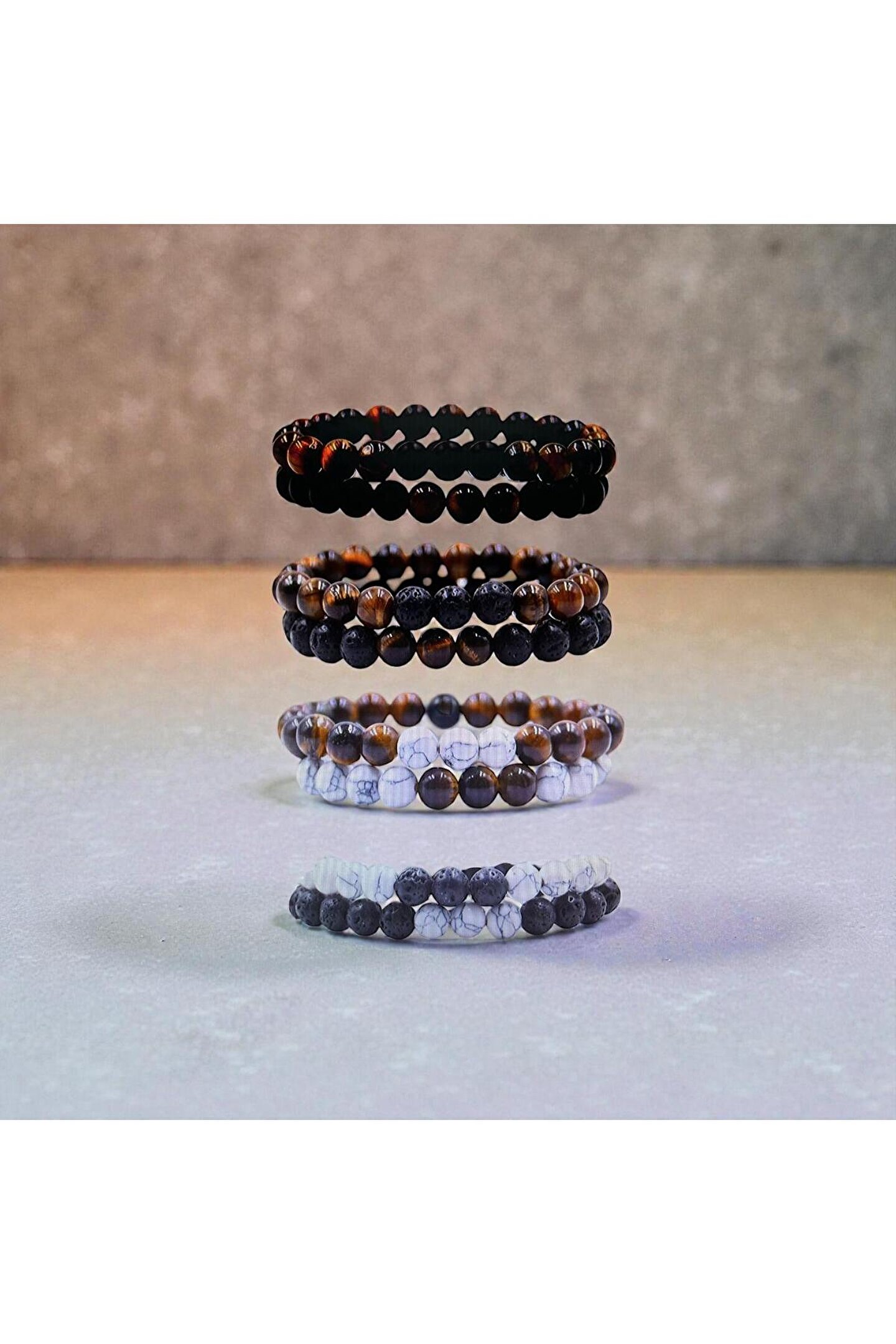 - Kaplangözü ve beyaz lav taşlarının doğal güzelliğini bir arada sunan bu bileklik seti, her bir bileklik 8 adet taş içerir.; - Unisex tasarımıyla hem kadınlar hem de erkekler için uygun olan bu bileklik, her yaş grubundan yetişkinlerin zevkine hitap eder.; - Doğal taş materyali sayesinde her bileklik, benzersiz bir dokunuş ve doğal enerji taşır.; - Türkiye'de üretilen bu özel tasarım bileklik seti, yerel işçiliği ve kaliteyi ön plana çıkarır.; - Sevgili aile boyu bileklik olarak tasarlanmış olup, sevdiklerinizle anlamlı bir bağ kurmanızı sağlar.;