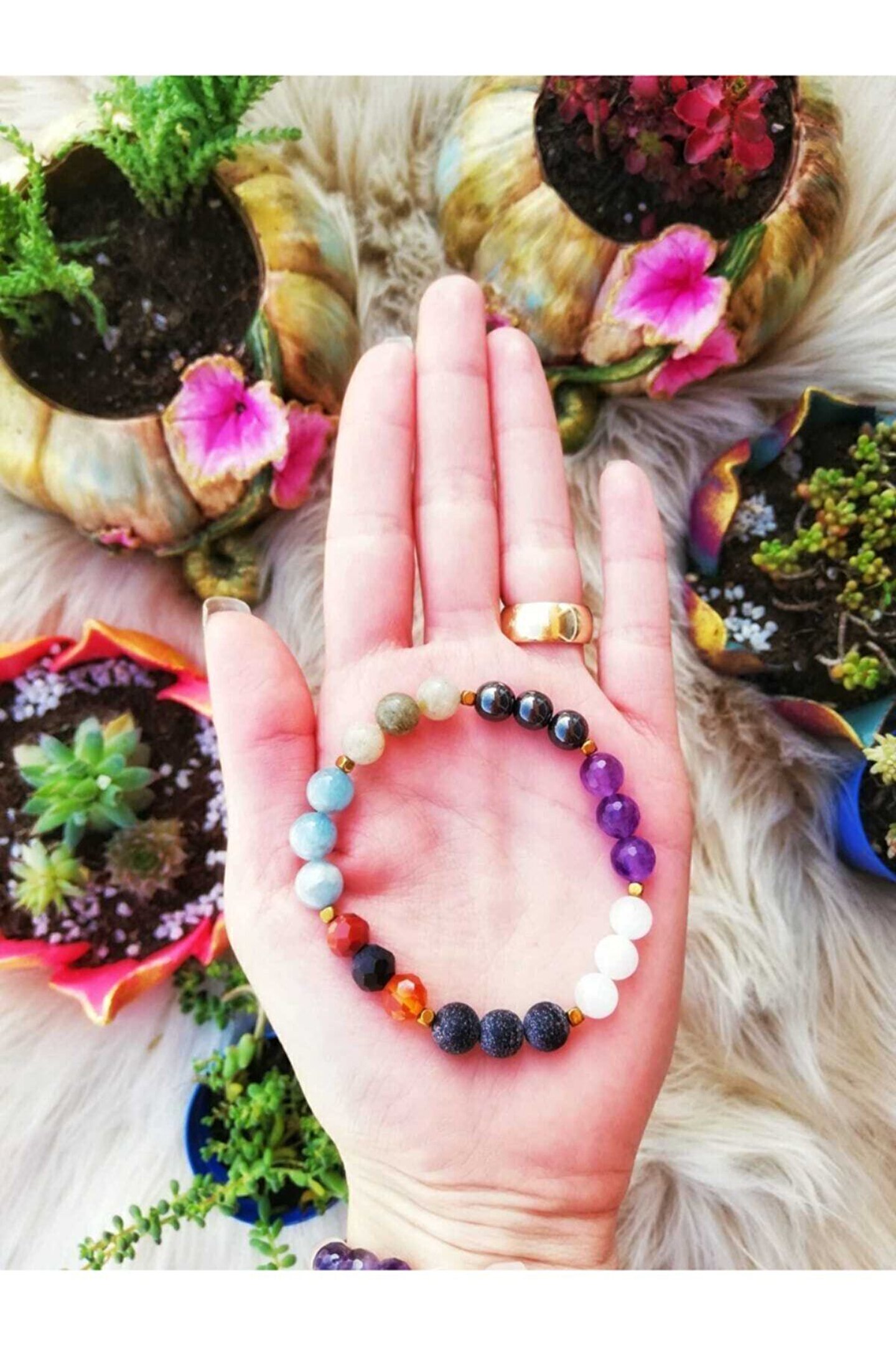 *Ürünümüz Orijinal Doğal Taşlardan Hazırlanmıştır.; Unisex Modeldir.; Bileklik Kova Burcunun en önemli 7 taşından oluşmaktadır.; Bunlar Ametist, Labradorit, Obsidyen, Hematit, Akik, Akuamarin, Aytaşı'dır.; Taşların boyutu 8mm.; dir.; Ara aparatları nikel kaplamadır.; Elastik misina kullanılmıştır.; Paketlemede, ürünümüzün yanına yedek taşları ve elastik misinası ile gönderilmektedir; *Taşlarınızın Arındırılması İçin; haftada bir kez akan suda 5dk.; suda bekleterek, tütsüleyerek veya bir gece toprak üstünde bekleterek enerjilerini dengeleyip temizleyebilirsiniz.
