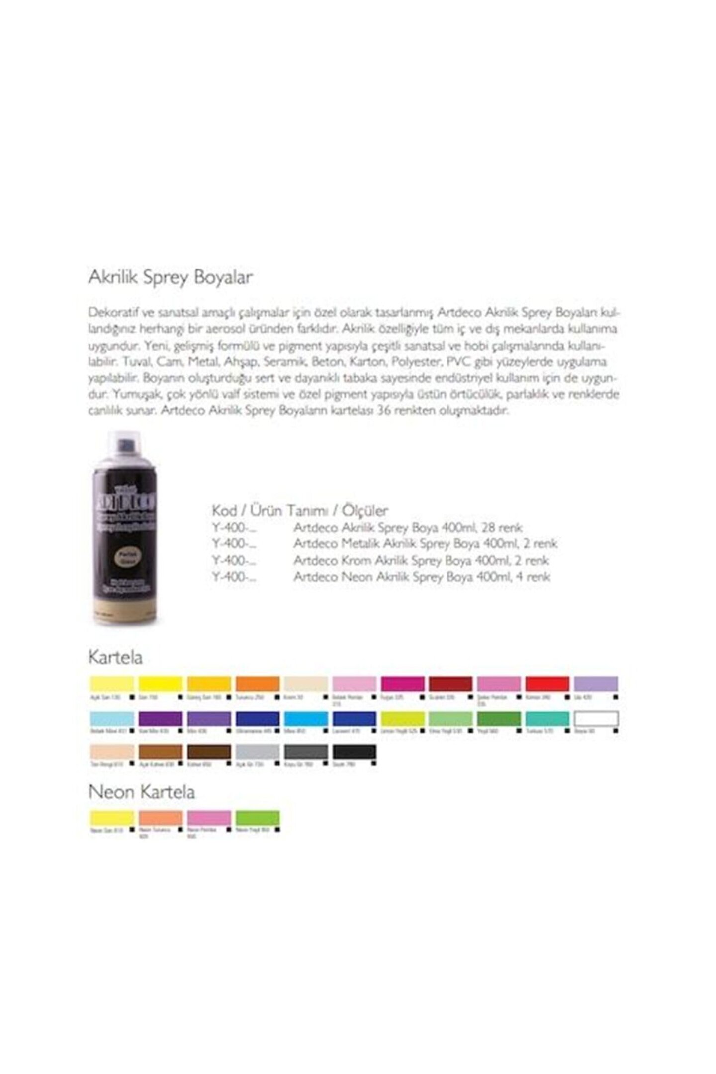 Artdeco Akrilik Sprey Boya 400ml Dekoratif ve sanatsal amaçlı çalışmalar için özel olarak tasarlanmış Artdeco Akrilik Sprey Boyaları kullandığınız herhangi bir aerosol üründen farklıdır.; Akrilik özelliğiyle tüm iç ve dış mekanlarda kullanıma uygundur.; Yeni, gelişmiş formülü ve pigment yapısıyla çeşitli sanatsal ve hobi çalışmalarında kullanılabilir.; Tuval, Cam, Metal, Ahşap, Seramik, Beton, Karton, Polyester, PVC gibi yüzeylerde uygulama yapılabilir.