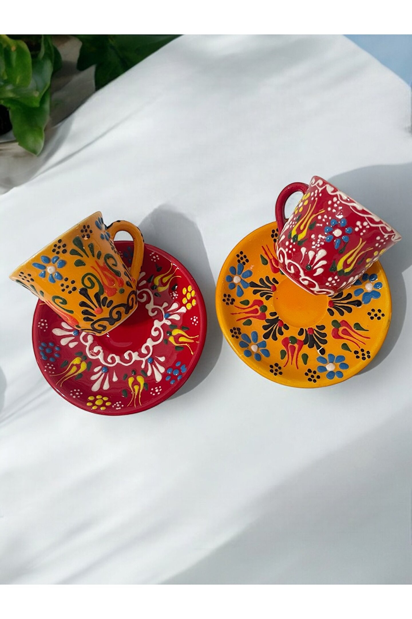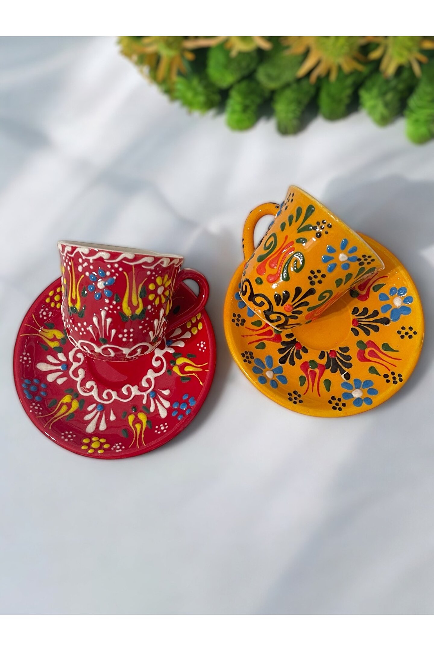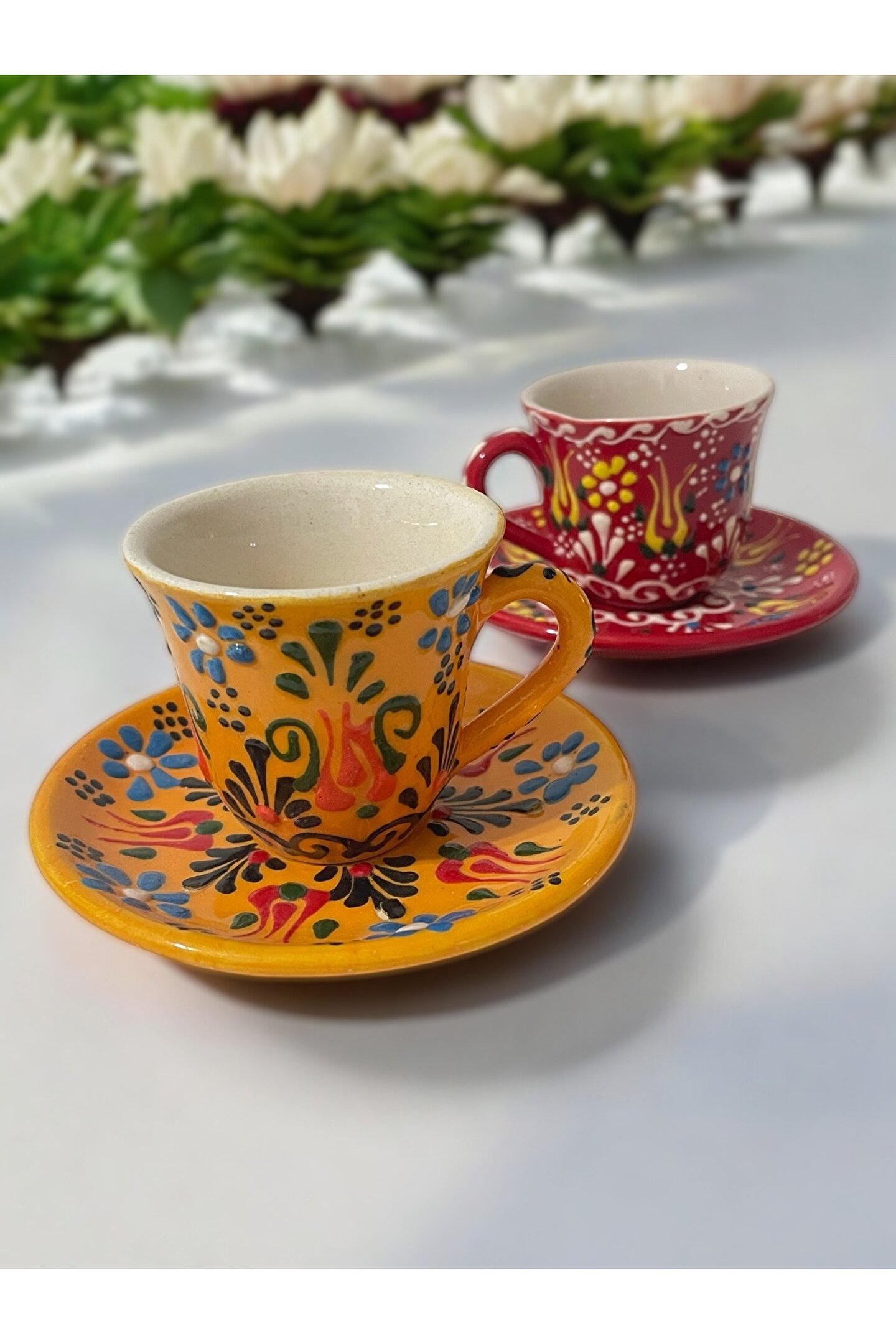 Artistic Quality Dekoratif 2 Kişilik Şık Çini Lale Tasarımlı Tamamen El Yapımı Kahve Fincan Seti