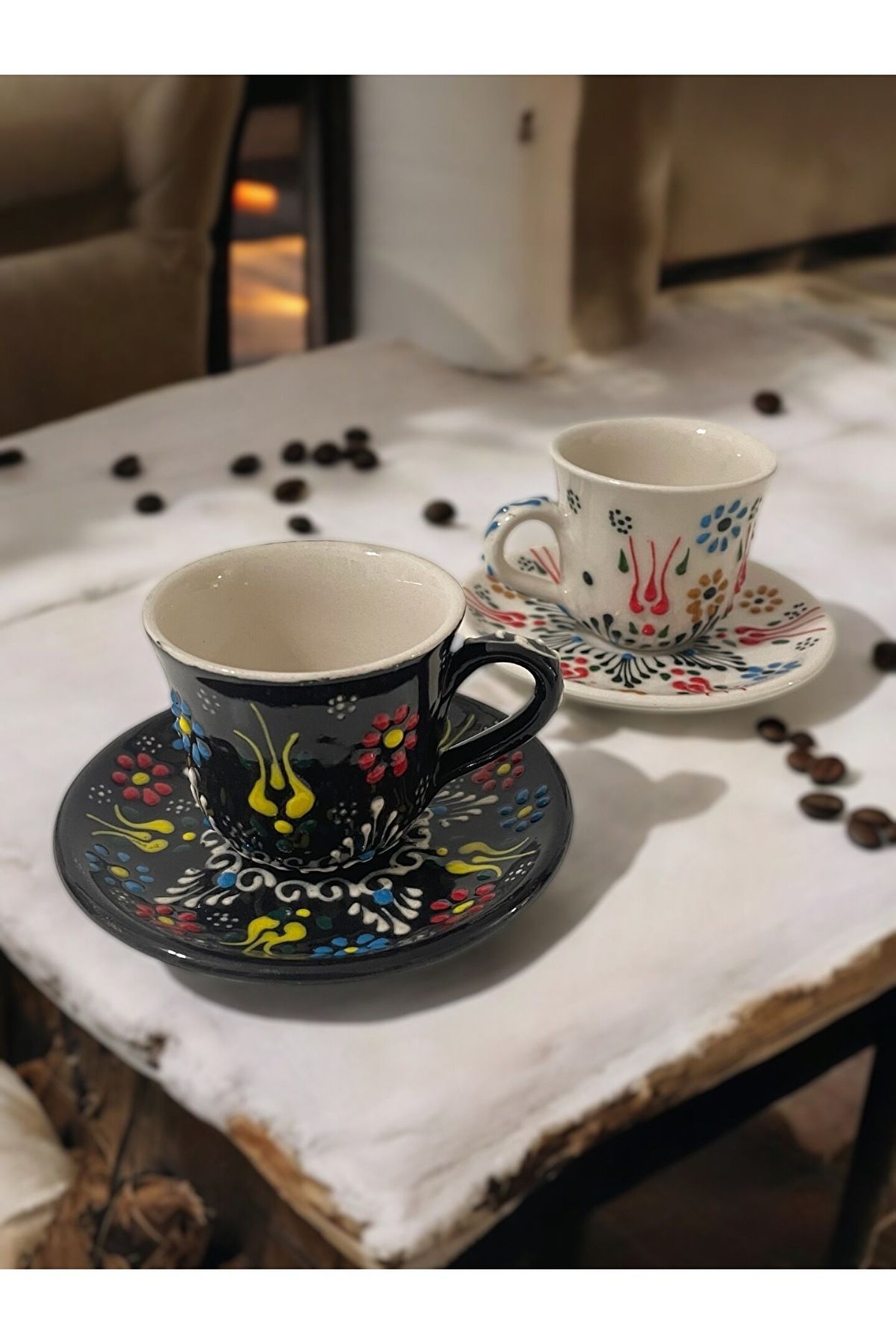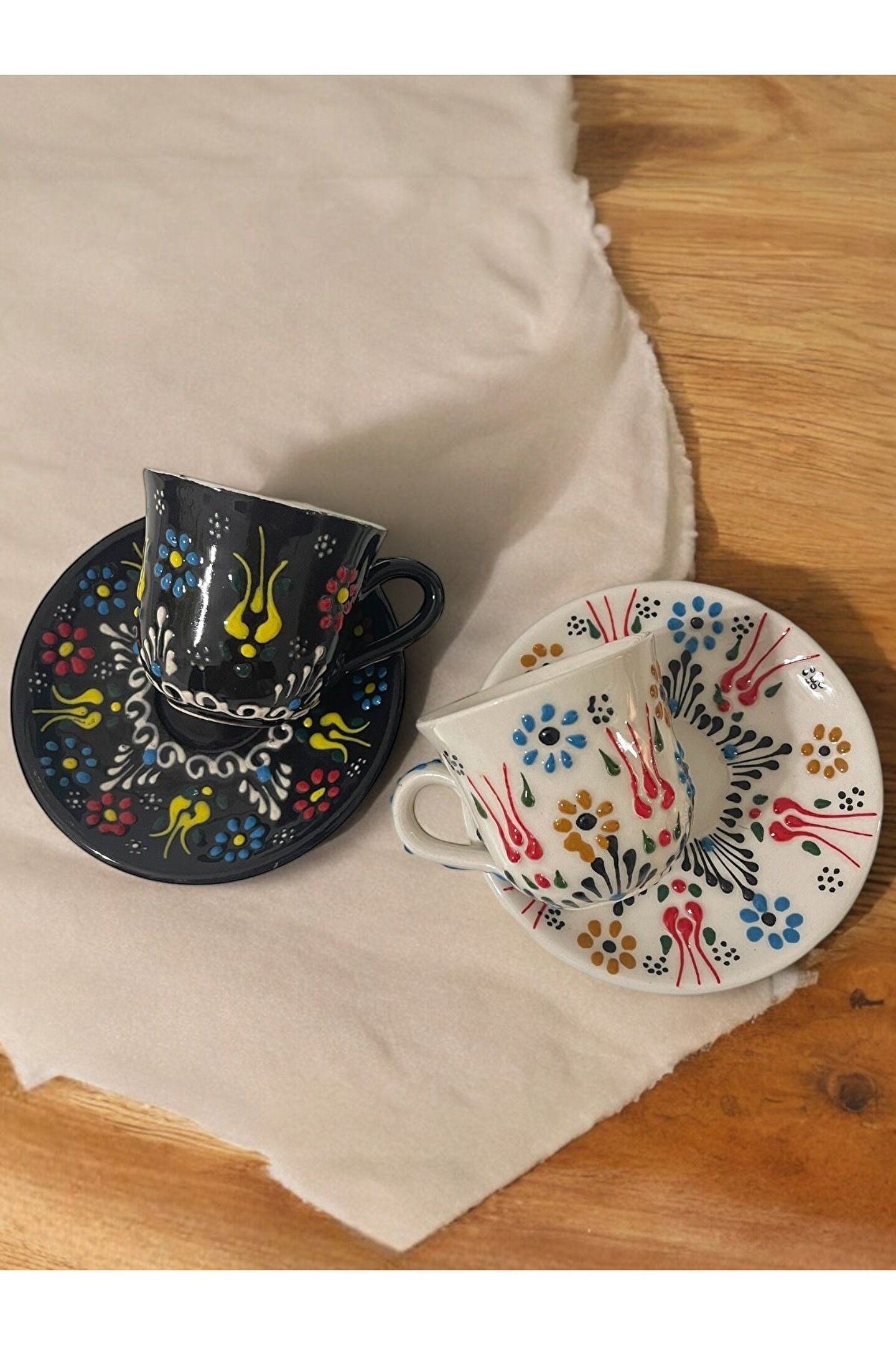 Dekoratif kahve fincanlarımız el yapımıdır. El emek farkından dolayı küçük renk ve desen farklılıkları oluşabilmektedir. Bu farklar setimizi tamamen sizlere özel kılmaktadır. Setimiz çini desen Lale işlemeli, Siyah ve Beyaz renklerindedir. Fincanlarımızın ölçüleri 90 ml. hacminde, 6 cm. yüksekliğinde, 7 cm. çapında ve kulp dahil 9 cm. genişliğindedir. Tabaklarımız 12,5*1,5 cm.dir. Zarif görünümü ile kahve keyfinize ve ikramlarınıza eşsiz bir hava katacaktır. Ülkemiz sanat atölyelerinde imal edilmiş olup öz kaynaklarımızın içe kullanım sürecini destekler ve tüm kazanımlar yine ülkemiz içinde kalır. 2 adet fincan, 2 adet tabaktan oluşan setimiz 4 parça ve 2 kişiliktir.