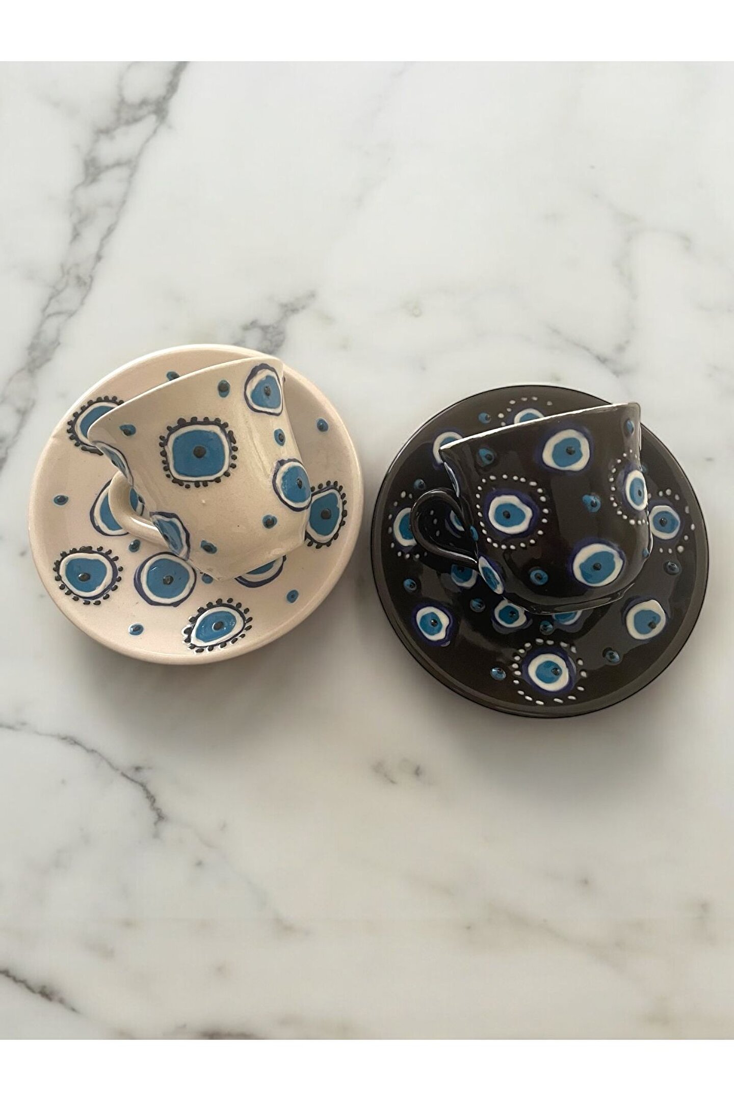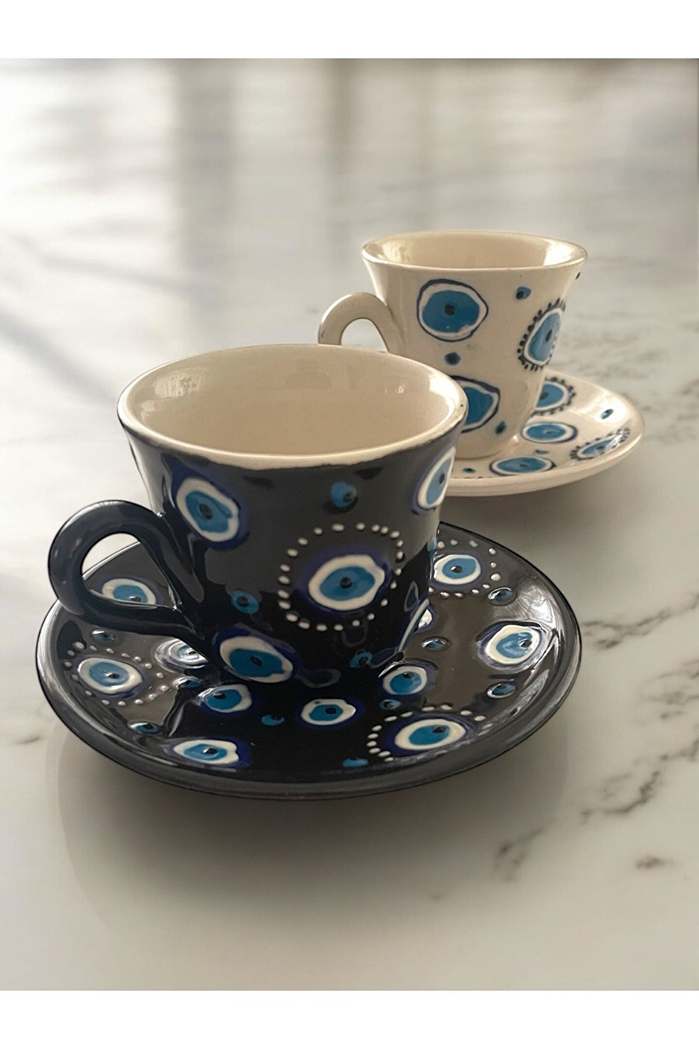 Setimiz sıcak ve soğuk gıda temasına uygun olup, premium kalitede seramik malzemeden üretilmiştir. Mikro dalga fırında kullanılabilir, Bulaşık makinasında kısa program ve düşük sıcaklıkta yıkama yapılması setimize çok daha uzun kullanım imkanı sunacaktır. Hafif ve ince yapısı ile kahve keyfinizi daha zarif hale getirecek, Nazar boncuğu desen ve renk işlemeleri ile konuk ikramlarınızı görsel şölene dönüştürecektir. Bu özel set tamamen el emeği ile üretilmiştir. Hediyeleşmek için birebir olup, sevdiklerinize özel, zarif ve anlamlı tercihler olacaktır.
