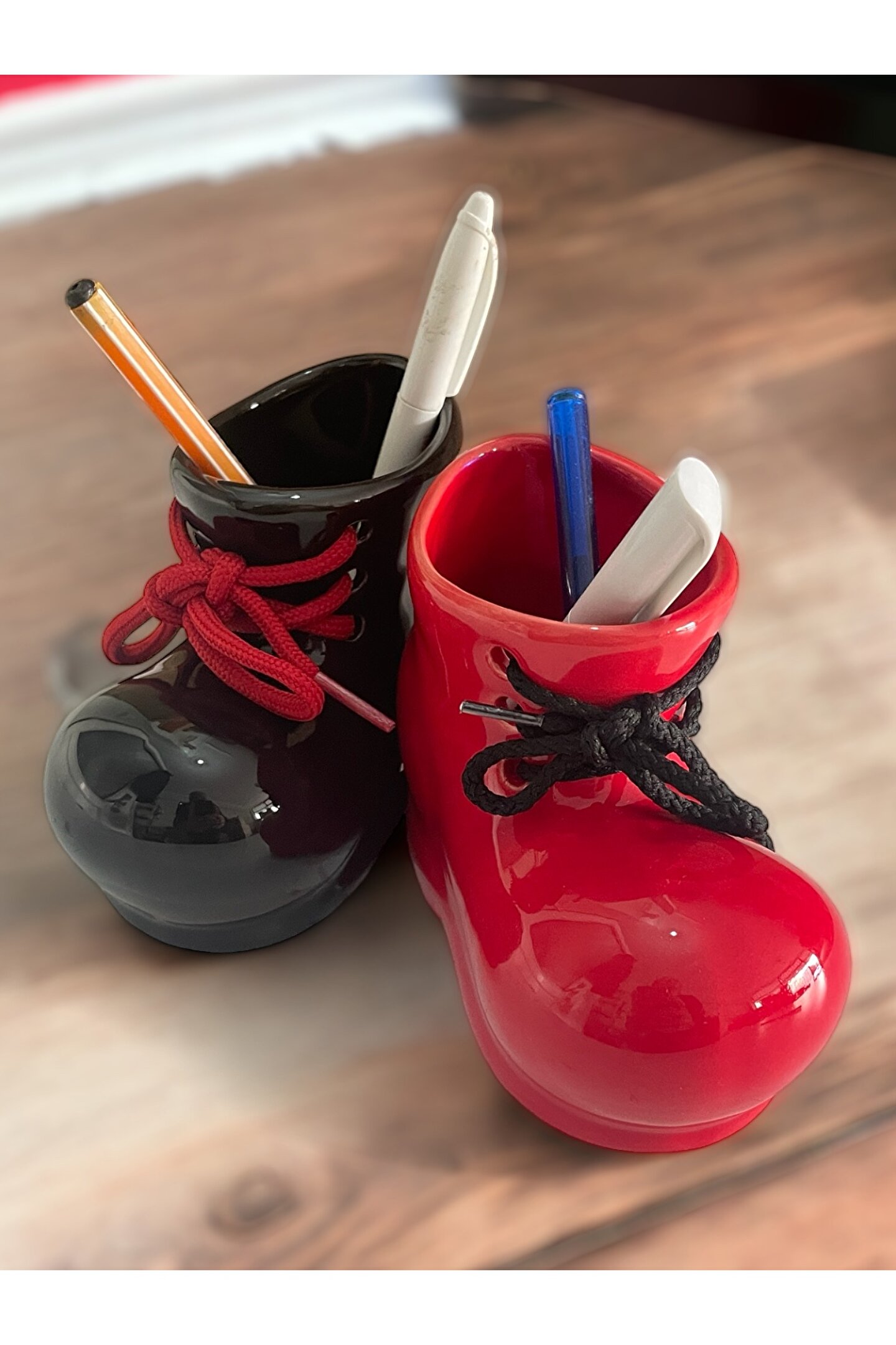 Reçine malzemesi sayesinde dayanıklı ve uzun ömürlü kullanım sunar; Şık siyah ve kırmızı renk kombinasyonu ile çalışma alanınıza modern bir dokunuş katar; Bot ipli tasarımı, kalemlerinizi düzenli ve kolayca erişilebilir hale getirir; Masa üstünüzde şık bir dekoratif obje olarak da kullanılabilir;