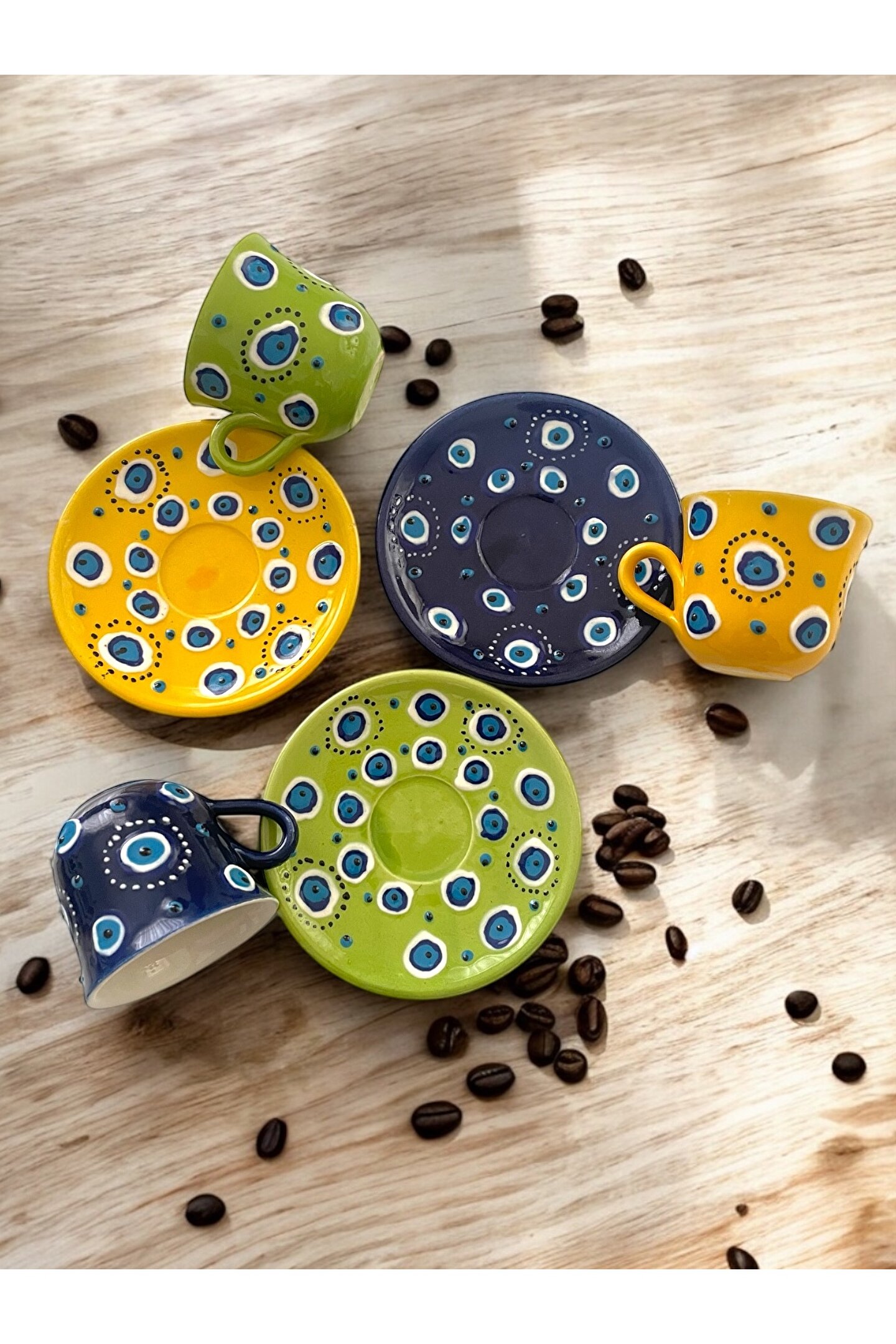 Setimiz sıcak ve soğuk gıda temasına uygun olup, premium kalitede seramik malzemeden üretilmiştir. Mikro dalga fırında kullanılabilir, Bulaşık makinasında kısa program ve düşük sıcaklıkta yıkama yapılması setimize çok daha uzun kullanım imkanı sunacaktır. Hafif ve ince yapısı ile kahve keyfinizi daha zarif hale getirecek, Nazar boncuğu desen ve renk işlemeleri ile konuk ikramlarınızı görsel şölene dönüştürecektir. Bu özel set tamamen el emeği ile üretilmiştir. Hediyeleşmek için birebir olup, sevdiklerinize özel, zarif ve anlamlı tercihler olacaktır.