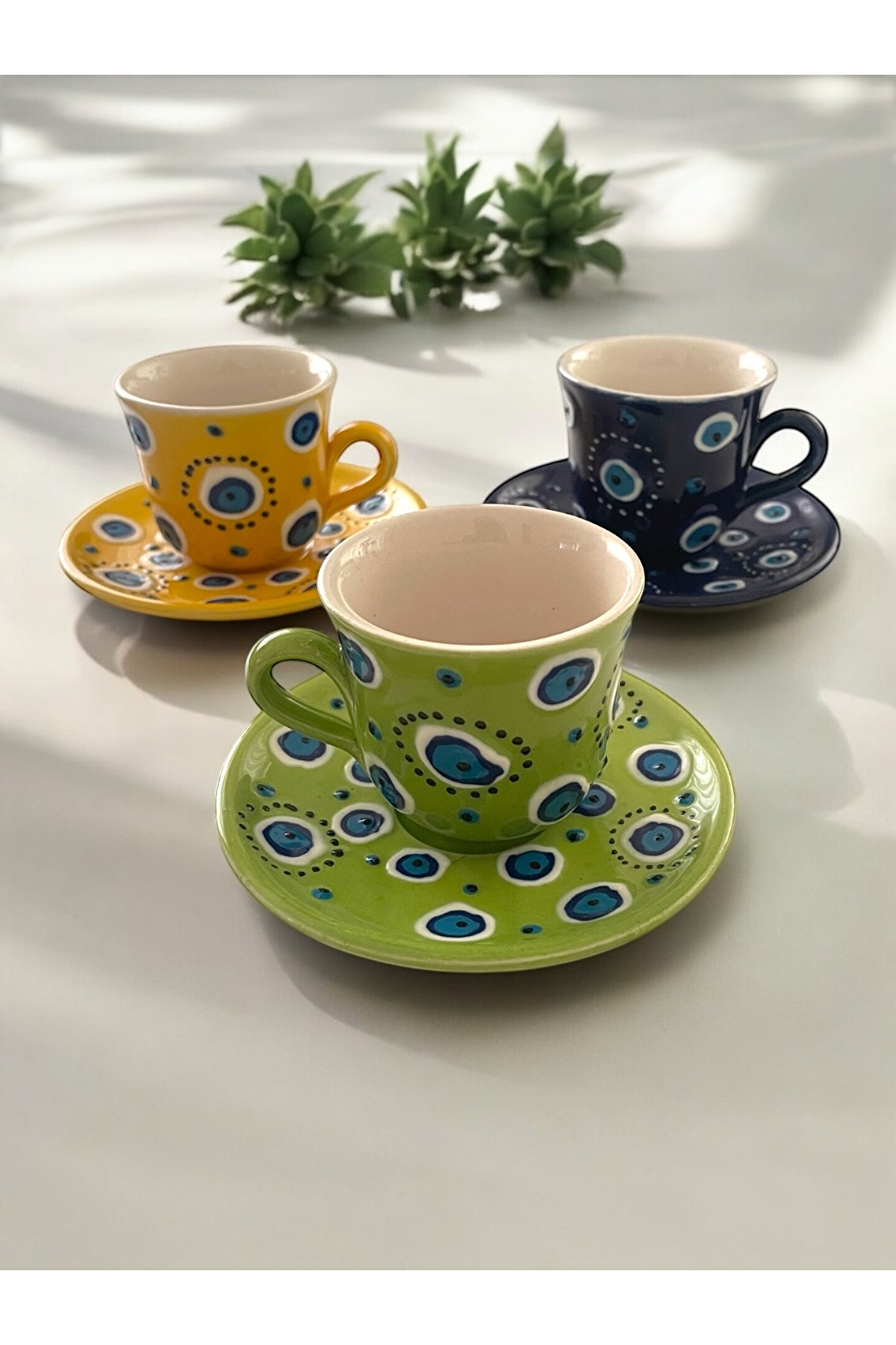 Dekoratif kahve fincanlarımız el yapımıdır. El emek farkından dolayı küçük renk ve desen farklılıkları oluşabilmektedir. Bu farklar setimizi tamamen sizlere özel kılmaktadır. Setimiz çini desen Nazar boncuğu işlemeli, Sarı, Yeşil ve Lacivert renklerindedir. Fincanlarımızın ölçüleri 90 ml. hacminde, 6 cm. yüksekliğinde, 7 cm. çapında ve kulp dahil 9 cm. genişliğindedir. Tabaklarımız 12,5*1,5 cm.dir. Zarif görünümü ile kahve keyfinize ve ikramlarınıza eşsiz bir hava katacaktır. Ülkemiz sanat atölyelerinde imal edilmiş olup öz kaynaklarımızın içe kullanım sürecini destekler ve tüm kazanımlar yine ülkemiz içinde kalır. 3 adet fincan, 3 adet tabaktan oluşan setimiz 6 parça ve 3 kişiliktir.