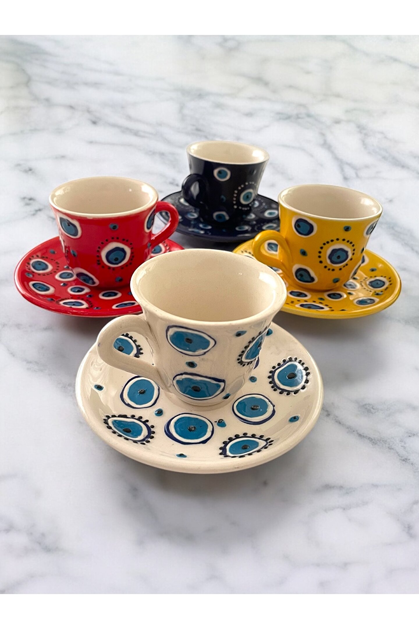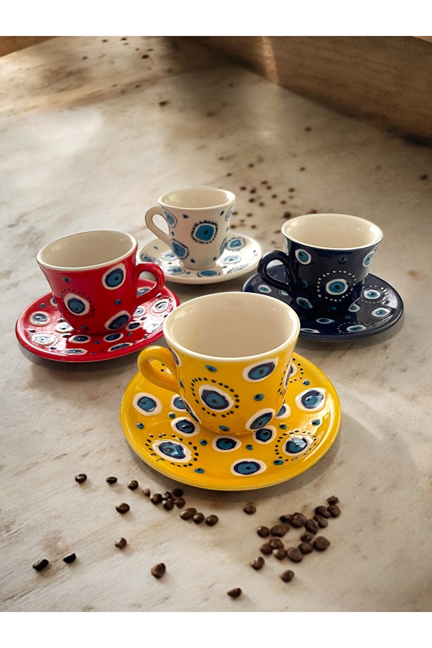 Dekoratif kahve fincanlarımız el yapımıdır. El emek farkından dolayı küçük renk ve desen farklılıkları oluşabilmektedir. Bu farklar setimizi tamamen sizlere özel kılmaktadır. Setimiz çini desen Nazar boncuğu işlemeli, Sarı, Kırmızıi, Beyaz ve Lacivert renklerindedir. Fincanlarımızın ölçüleri 90 ml. hacminde, 6 cm. yüksekliğinde, 7 cm. çapında ve kulp dahil 9 cm. genişliğindedir. Tabaklarımız 12,5*1,5 cm.dir. Zarif görünümü ile kahve keyfinize ve ikramlarınıza eşsiz bir hava katacaktır. Ülkemiz sanat atölyelerinde imal edilmiş olup öz kaynaklarımızın içe kullanım sürecini destekler ve tüm kazanımlar yine ülkemiz içinde kalır. 4 adet fincan, 4 adet tabaktan oluşan setimiz 8 parça ve 4 kişiliktir.