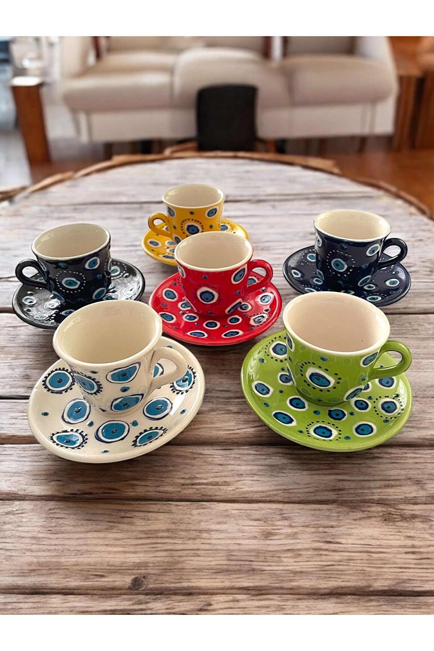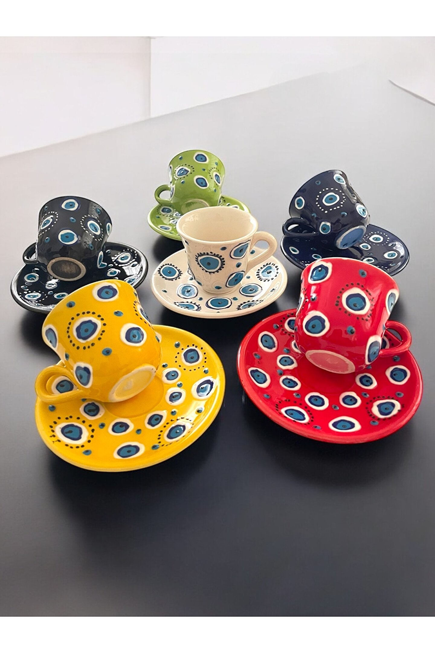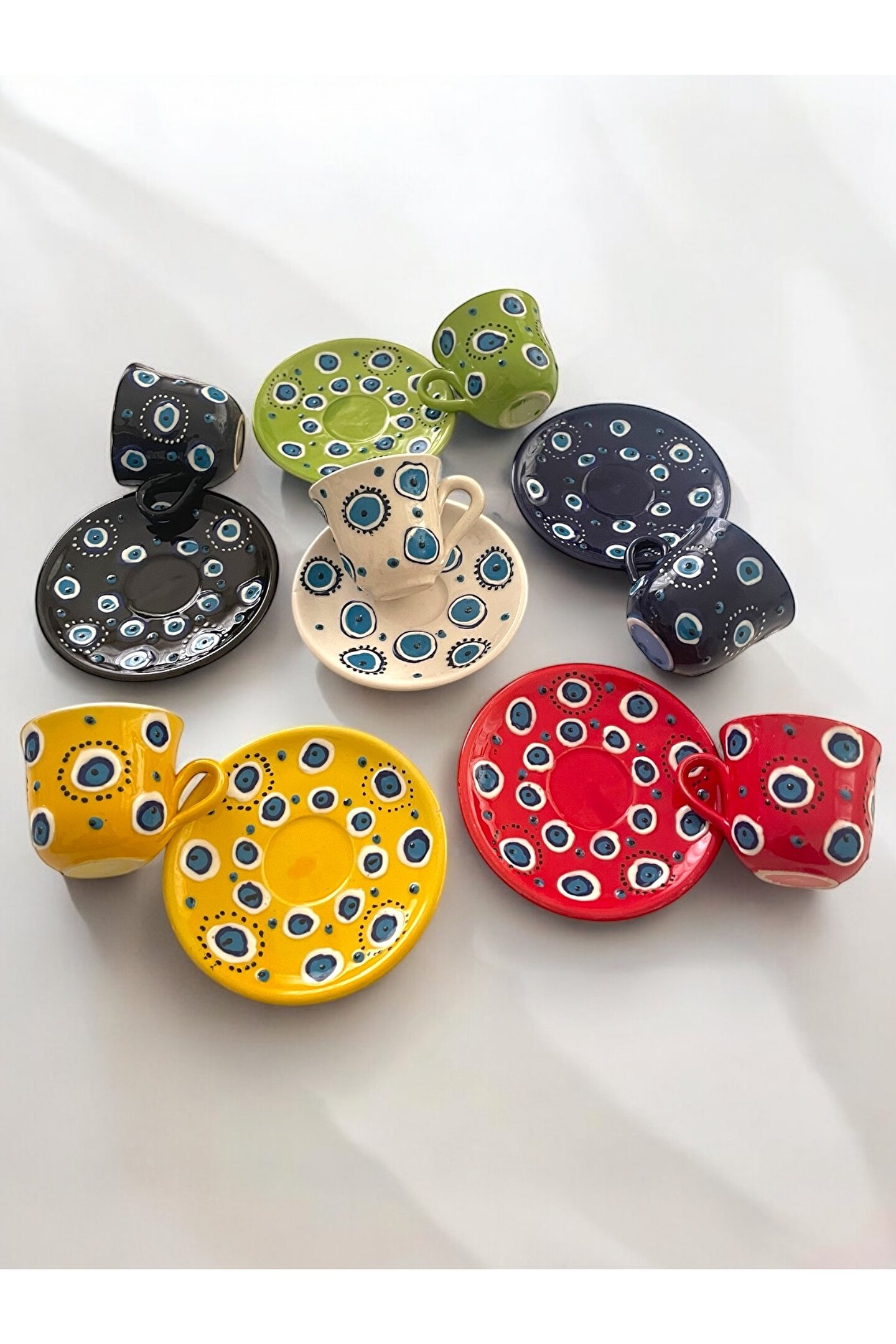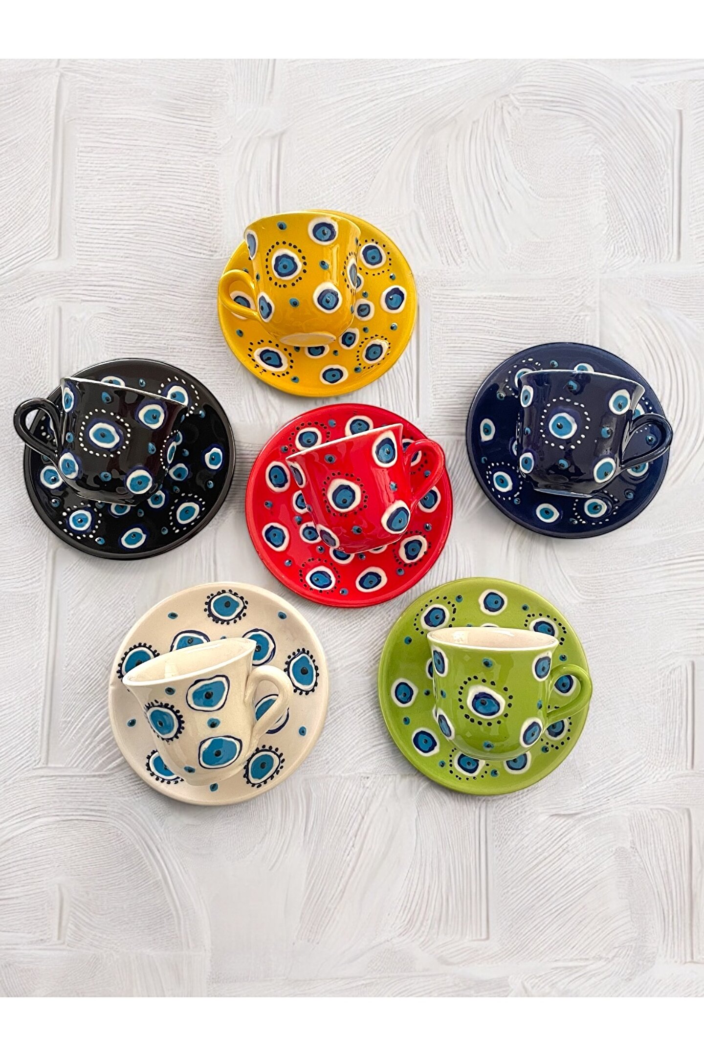 Setimiz sıcak ve soğuk gıda temasına uygun olup, premium kalitede seramik malzemeden üretilmiştir. Mikro dalga fırında kullanılabilir, Bulaşık makinasında kısa program ve düşük sıcaklıkta yıkama yapılması setimize çok daha uzun kullanım imkanı sunacaktır. Hafif ve ince yapısı ile kahve keyfinizi daha zarif hale getirecek, Nazar boncuğu desen ve renk işlemeleri ile konuk ikramlarınızı görsel şölene dönüştürecektir. Bu özel set tamamen el emeği ile üretilmiştir. Hediyeleşmek için birebir olup, sevdiklerinize özel, zarif ve anlamlı tercihler olacaktır.