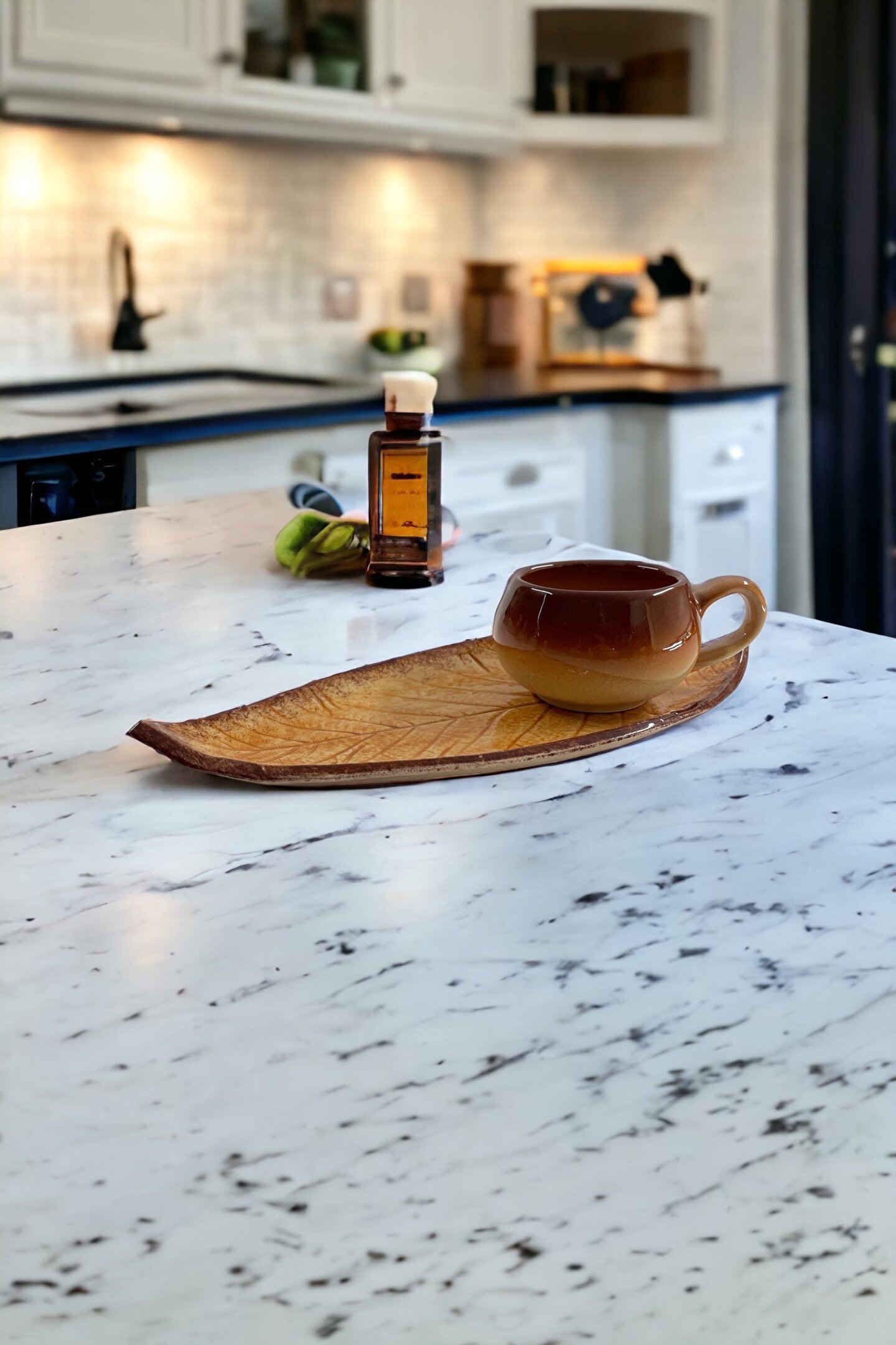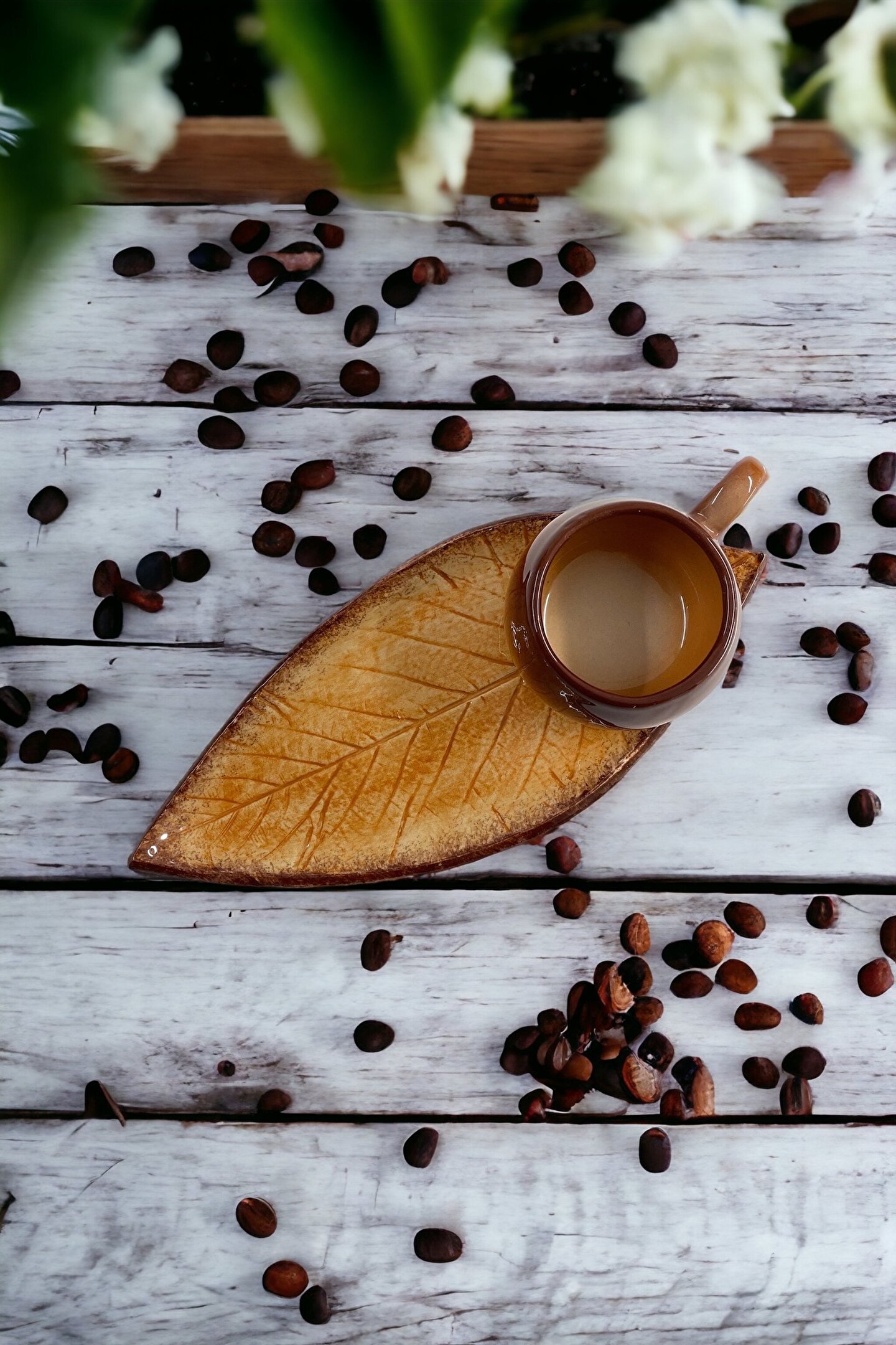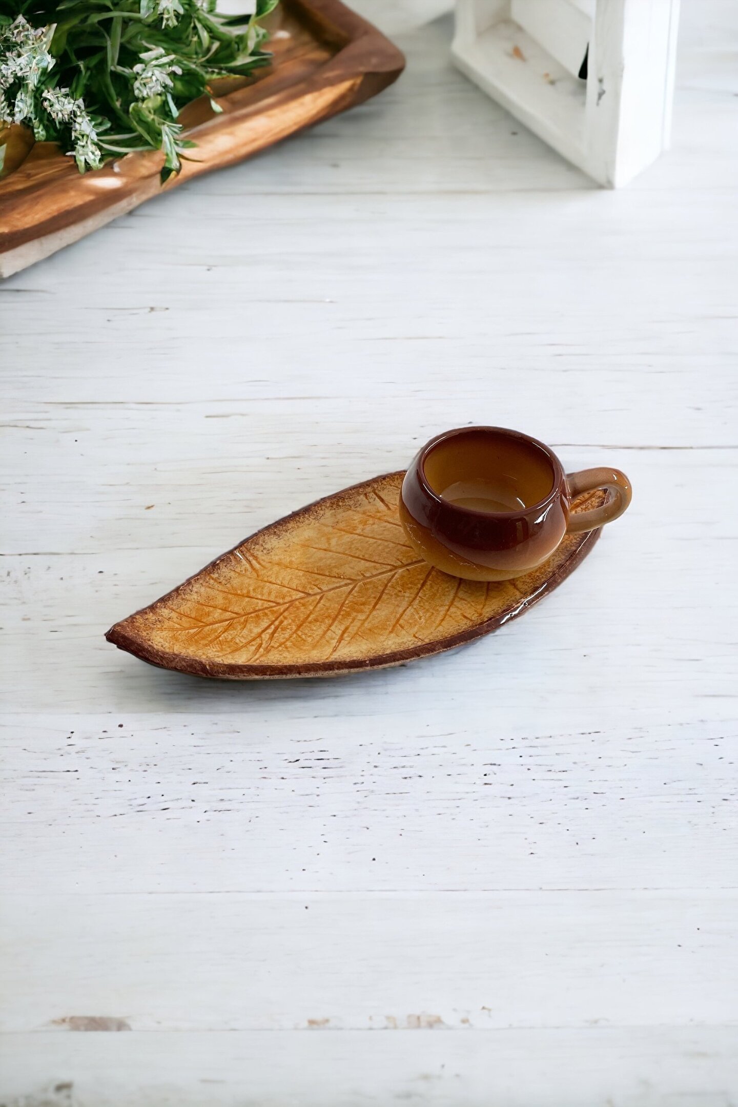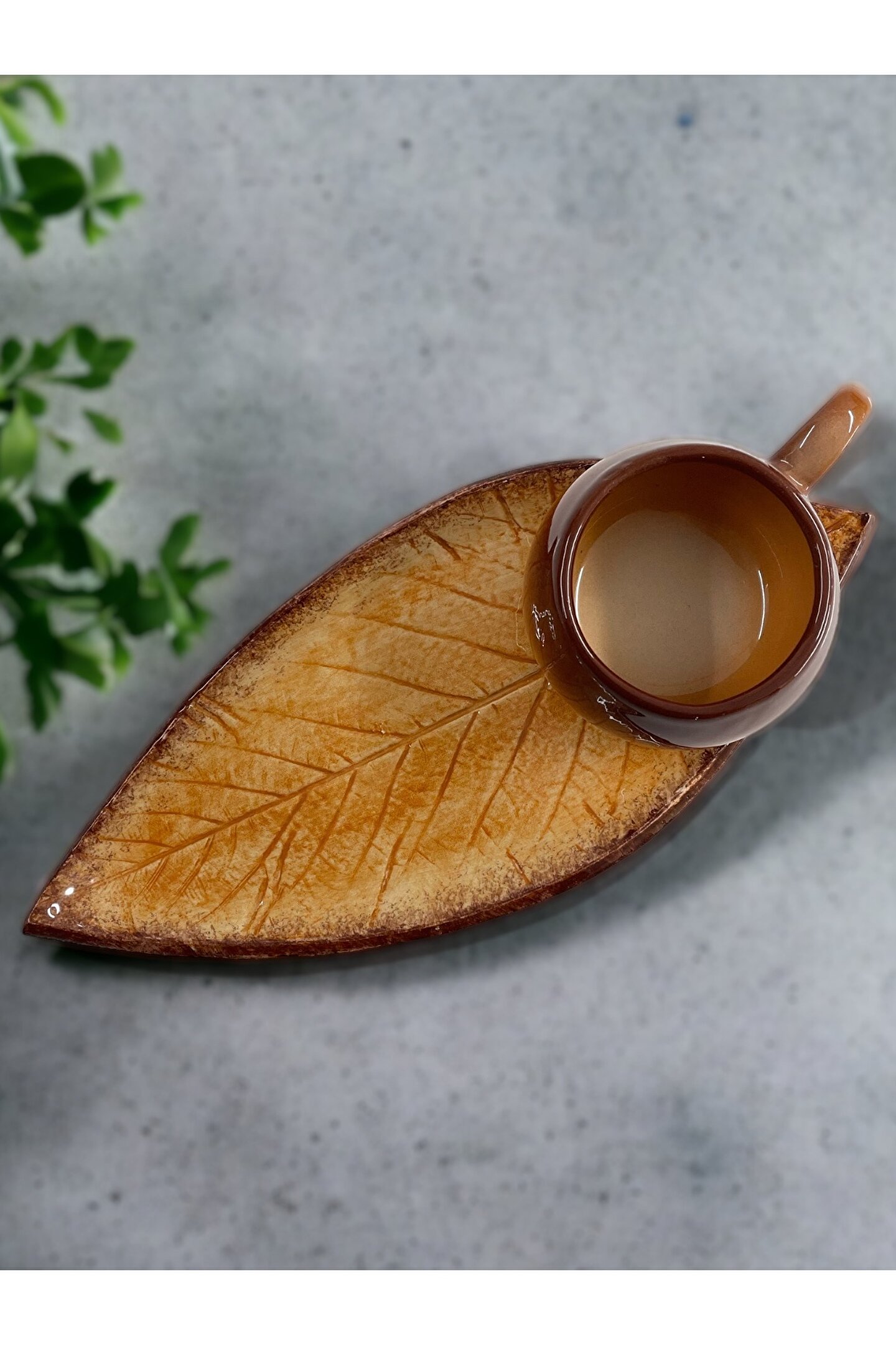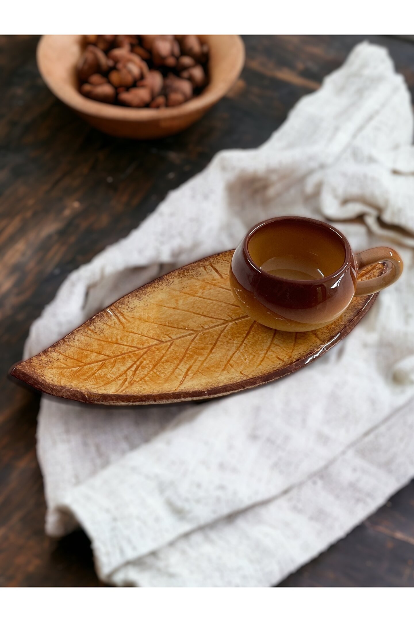 Artistic Quality Dekoratif Ceviz Yaprak Figürlü, Kahve Renklerinde Çay Kahve Fincanı Seti 1 Kişilik
