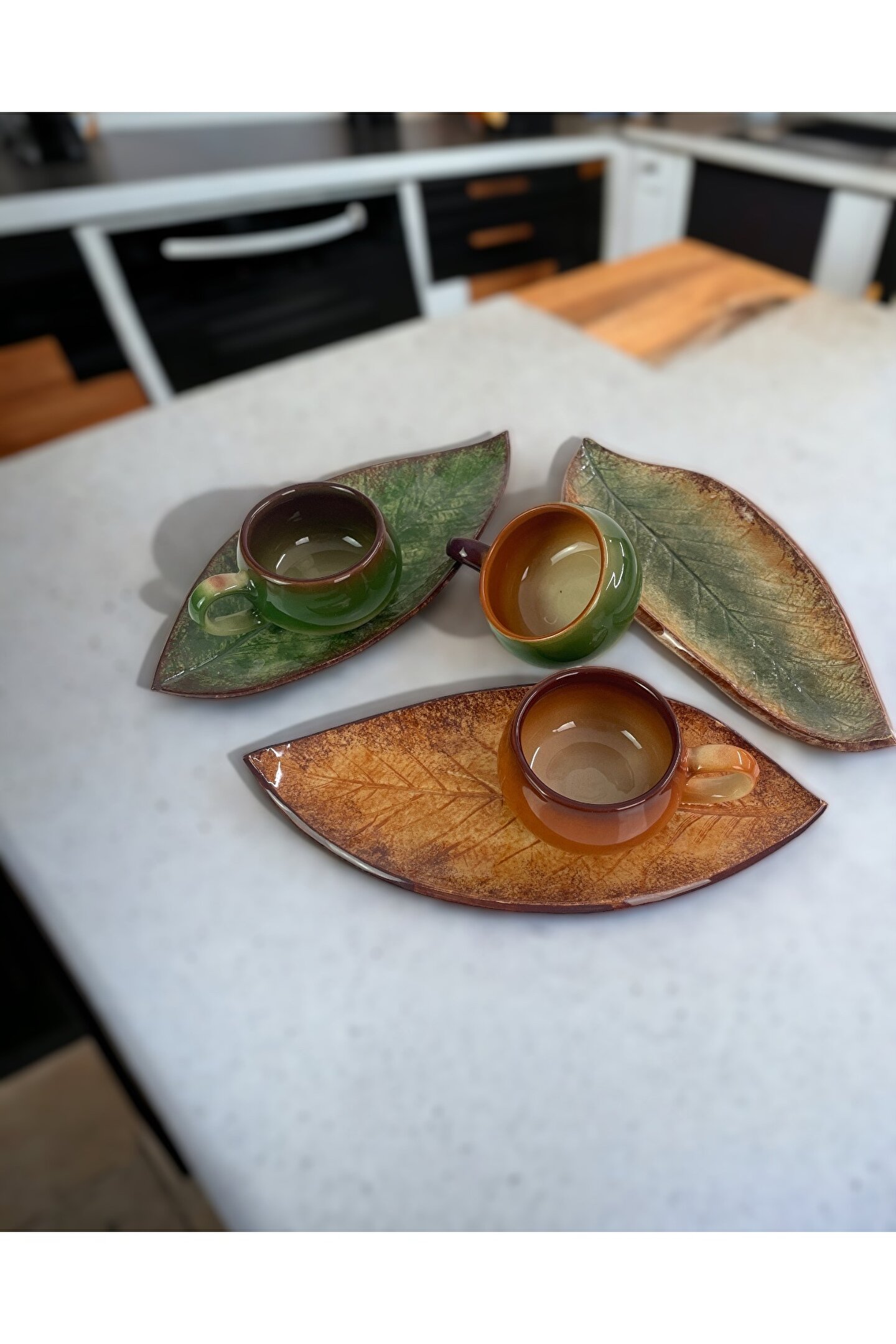 Artistic Quality Dekoratif Ceviz Yaprak Figürlü, Yeşil Ve Kahverengi Renklerinde Çay Kahve Fincanı Seti 3 Kişilik