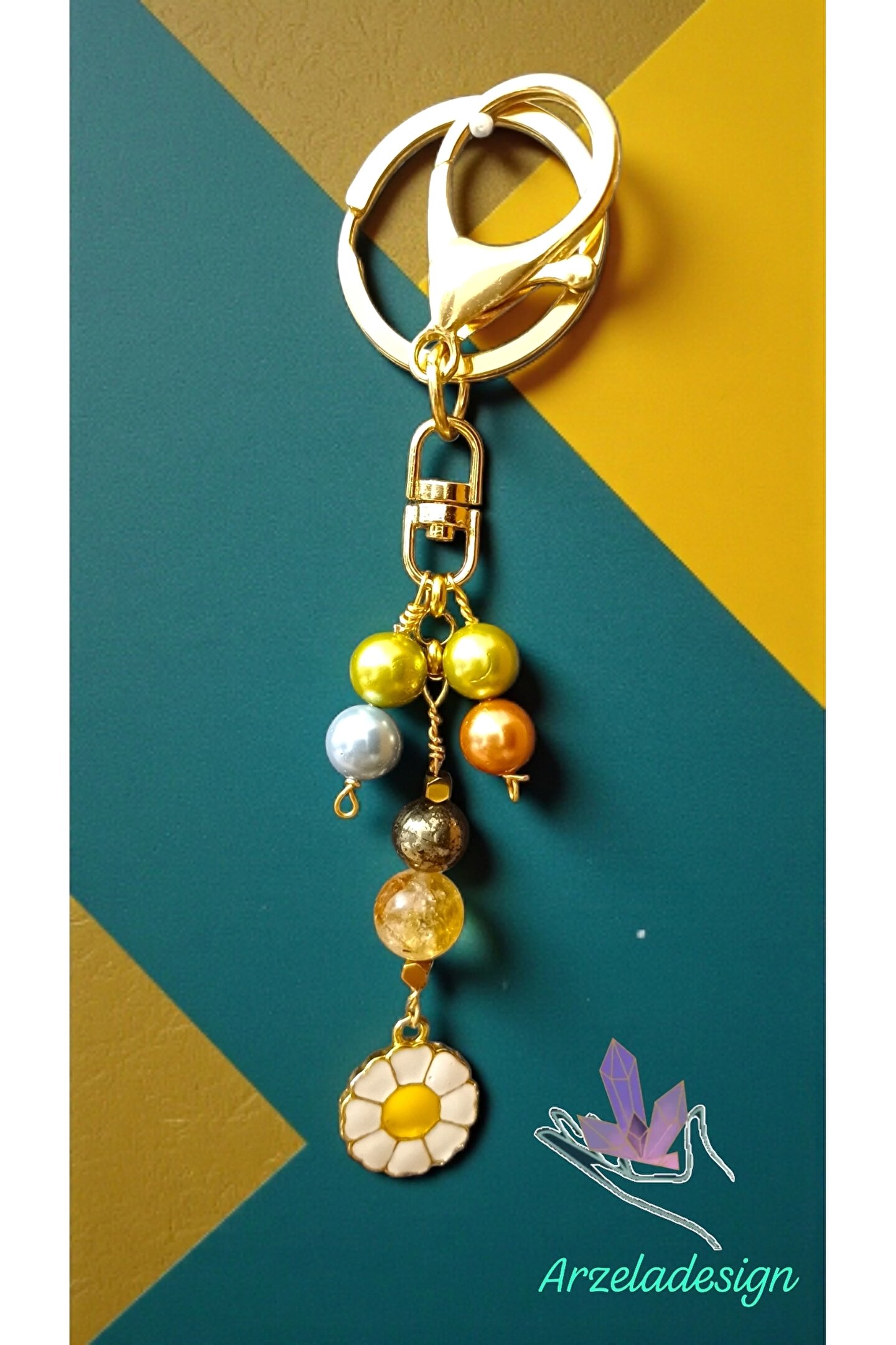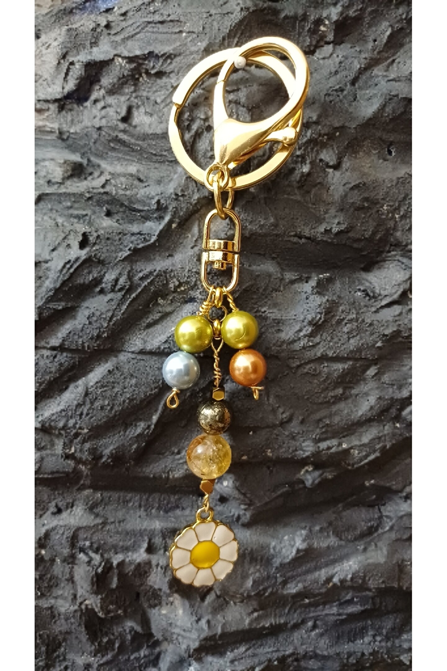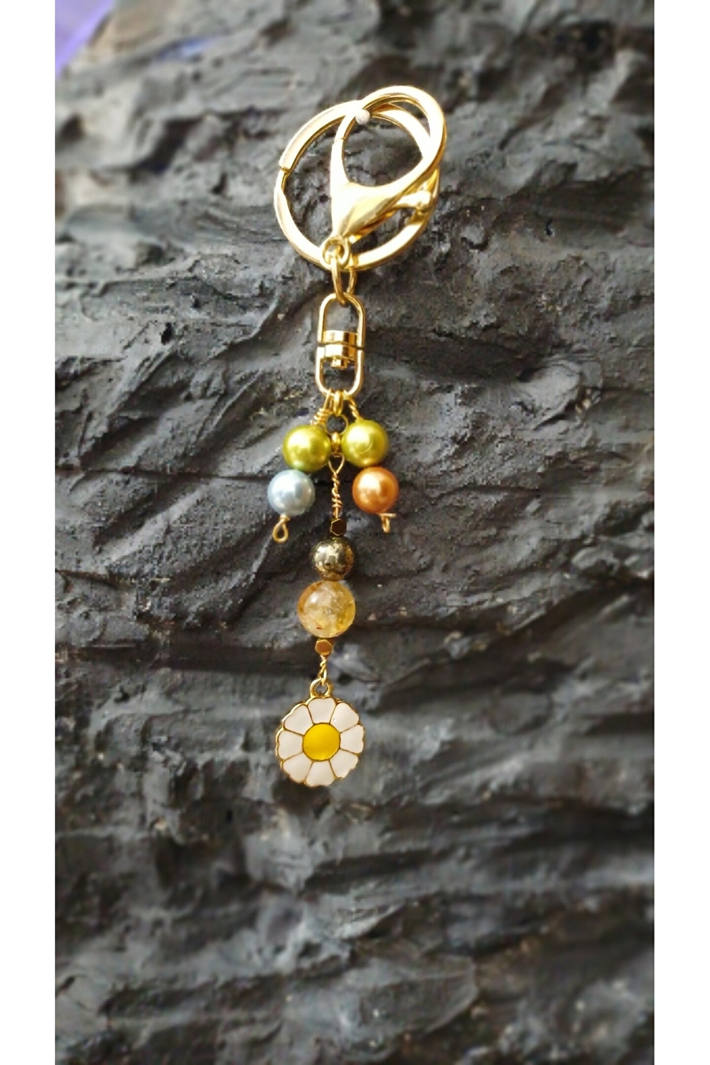 arzela Doğal Taş Anahtarlik Bolluk Berekt ve Koruma Anahtarlığı Sitrin Pirit ve İnci
