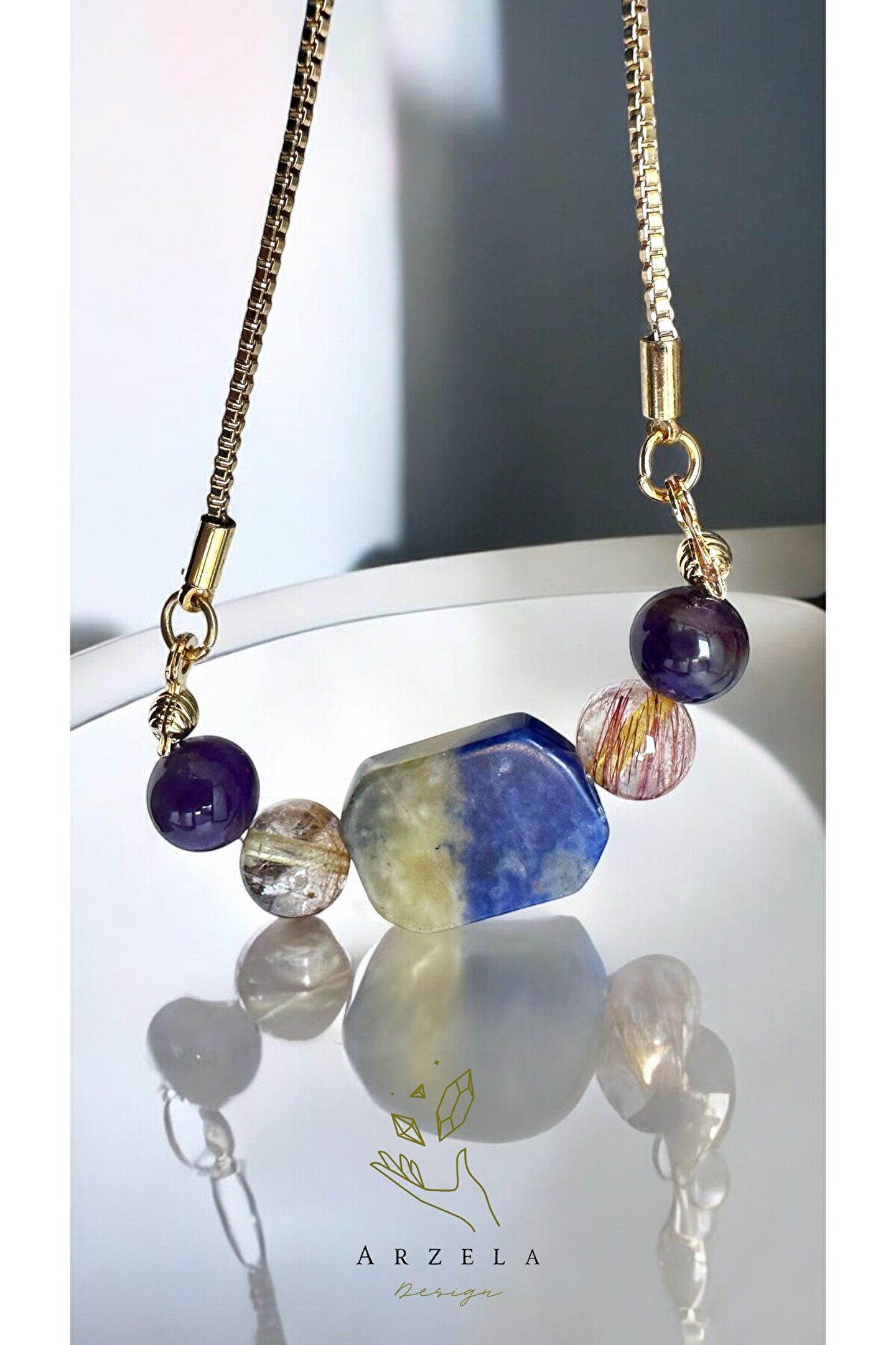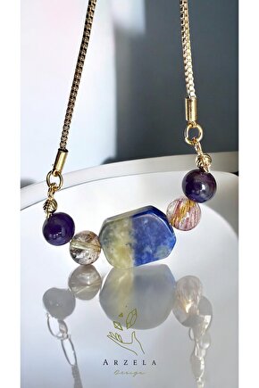 Büyük boy dikdörtgen sodalit Sıtrın Ametist taşları kullanıldı Taşların her birinin şifası bir araya gelince Yeni bir sifa,yuksek enerji ve koruma formülü oluşturdu Taşların özelliğine bakınız Kullanılan materyal altın kaplamadir Kimyasa ile temas ettirmeyiniz