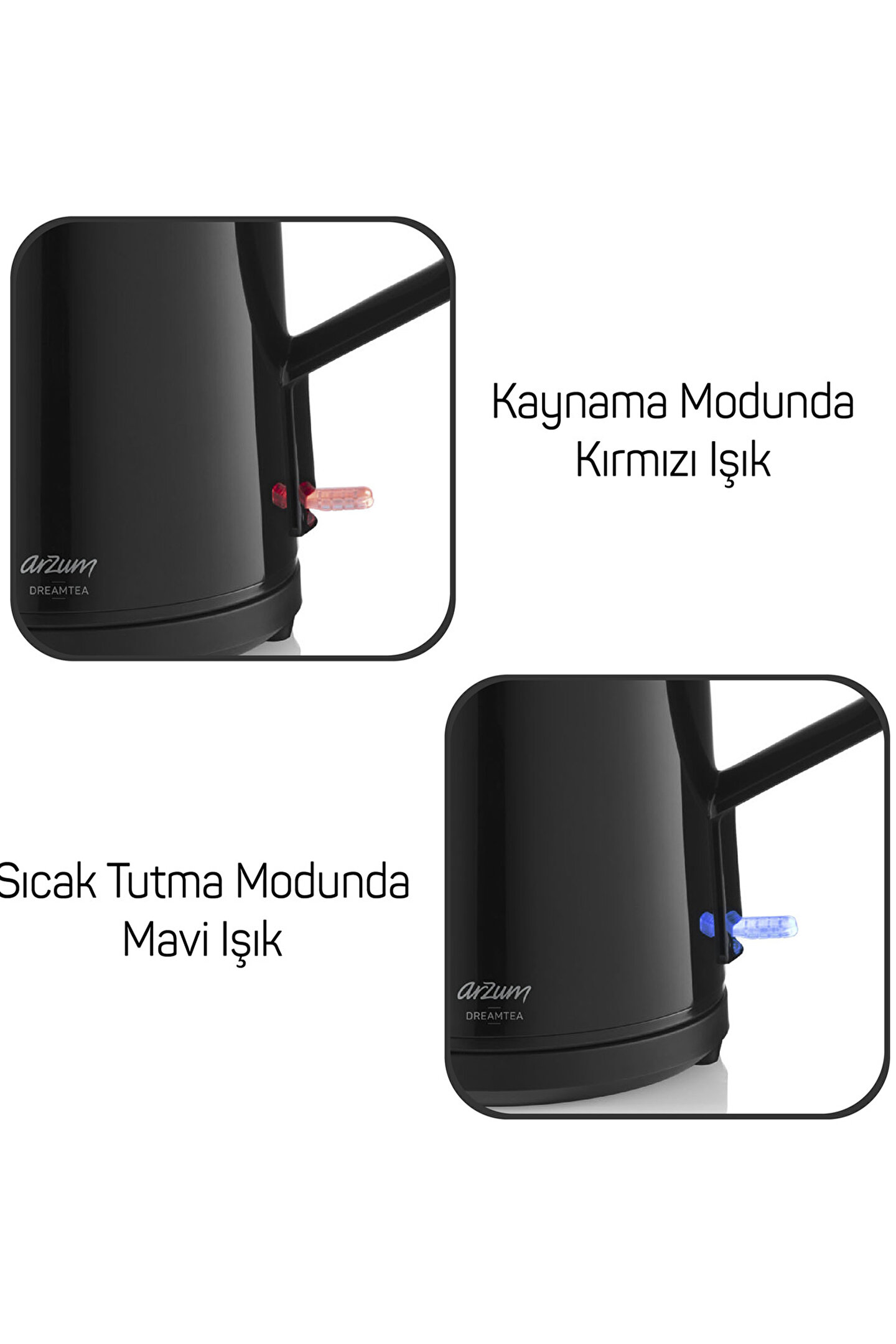 Arzum Dreamtea Çay Makinesi, 1,8 litre su ısıtıcısı ve 1 litre cam demlik kapasitesiyle geniş kullanım imkânı sunar.;Double Heat sistemi sayesinde çayı sürekli sıcak tutar ve soğuduğunda otomatik olarak yeniden ısıtır.;Şeffaf cam demlik, çayın kaynama durumunu görmenizi kolaylaştırır.;Işıklı tasarımı mutfakta dekoratif bir görünüm yaratır ve kullanımı daha keyifli hale getirir.;Kablosuz kullanım özelliği çay makinesinin kolay taşınmasını sağlar.;Plastik gövdesi hafiflik sunarak cihazı daha konforlu ve pratik hale getirir.;Otomatik kapanma özelliği maksimum sıcaklığa ulaşıldığında güvenli kullanım sağlar.;Çay makinesinde yer alan filtre kolayca çıkarılarak yıkama ve silkeleme yöntemiyle temizlenebilir.;Arzum Dreamtea AR3134 modeli elektrikli çalışma sistemiyle mutfaklarda pratiklik sağlar.