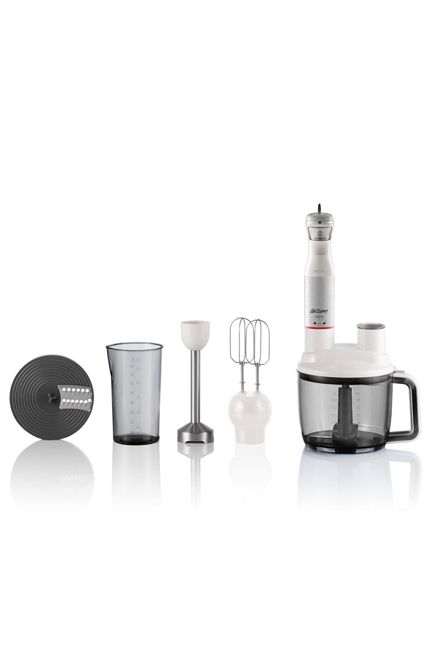 Resmi distribütör garantisi ile güvenli alışverişin keyfini çıkarın.;Arzum Forte Multi Blender Seti, ergonomik tasarımı ve 1000 W motor gücü sayesinde parçalama işlemini saniyeler içinde yapar. ;Tetikli çalıştırma düğmesi ile kullanım kolaylığı sunar ve çalıştırma kontrolünü tamamen size bırakır. ;Dekoratif paslanmaz çelik kaplaması ve iki renk seçeneği ile mutfağınıza şıklık katar.;Doğrama, çırpma, rendeleme, dilimleme ve çubuk blender fonksiyonlarıyla mutfaktaki işlerinizi kolaylaştırır. ;Sebze ve meyveleri kolayca ezerek püre ve ayran yapmaya uygun 800 ml kapasiteli özel ölçü kabı ile pratik kullanım sağlar. ;Paslanmaz çelik blender ayağını güvenle suyla yıkayarak kolayca temizleyebilirsiniz. ;Çift taraflı paslanmaz çelik bıçağı sayesinde et, sebze, soğan, meyve ve kuruyemişleri rahatça parçalar ve kıyabilirsiniz.