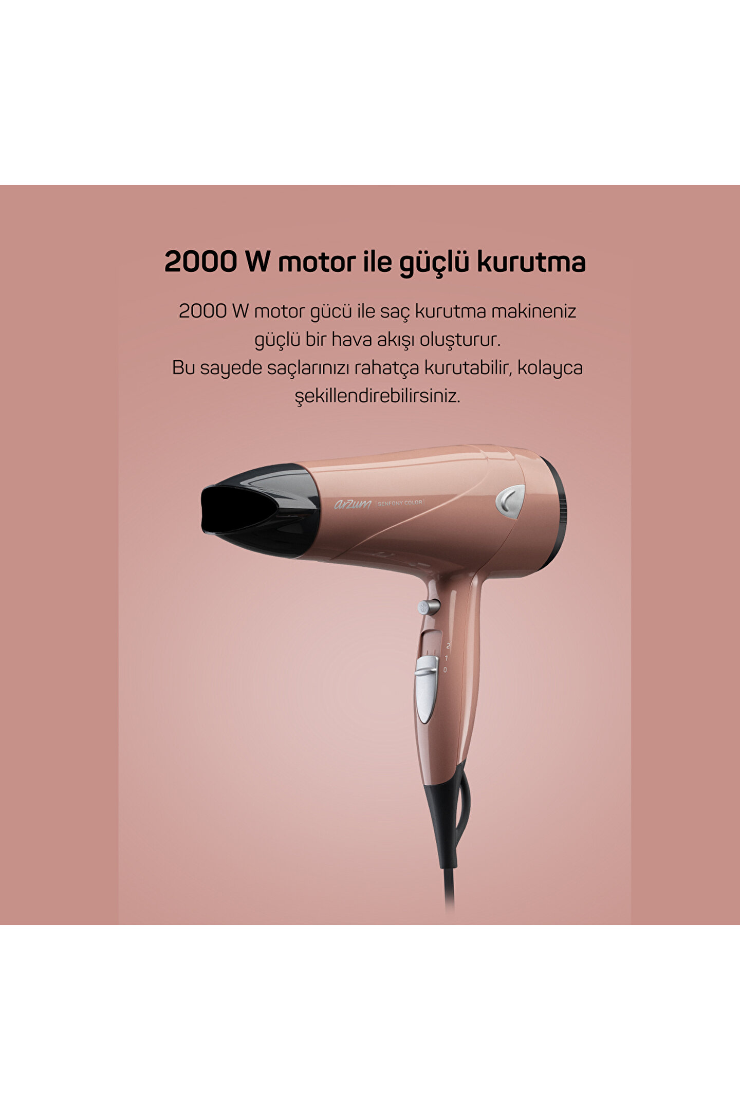 2 yıl resmi distribütör garantisi ile güvenle kullanın.;2000 Watt motor gücüyle güçlü bir hava akışı oluşturan Arzum Senfony Color Saç Kurutma Makinesi, saçlarınızı çok daha hızlı kurutmanızı ve kolayca şekillendirmenizi sağlar.;2 kademeli ısı ayarı ve 2 kademeli hız kontrolü farklı saç tiplerine uygun esnek kullanım imkanı sunar.;Soğuk hava üfleme özelliği, şekillendirdiğiniz saç modelini sabitleyerek uzun süre kalıcılık sağlar.;Form başlığı, maksimum hava üfleme basıncı ile saçlarınızı istediğiniz stile kolayca şekillendirmenize yardımcı olur.;Difüzör başlığı ise saç kurutma sırasında ekstra hacim kazandırır ve doğal dalgaları ön plana çıkarır.;Temizlenebilir filtre özelliği, cihazın bakımını pratik hale getirir ve uzun ömürlü kullanım sunar.;1,8 metrelik kablo uzunluğu ise rahat ve özgür kullanım imkanı sağlayarak saç kurutma deneyiminizi kolaylaştırır.