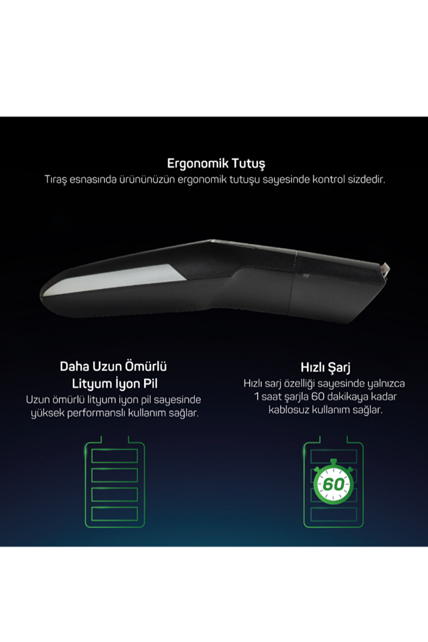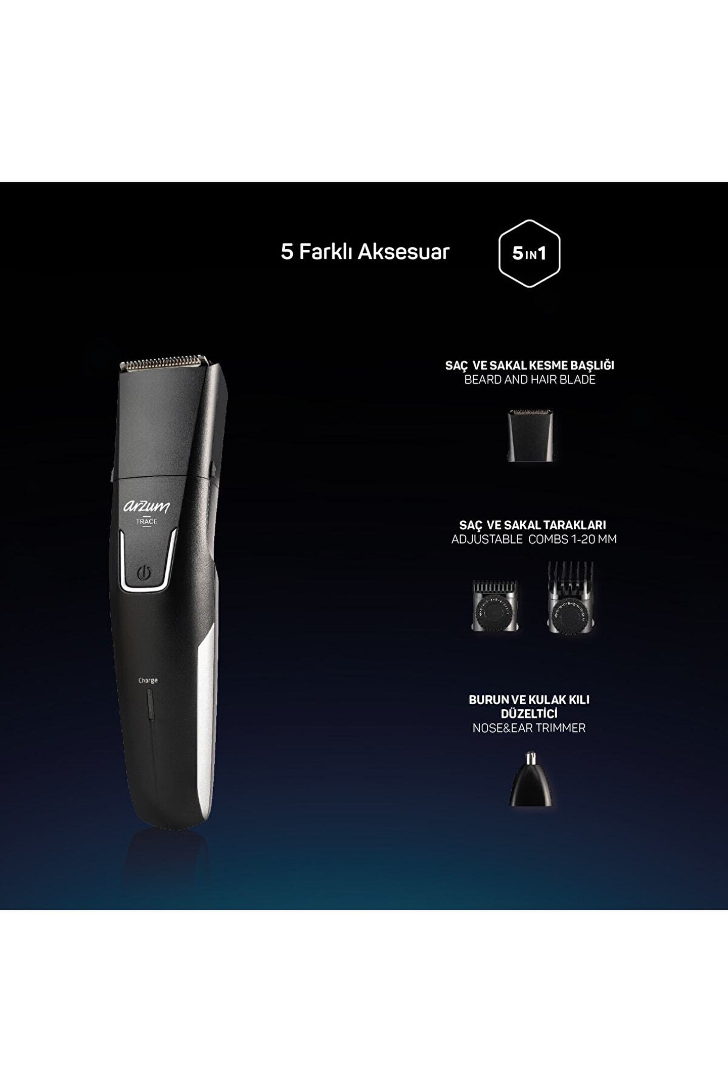Daha keskin ve uzun ömürlü paslanmaz çelik bıçakları sayesinde maksimum hassasiyet sunan bu saç ve sakal kesme makinesi, her kullanımda profesyonel sonuç verir. ;XL saç ve sakal kesme başlığı ile hızlı ve etkili bir tıraş deneyimi yaşatır.;1–20 mm aralığında, 0,5 mm hassasiyetle 40 farklı kesim ayarı sunar ve saçınızı ya da sakalınızı dilediğiniz uzunlukta şekillendirmenize imkan tanır. ;Burun ve kulak kılı düzelticisi istenmeyen tüyleri pratik şekilde temizlemenizi sağlar.;1 saat şarj ile 60 dakikaya kadar kablosuz kullanım sunar. ;Şarjlı veya kablolu çalışma özelliği sayesinde pil seviyesi düşük olsa bile güç kaynağına bağlı olarak kullanmaya devam edebilirsiniz.;Bıçak ve tarakları gövdeden kolayca çıkarabilir, musluk altında yıkayarak ya da temizleme fırçasıyla pratik şekilde temizleyebilirsiniz. ;Vücudun tüm bölgelerinde kullanım için tasarlanan set, 5 farklı aksesuar ile gelir: XL saç ve sakal kesme başlığı, iki ayarlanabilir saç ve sakal tarağı (1–10 mm / 11–20 mm), sakal düzeltici ve burun/kulak kılı düzeltici.