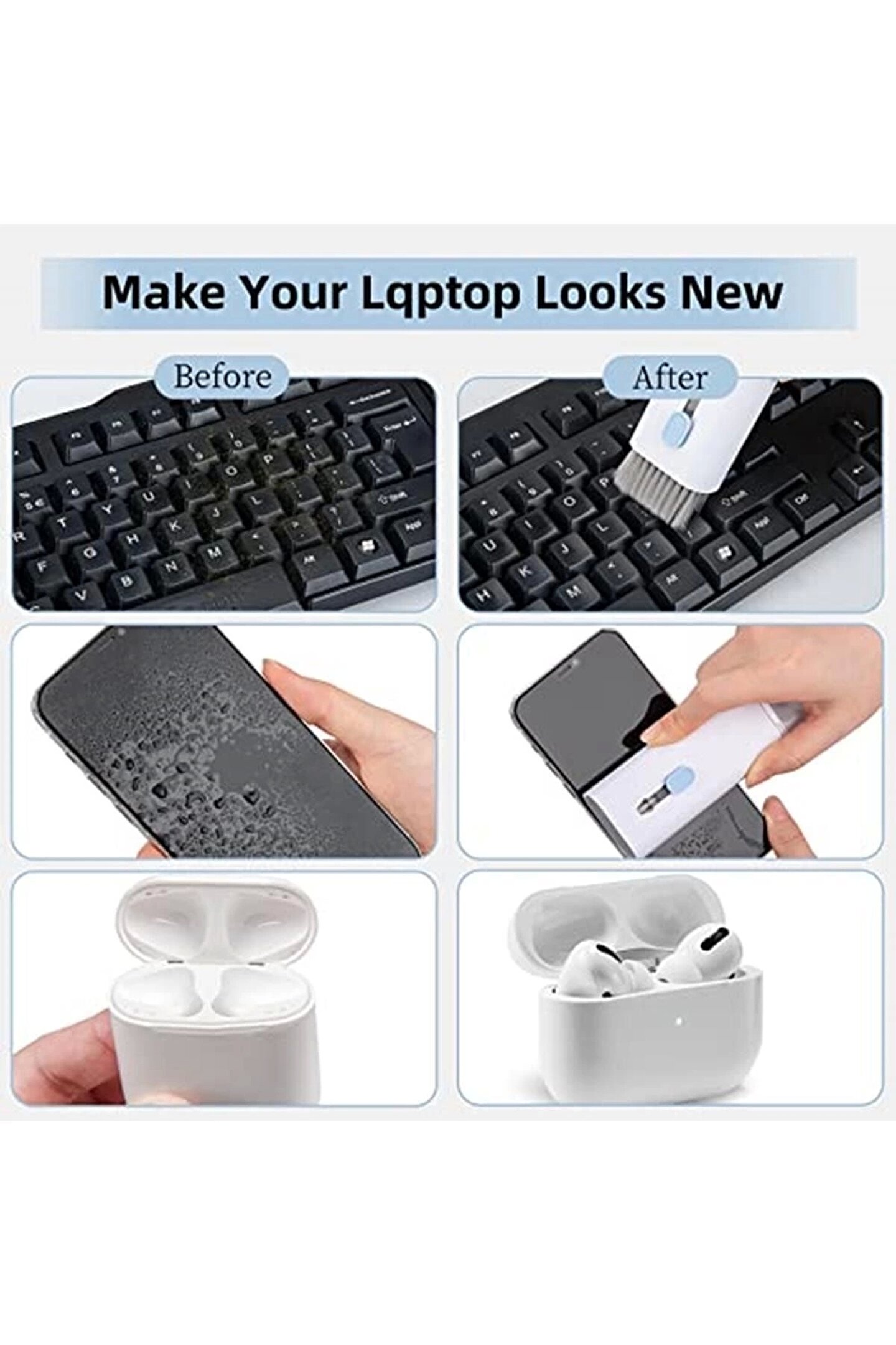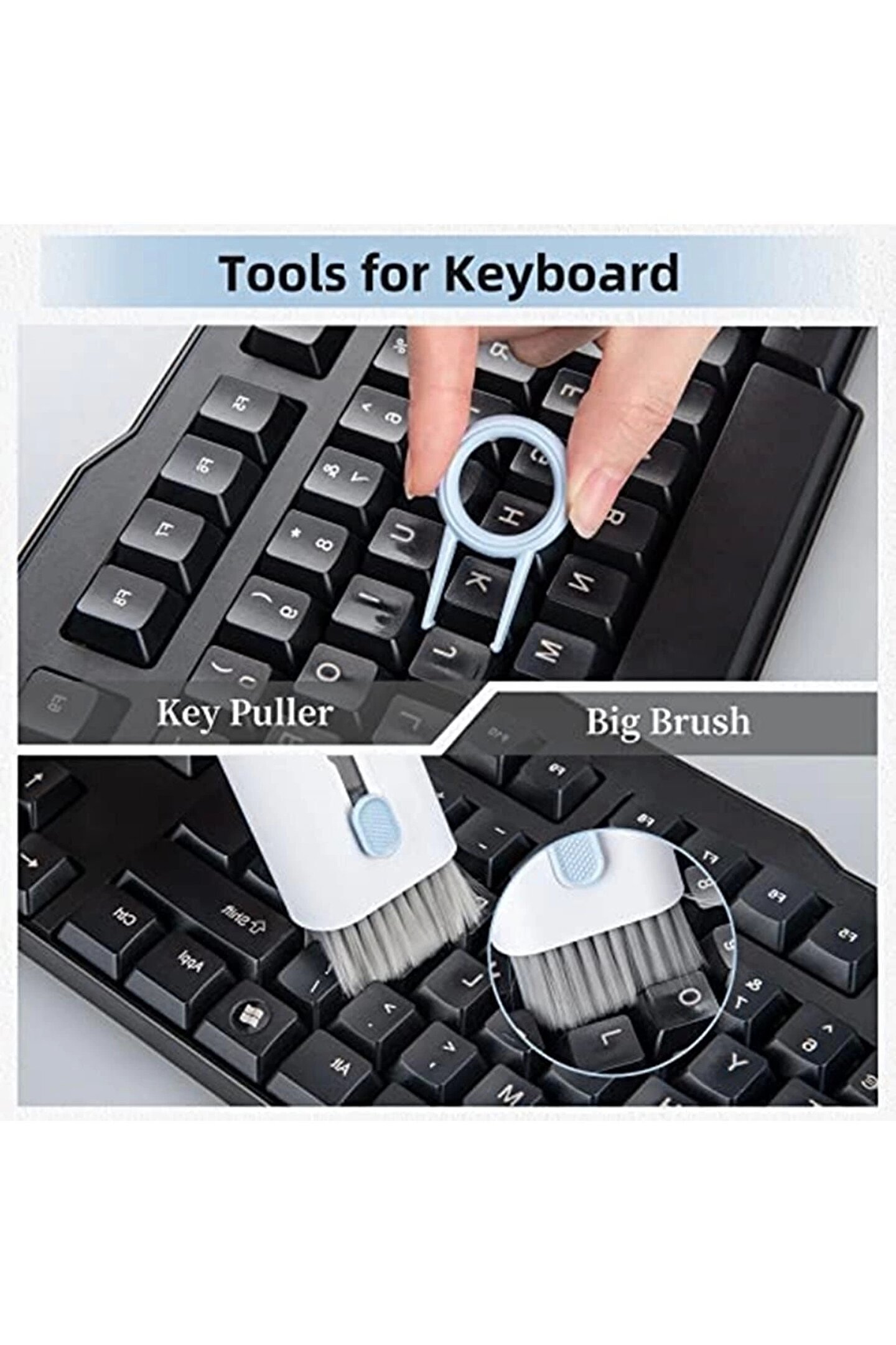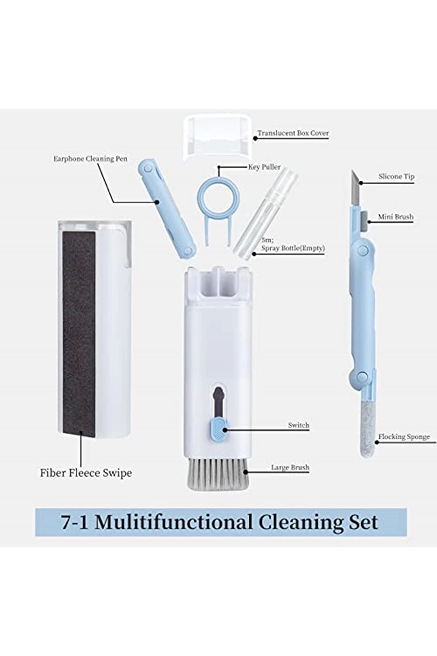 ?Çok fonksiyonlu temizleme fırçası?Klavye temizleme fırçası, çok fonksiyonlu kulaklık temizleyicisi, cep telefonları, oyun klavyeleri, kulaklık, dizüstü bilgisayar ekranları, kameralar, dijital saatler, işitme cihazları, teleskop ve diğer elektronik ve optik cihazlar için uygundur.; ?2022 yılının özel temizlik aracı?7'si 1 arada çok fonksiyonlu temizleme aleti seti, elektronik cihazlar için temizlik aleti, kapsamlı fonksiyonlar, mekanik klavyeler için tuş sökme aparatı, katlanabilir temizleme kalemi, temizleme şişesi, naylon fırça, flanel sünger.; Her zaman sahip olmak istediğiniz, küçük hepsi bir arada temizleme cihazı! Elektronik temizliği için uygundur ve çok çeşitli temizlik ihtiyaçlarını karşılar.; ?Tekrar kullanılabilir? Yeni elektronik cihazlarınızın bakımını düzenli olarak yaparak, kullanım ömürlerini uzatabilirsiniz.; ? Katlanabilir temizleme kalemi, silikon uç, bölme ve aralıklardaki kirleri gidermek içindir.; ?Tuş sökme aparatı mekanik oyun klavyeleri için kullanılabilir, fırça ise klavyenin içindeki kirleri iyice temizlemek için.; ? Parmak izi, yağ lekeleri ve toz için arka tarafındaki parlatma başlığını kullanın.; ?Kompakt ve saklaması kolay? Temizleme seti kare şeklinde ve avuç içi boyutundadır, böylece her zaman, her yerde yanınızda taşıyabilirsiniz.; Saklama kutusu kolay düzenleme sağlar.; ?En iyi hediye?Temizleme seti ile artık yıllar içinde toz biriken küçük şeylere müdahale edilebilir; bu eşyalar artık iyice temizlenebilir.; Cihazlarınıza yeni bir görünüm kazandıracak ve aynı zamanda sizi mutlu edecek harika bir buluş.; Arkadaşlarınız, aileniz ve iş arkadaşlarınız için hediye olarak da düşünebilir ve böylece mutluluğunuzu onlarla paylaşabilirsiniz.;