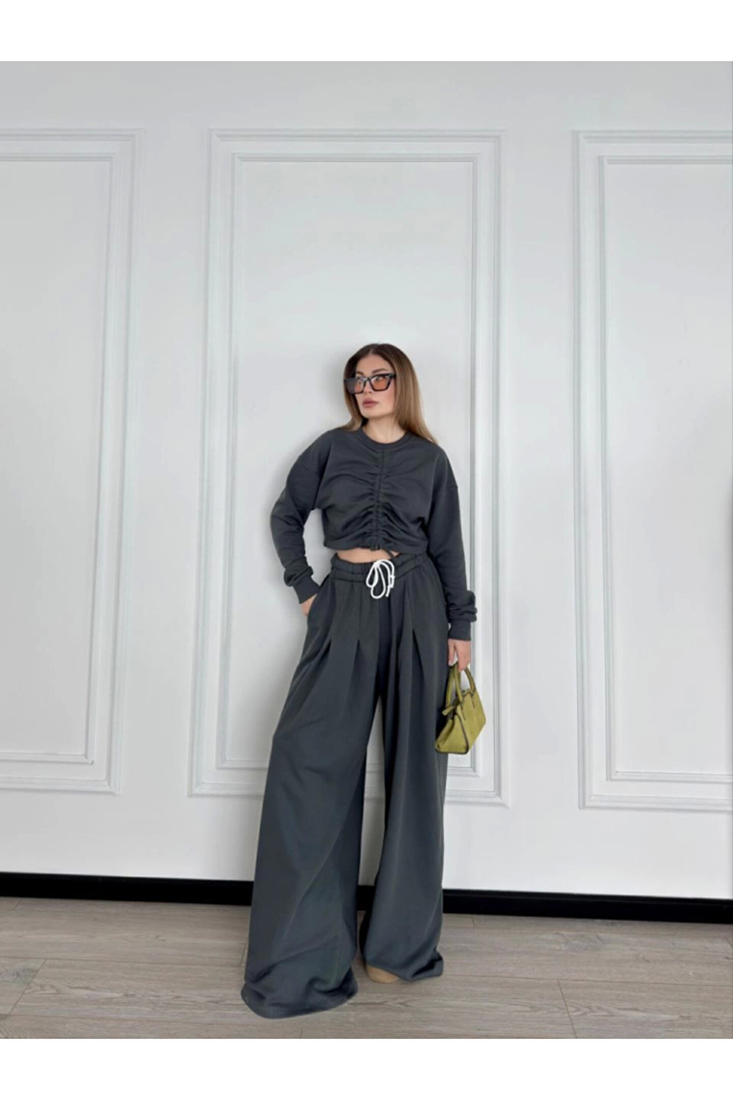 ASFSTORE eyesof Uzun Kollu Önü İp Büzgülü Crop Ve Pantolon İkili Takım - Antrasit