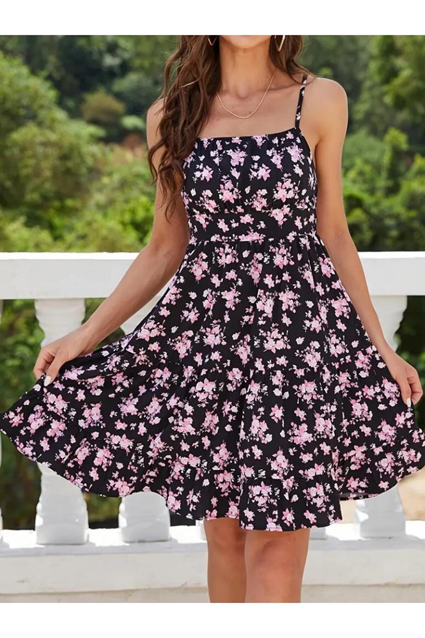 ASH GİYİM Kadın Askılı çiçek Desenli Süprem Mini Elbise