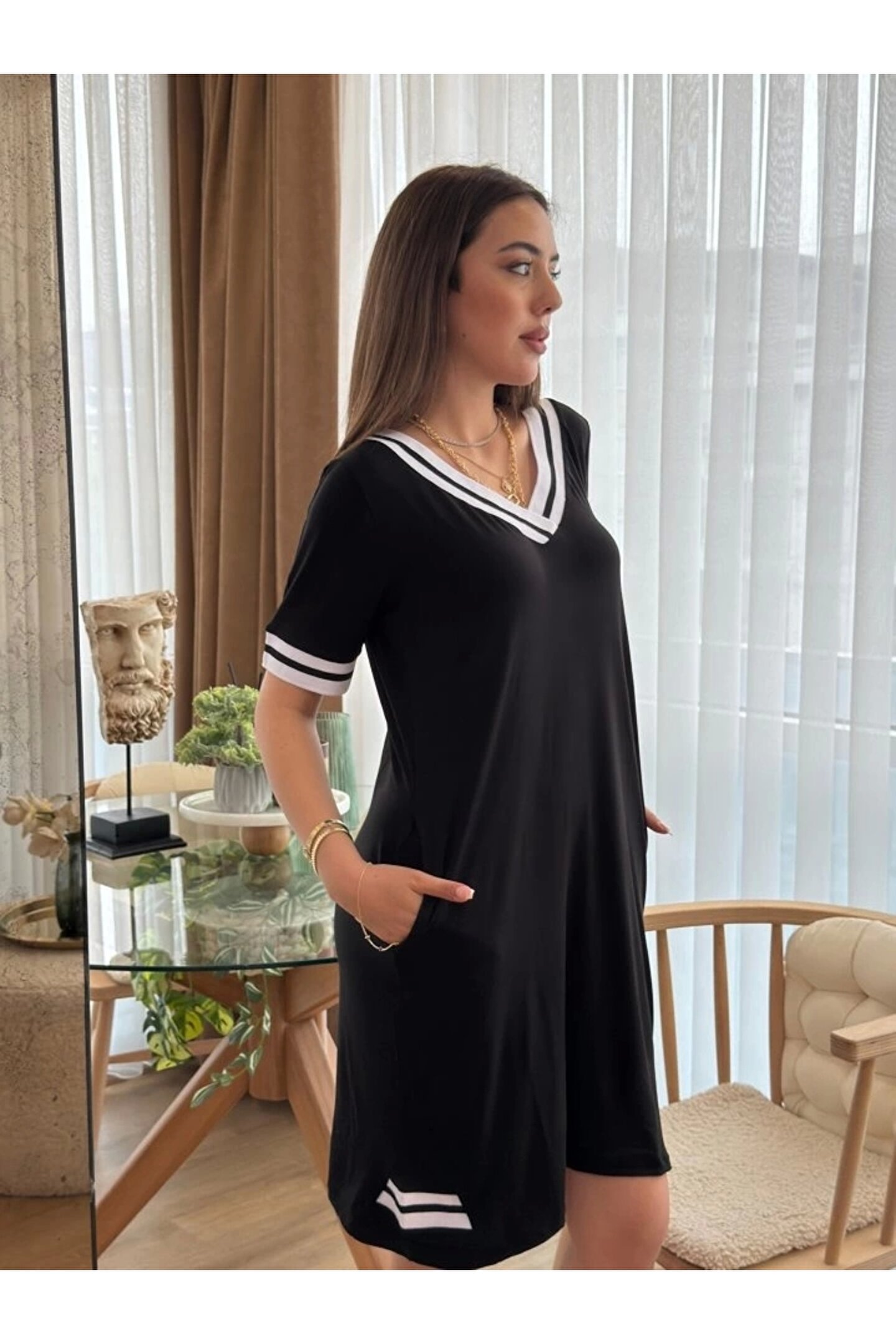 ASH GİYİM Kadın Kısa Kollu V Yaka Ribana Detaylı Cepli Dizüstü Viskon Elbise
