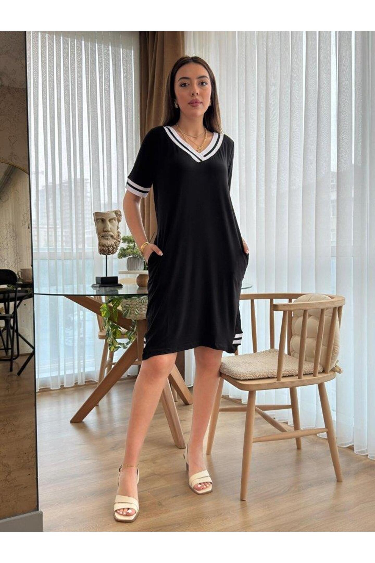 ASH GİYİM Kadın Kısa Kollu V Yaka Ribana Detaylı Cepli Dizüstü Viskon Elbise