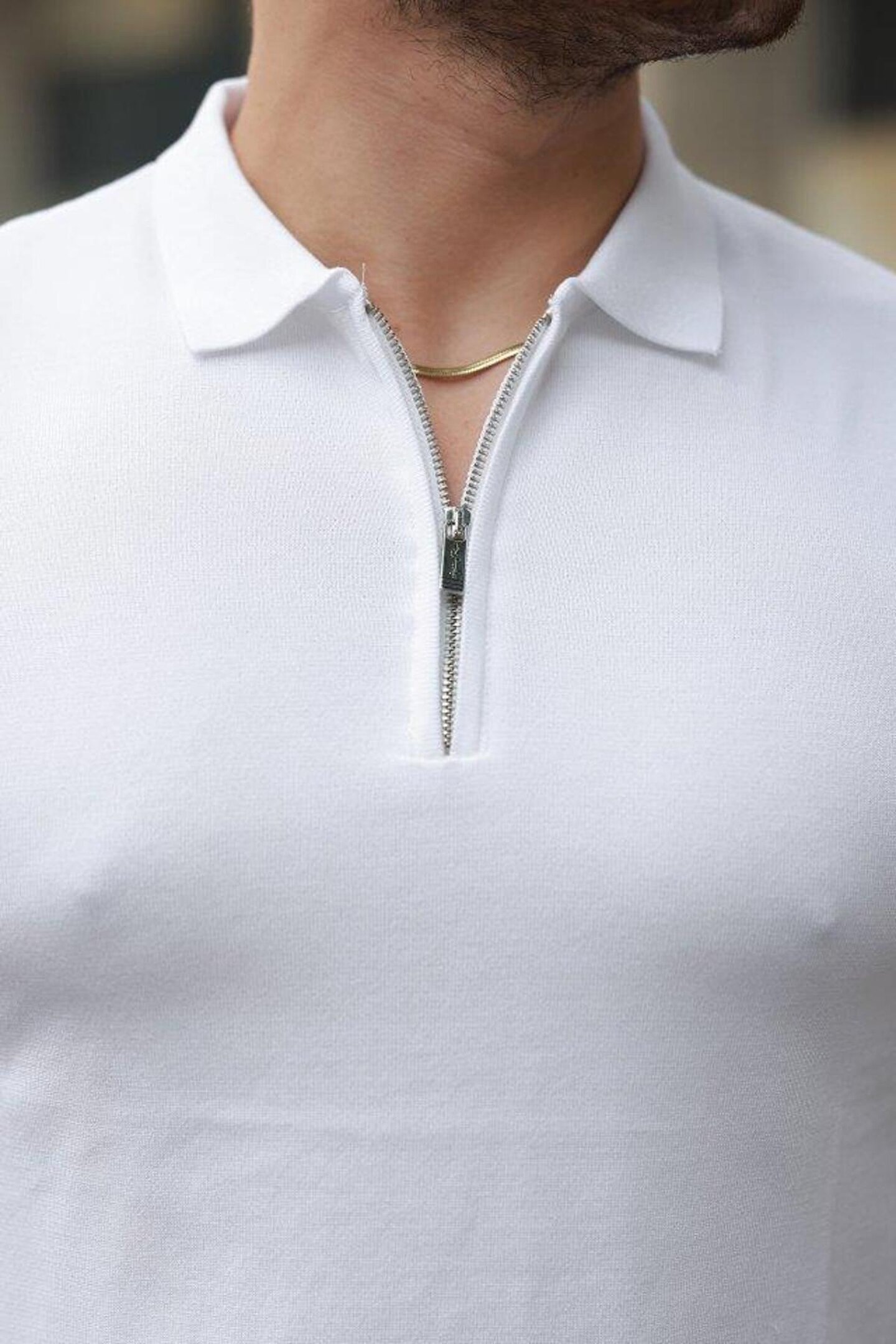 Erkek Fermuar Yakalı Kolları Desenli Kısa Kollu Tişört