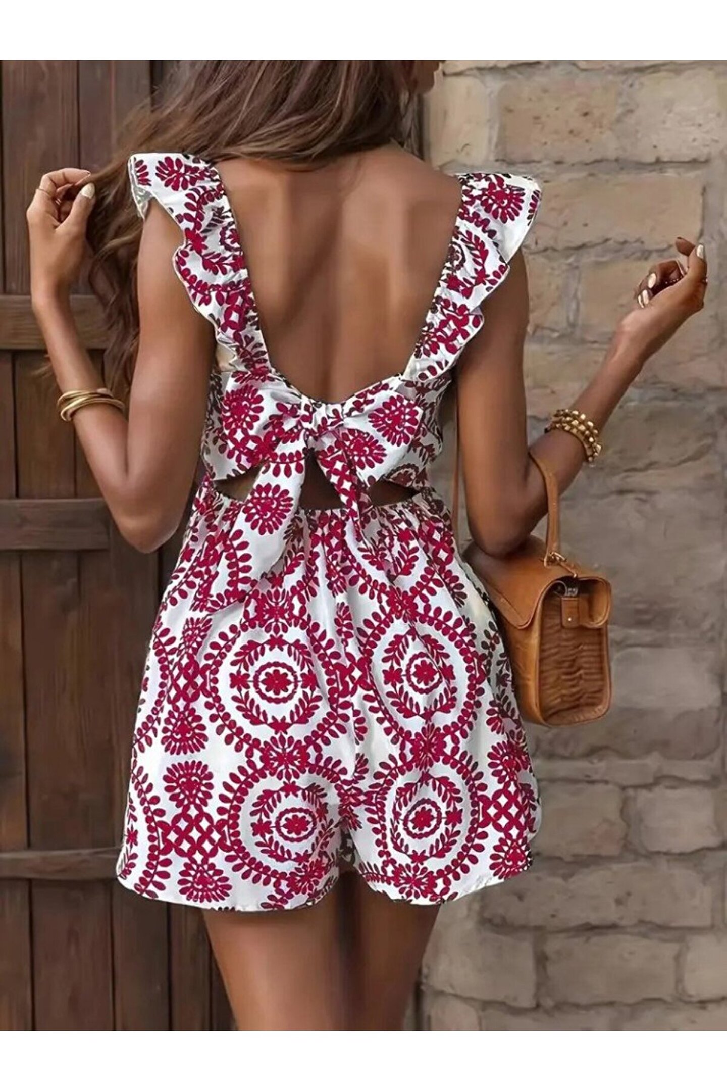 Kadın Askılı Kare Yakalı Arkadan Bağcıklı Desenli Keten Tulum