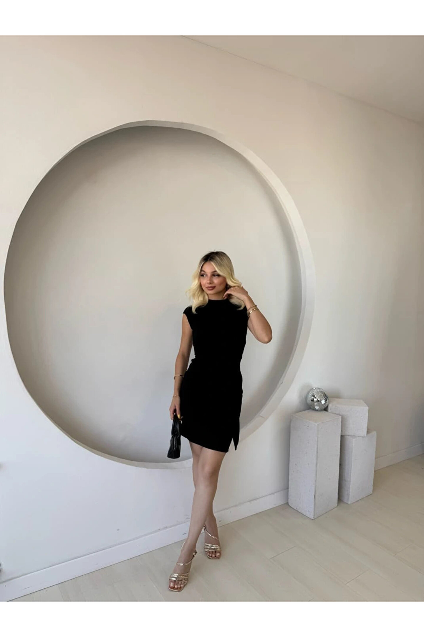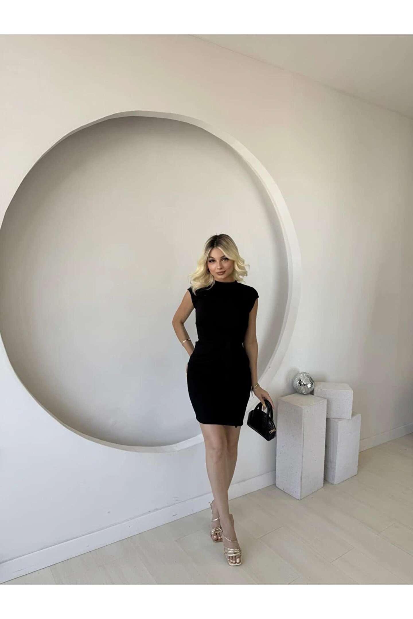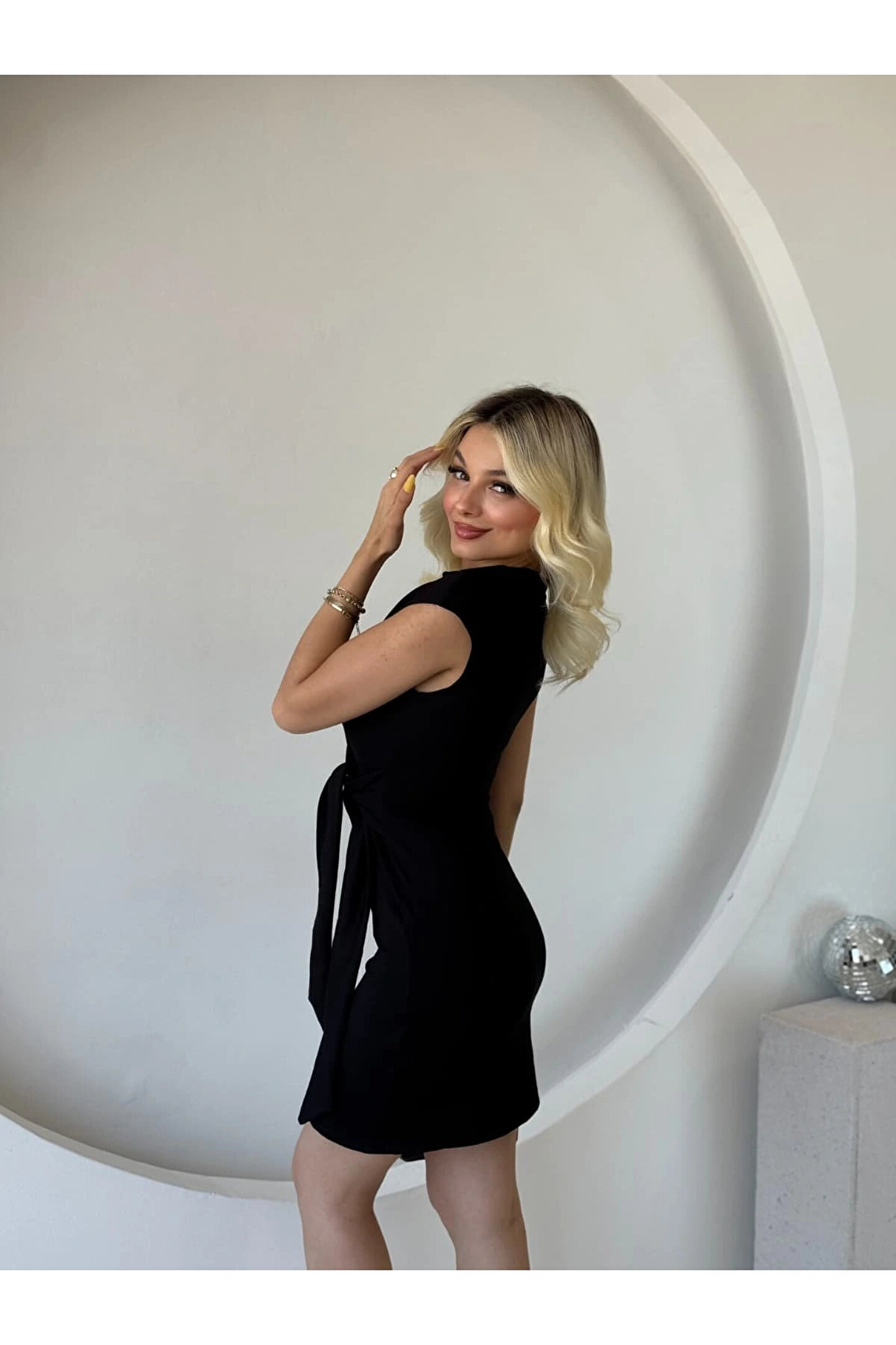 Kadın Kısa Kap Kollu Bisiklet Yaka Belden Bağlamalı Modal Mini Elbise