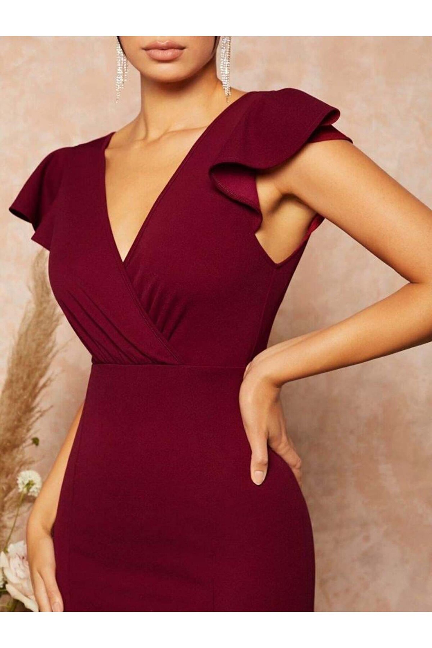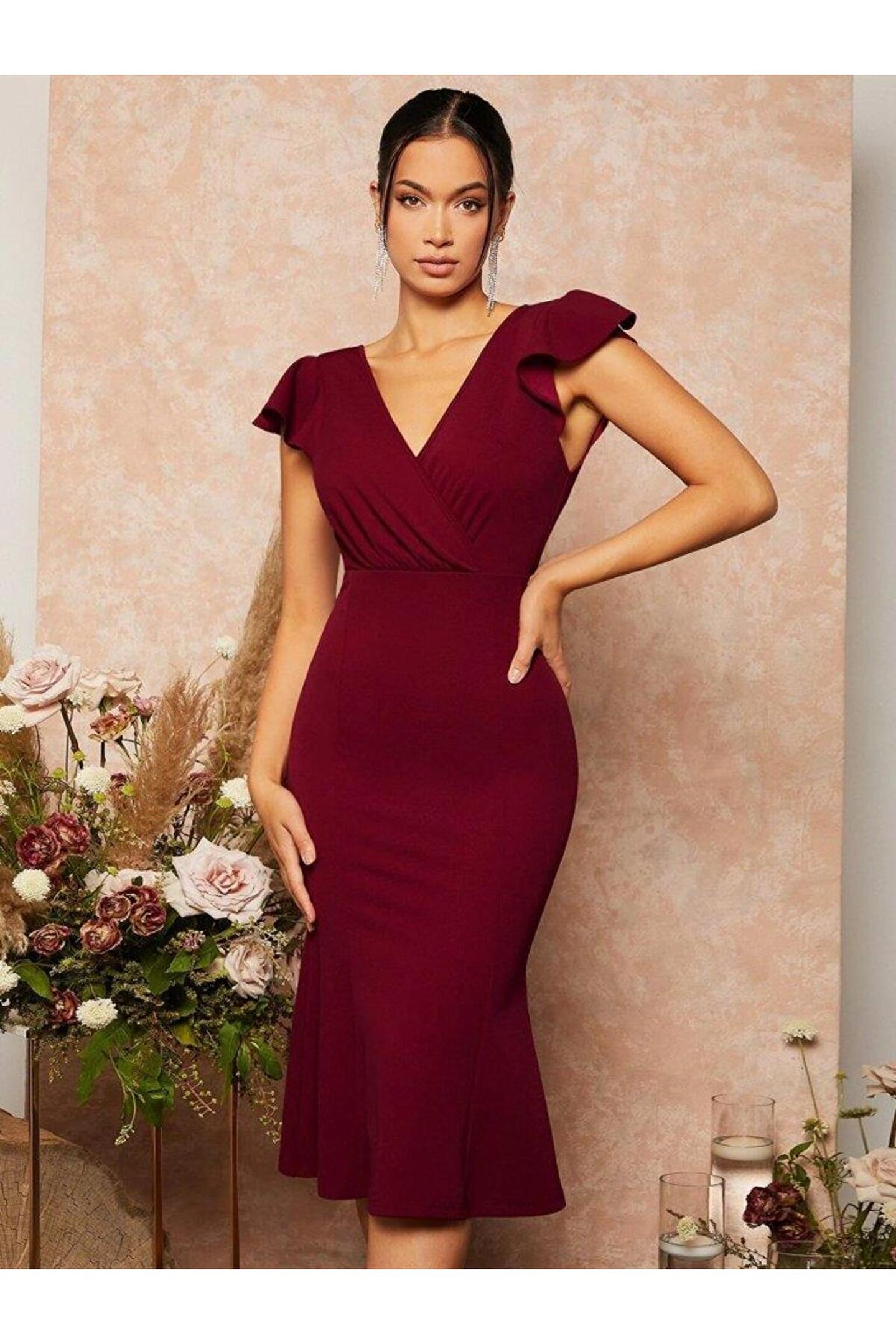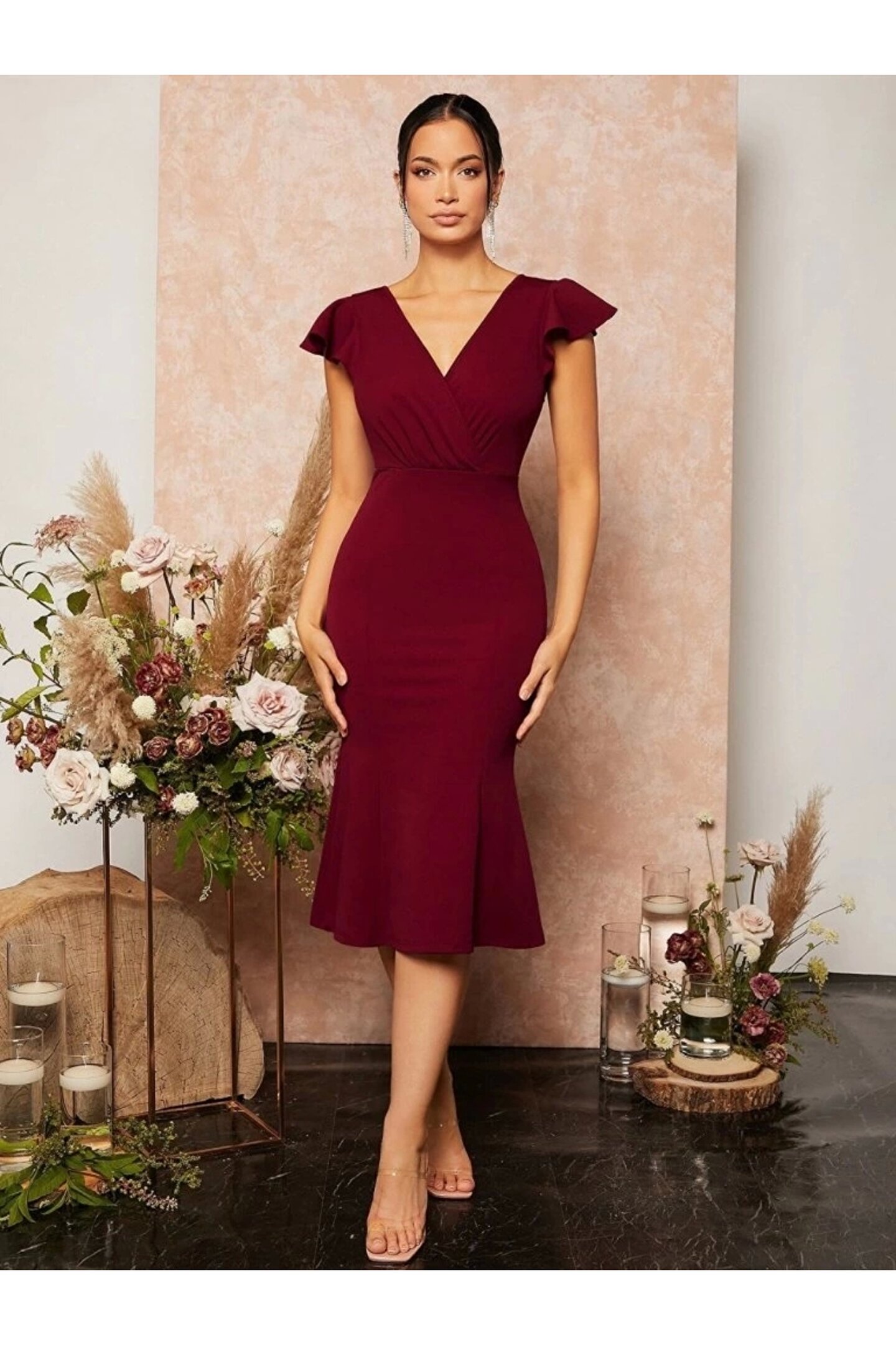 Kadın Kısa Kelebek Kollu Kruvaze Yaka Ithal Krep Midi Elbise