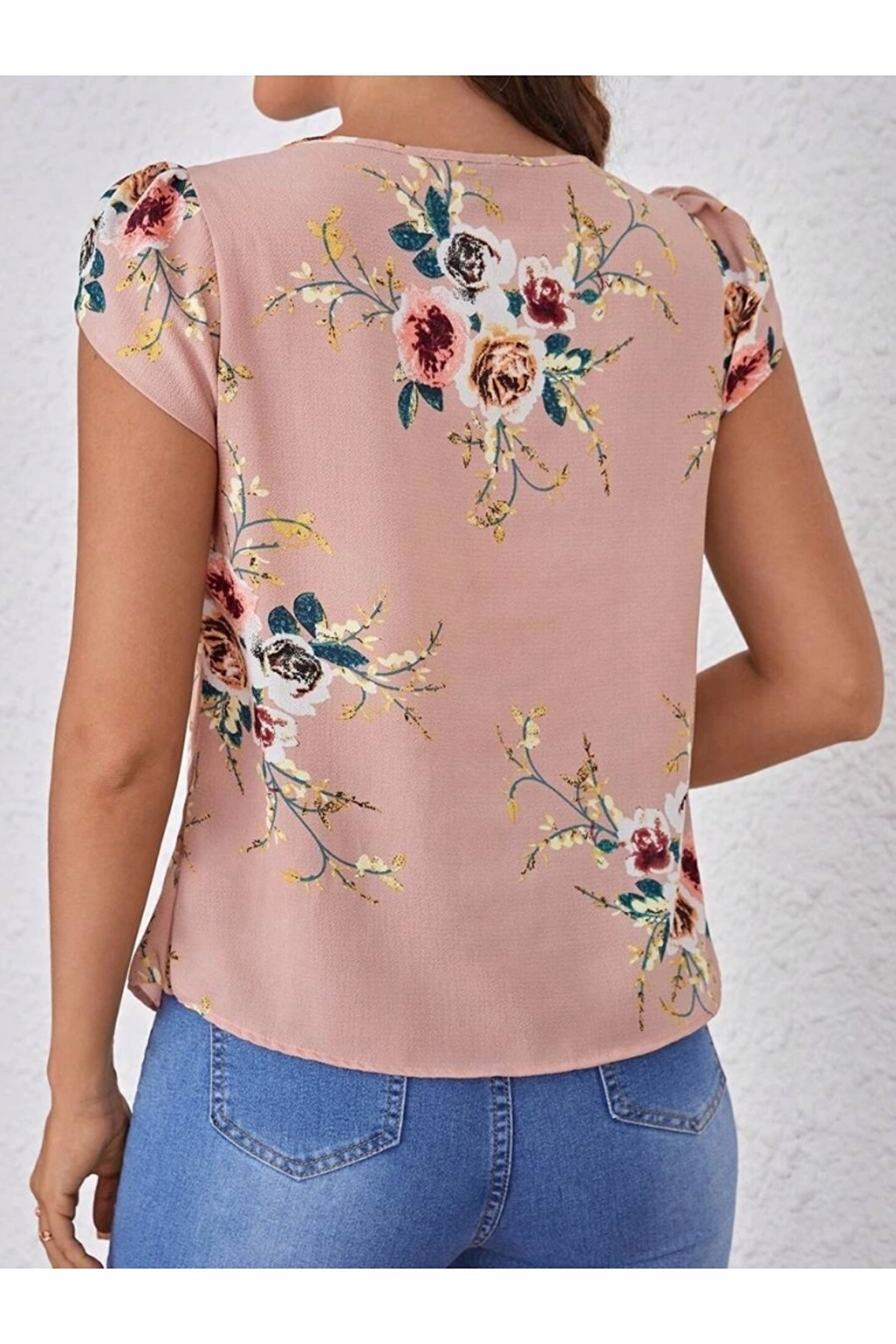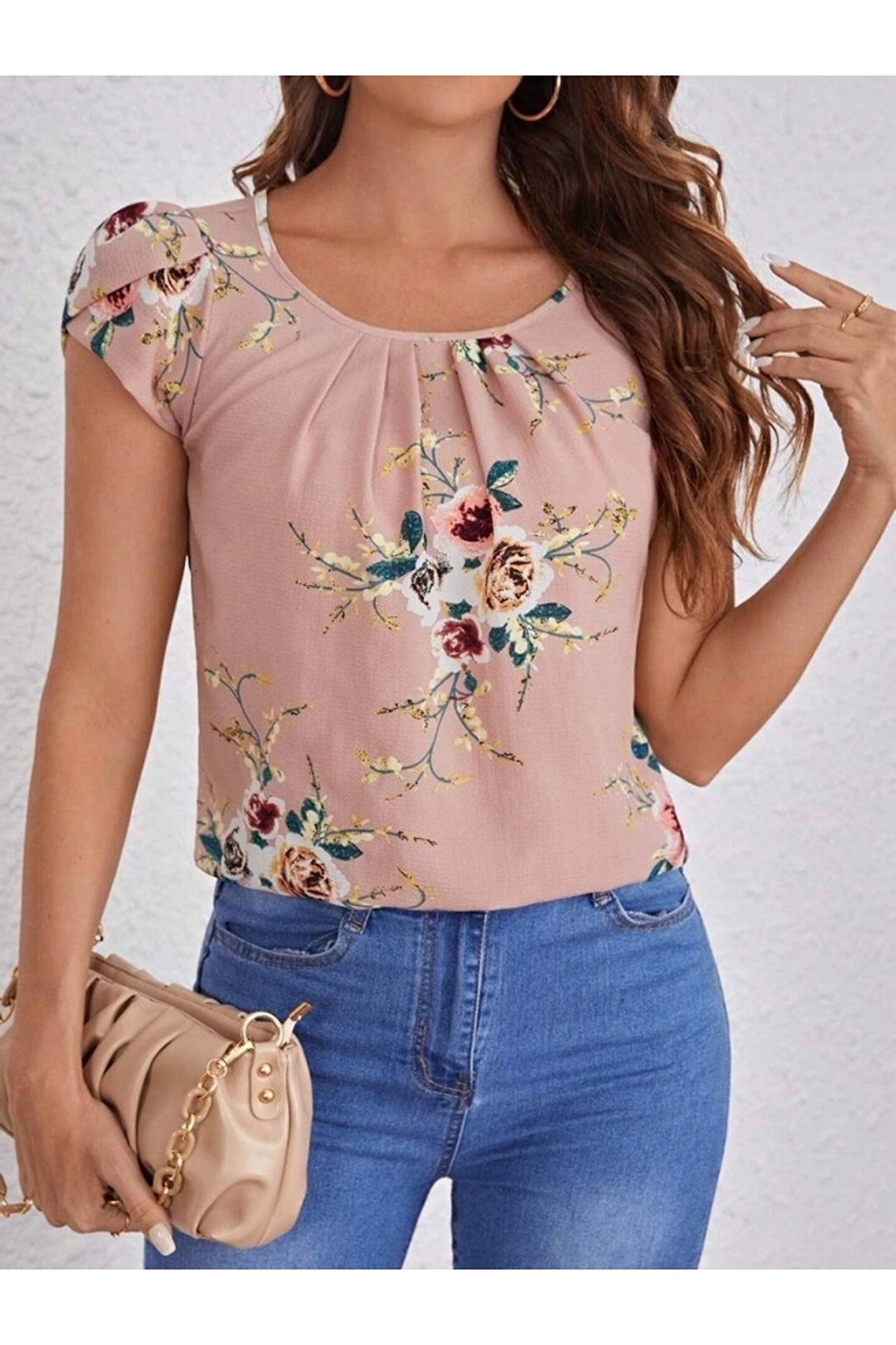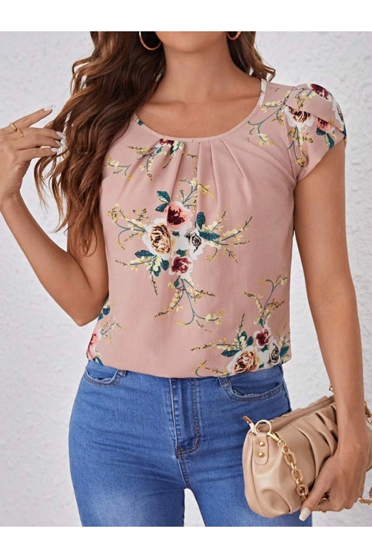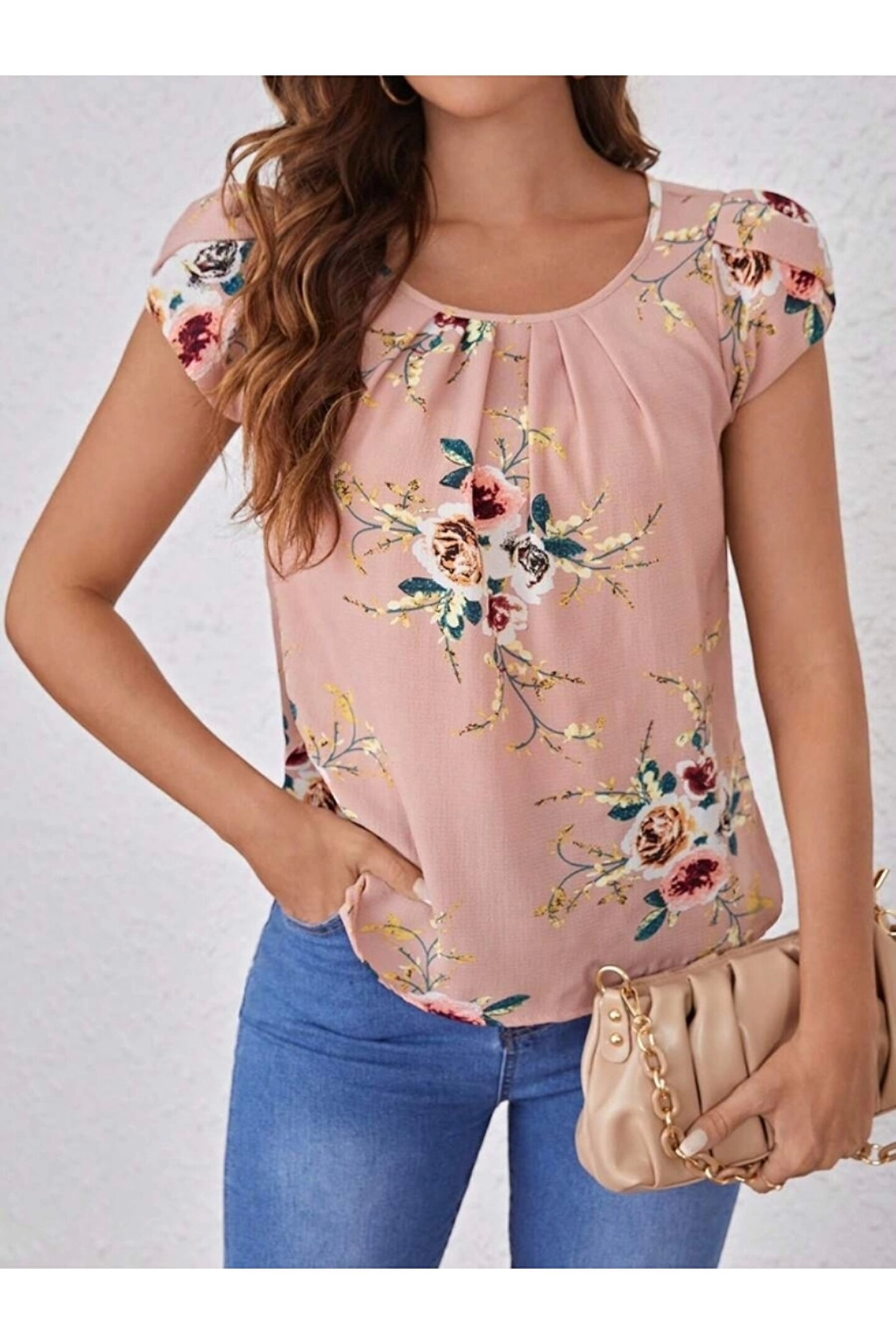 Kadın Kısa Kollu Bisiklet Yaka çiçek Baskılı Süprem Bluz