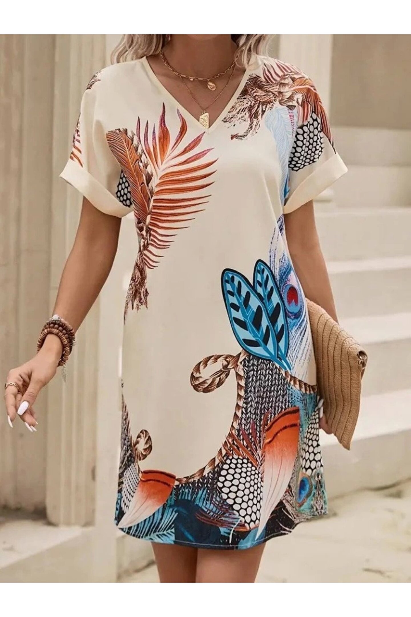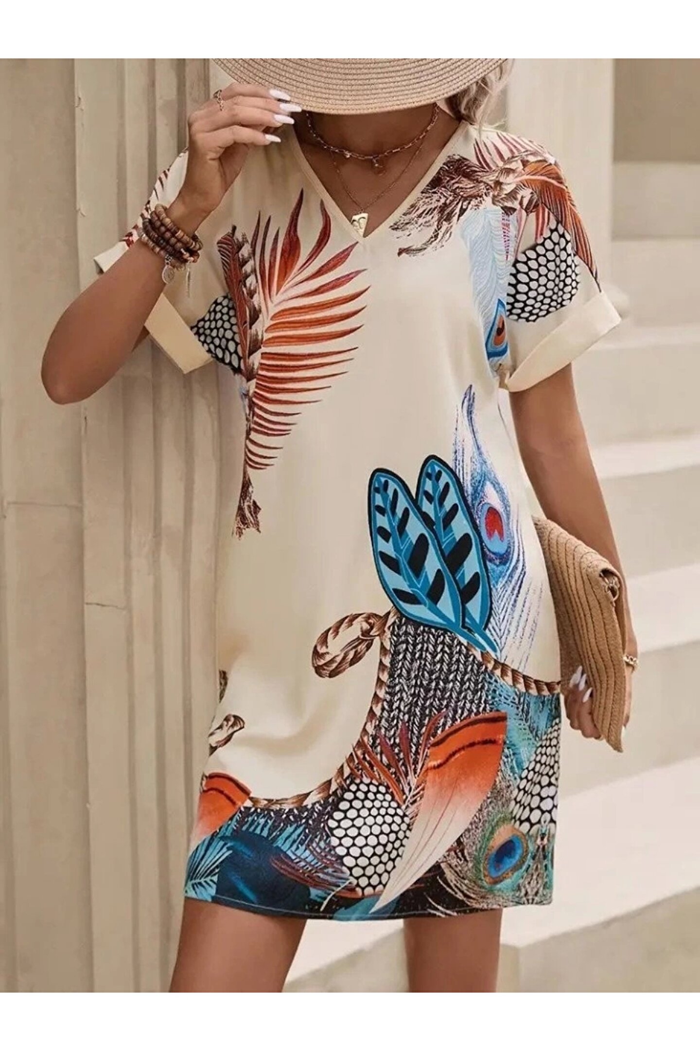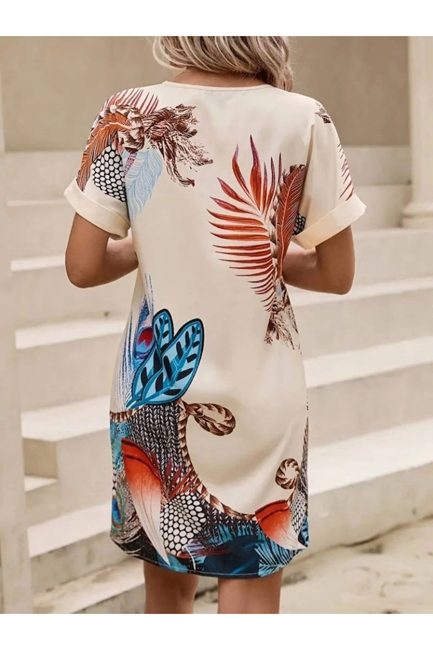 Kadın Kısa Kollu V Yakalı Desenli Mini Atlas Elbise