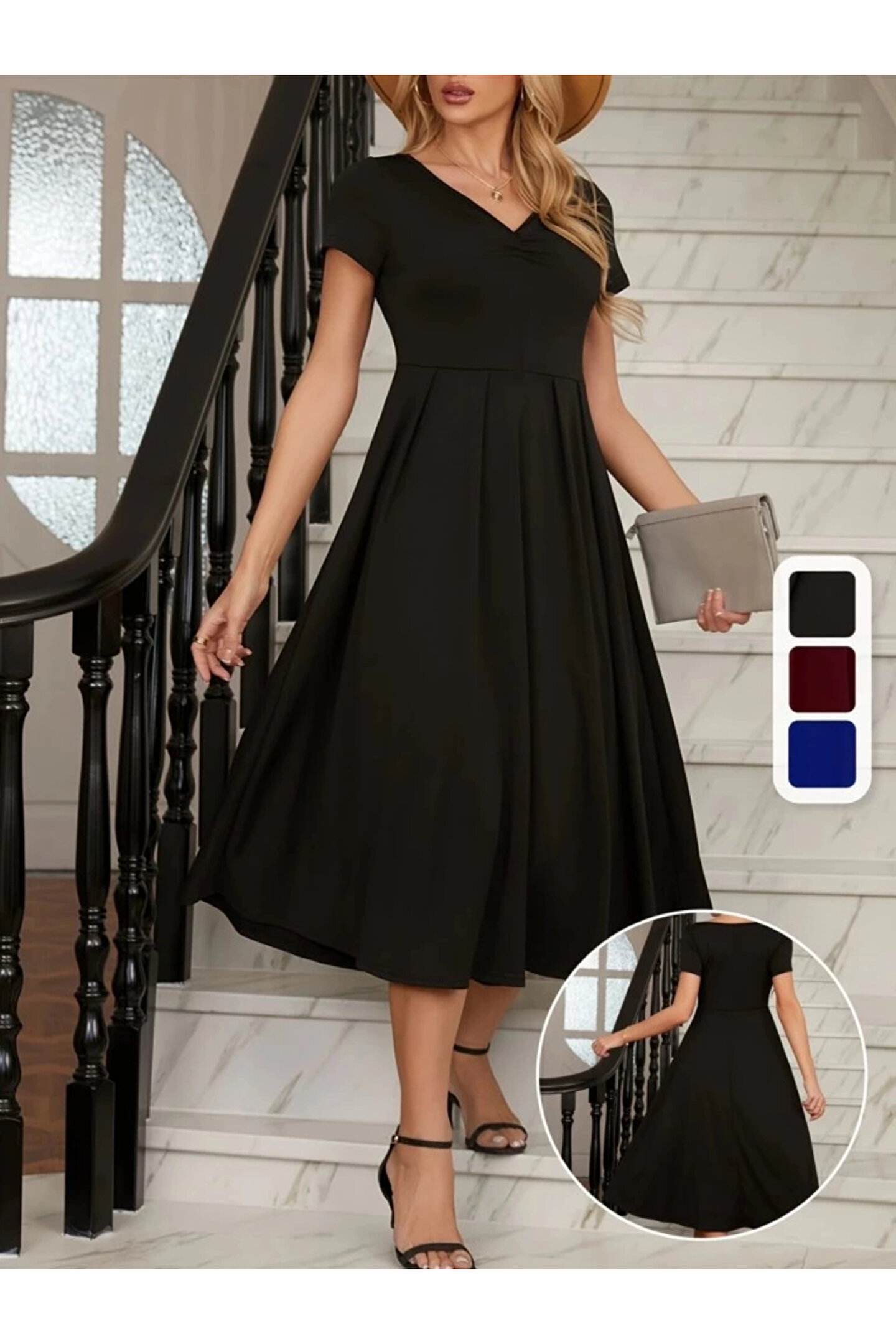 Kadın Kısa Kollu V Yakalı önden Pileli Midi Janjan Krep Elbise