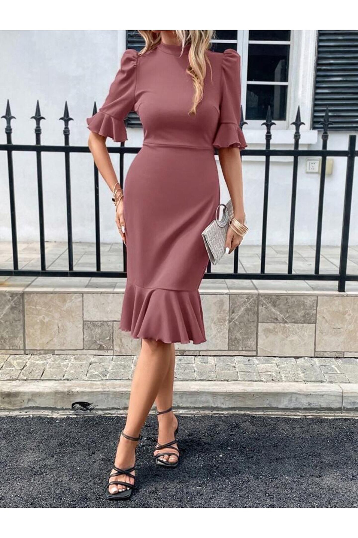 Kadın Kısa Kollu Yarı Balıkçı Yakalı Etek Ucu Fırfırlı Midi Ithal Krep Elbise