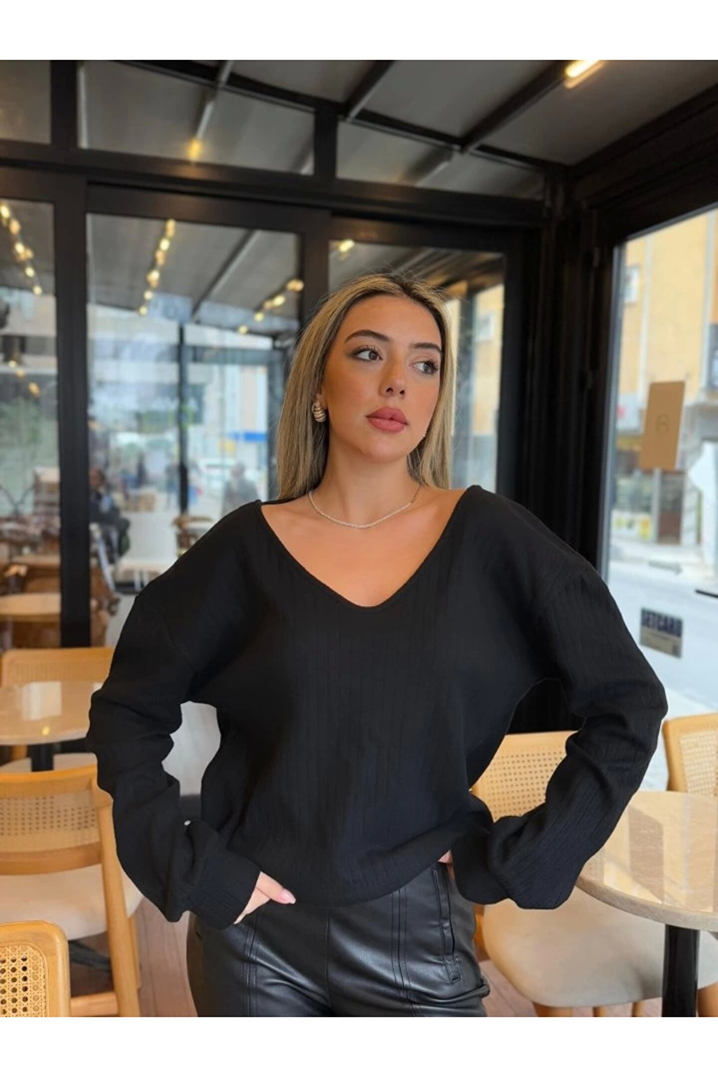 Kadın Uzun Kollu V Yakalı Pencere Sırt Dantel Detaylı Kalın Fitilli Kaşkorse Bluz Modelin Ölçüleri: Boy:165, Kg:55, Göğüs:90, Bel:72, Kalça: 100 Modelin üzerindeki ürün M/38 bedendir DESEN-Diğerleri KALIP-Sırtı Açık