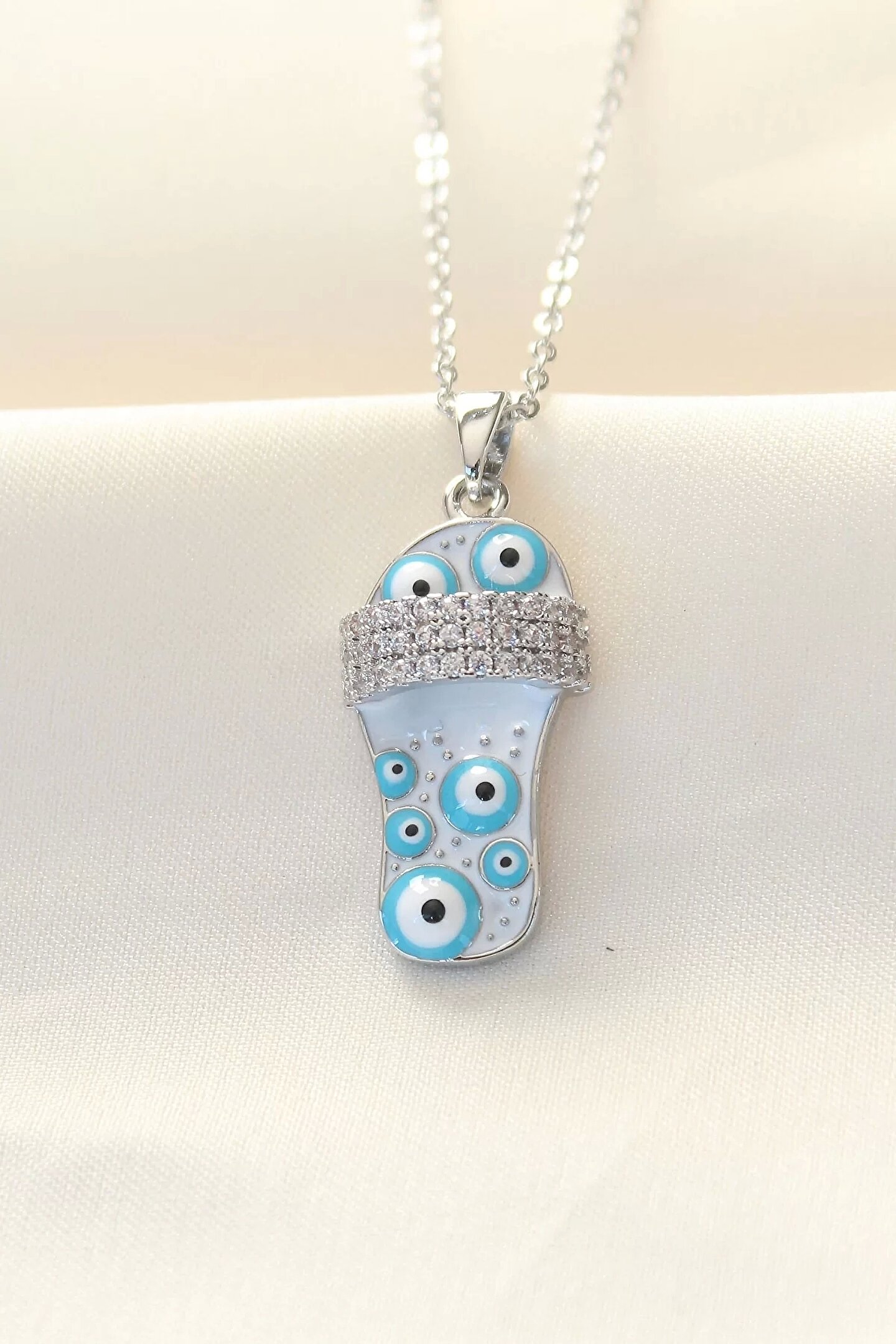 Asimmim 316L Zinciri Çelik Zirkon Taşlı Gümüş Renk Nazar Boncuklu Terlik Kolye