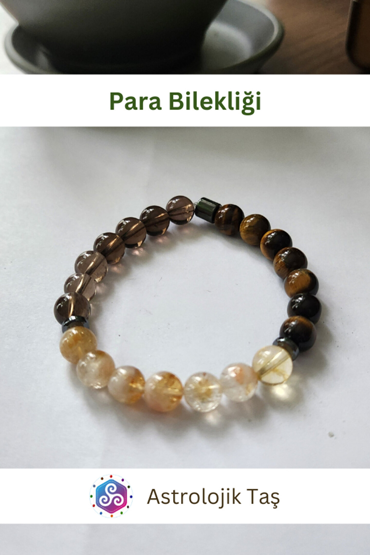 Astrolojik Doğal Taş Para Bilekliği - Para Mıknatısı Çekimi - Bolluk Bereket - Sitrin, Kaplan Gözü & Dumanlı Kuvars