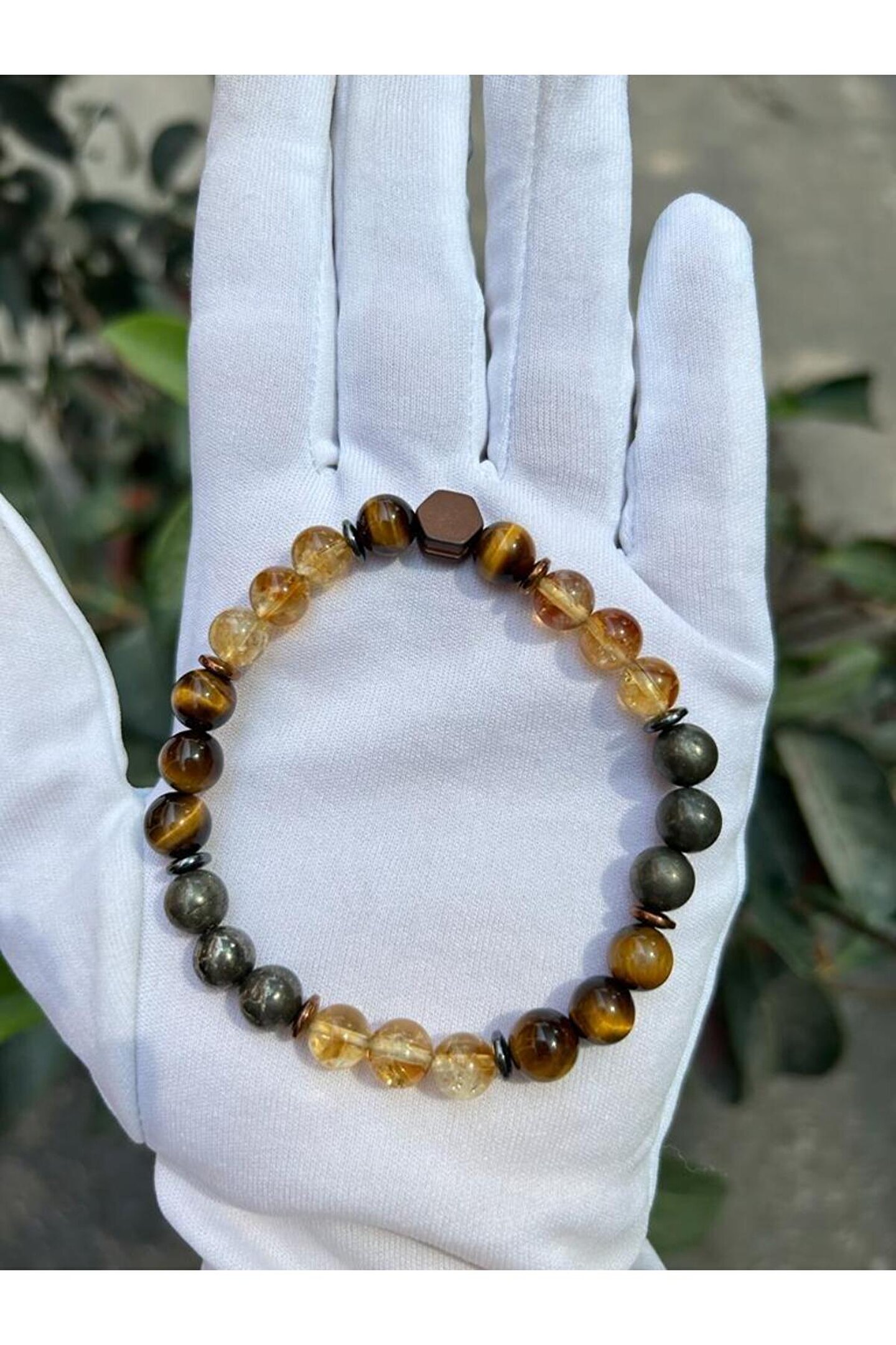 Bileklik İçerisindeki Taşlar: *Sitrin *Kaplangözü *Pirit *Ortadaki Taş: Hematit Taşı *Kullanılan Aparatlar: Hematit Taşı SiTRiN / CİTRİNE (Para Taşı) Sitrin Taşı, metabolizmayı hızlandırır ve kilo vermede yardımcı olur. ; Enerji eksikliğinde tamamlayıcı roldedir,sarı renginden dolayı zenginliği ifade eder. ; KAPLAN GÖZÜ / TİGER EYE (Kuvvet Taş) Kaplangözü taşı, boyun, migren ağrıları için yardımcı olur. ; Bilinçaltı temizlemesinde katalizör görevini üstlenir. ; Bütün organların uyum içinde çalışmasına yardımcı olur.Yaşama gücü,canlılık ve dayanma gücü sağlar. ; PiRiT / PYRİTE (Demir Taşı) Pirit Taşı, erkeksi güçlere destekçi konumundadır. ; Vücuttaki mikroplara karşı savaşma direncini arttırır. ; Demir ihtiva etmesiyle iletkenlik özelliği vardır. ; Bu özellikler ağrı ve sızıların giderilmesinde yardımcı olur.;