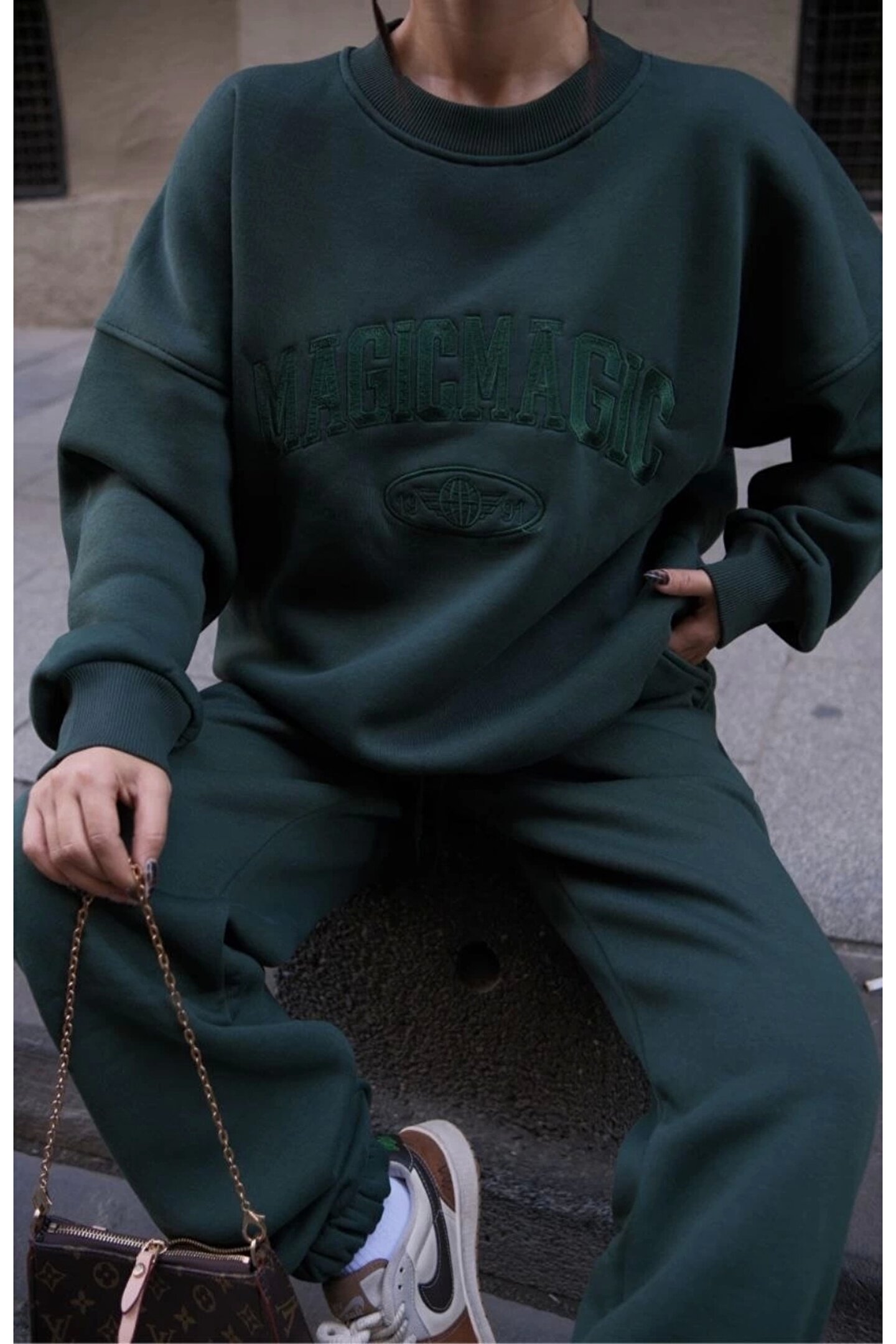 ATREAS Bisiklet Yaka Nakış İşlemeli Üç İplik Sweat Takım - Yeşil