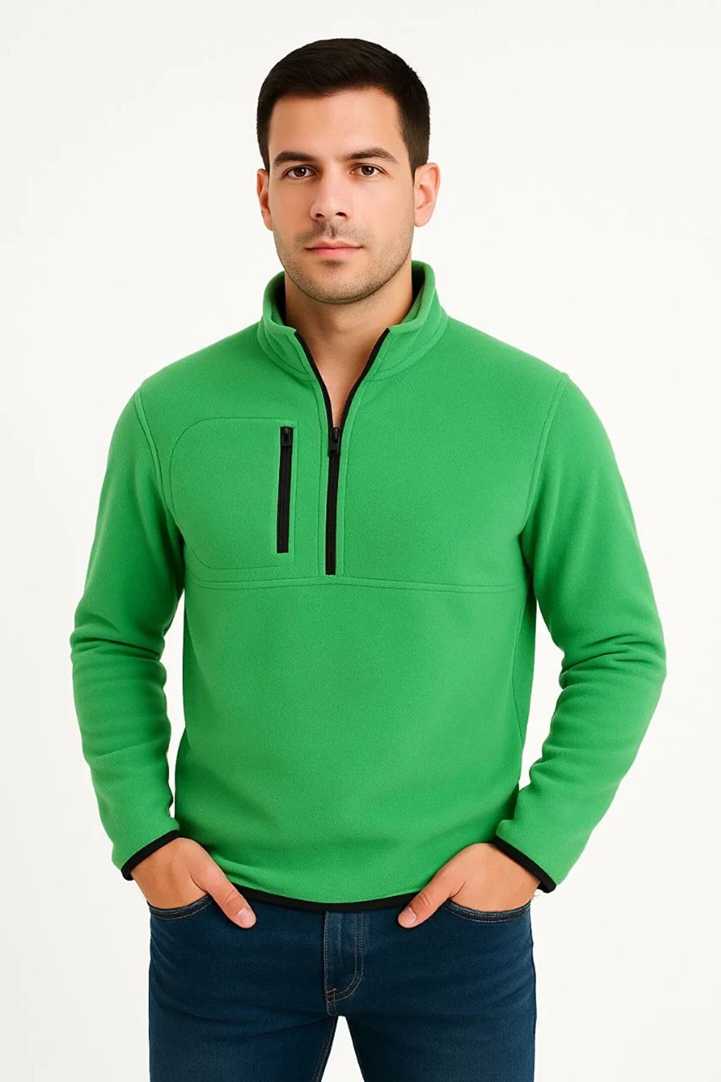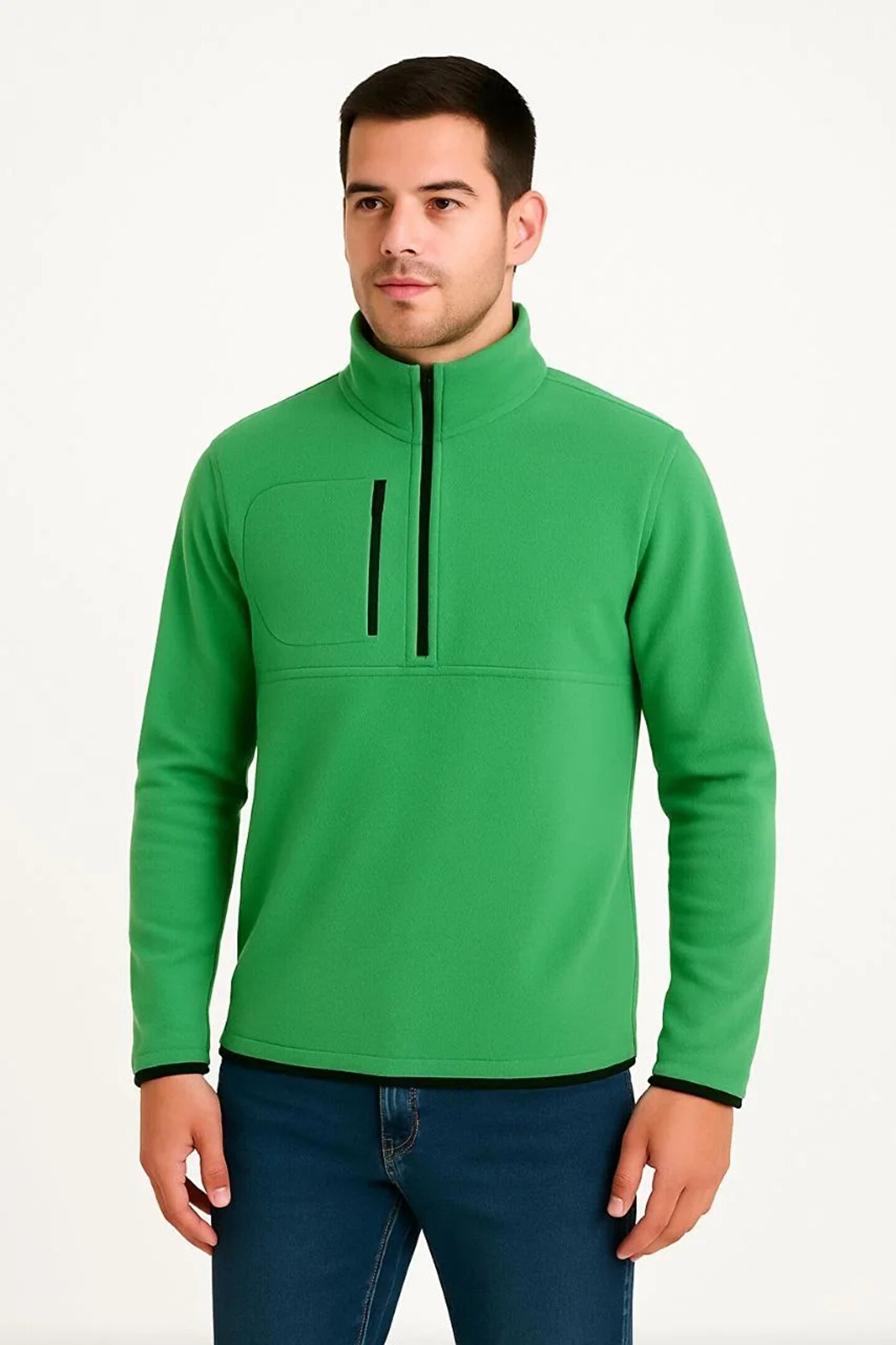 Erkek Polar Kazak – Dik Yaka, Yarım Fermuarlı, Fermuarlı Göğüs Cepli, Siyah Biyeli, Kışlık Rahat Regular Fit Günlük Model - Yeşil