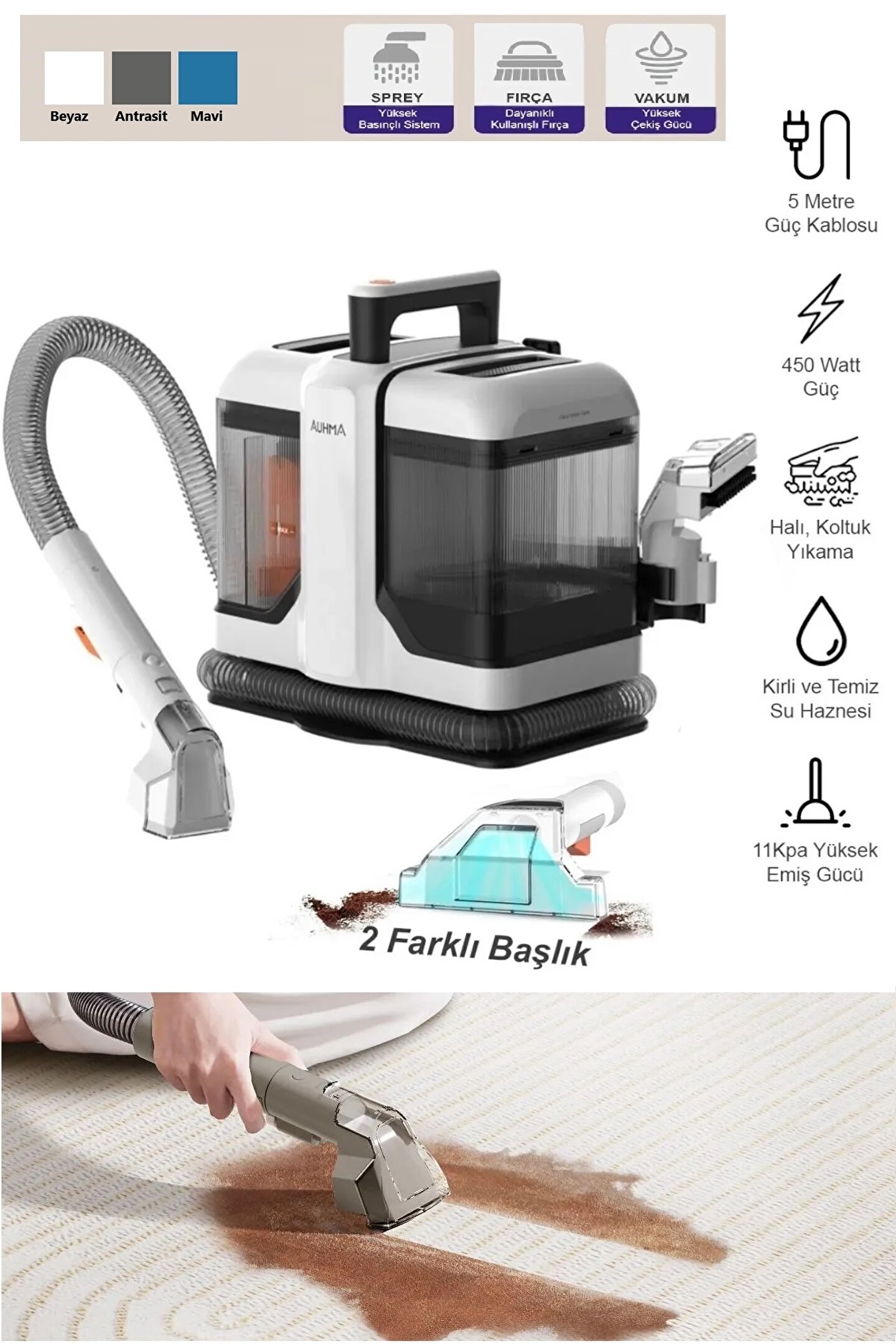 auhma Çift Hazneli Çok Amaçlı Koltuk ve Halı Yıkama Makinesi Beyaz Aspt-01