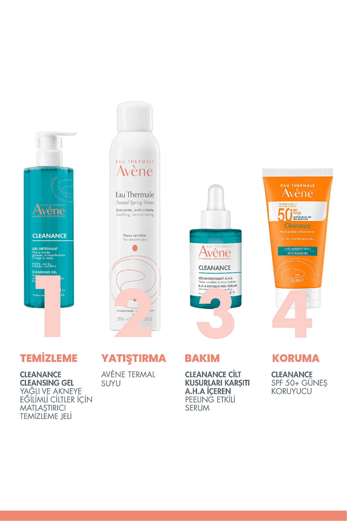 Avene Cleanance Yağlı Ciltler ve Akneye Eğilimli Ciltler için Matlaştırıcı Etkili Temizleme Jeli 400 ml, yağlı ve akneye eğilimli ciltler için özel olarak geliştirilmiş nazik bir temizleyicidir.;Ciltteki fazla yağın dengelenmesini sağlar.;Gözenekleri tıkayan kir ve sebum birikimini temizleyerek arındırıcı etki sağlar.;Matlaştırıcı etkisi sayesinde ciltte gün boyu dengeli bir görünüm sunar.;Avène Termal Su ile zenginleştirilmiş içeriği sayesinde cildi yatıştırır ve rahatlatır.;İçerisindeki Çinko Glukonat ile ciltteki yağlanmayı kontrol altına alır.;Nazik formülü sayesinde hassas ciltler için uygundur ve cildi kurutmadan etkili bir temizlik sunar.;Düzenli kullanımda ciltteki siyah nokta görünümünde %73 azalma sağlar* (*50 kişi, 14 günlük öz değerlendirme, Pierre Fabre Klinik Veriler);Ciltteki makyajı ve gözenekleri tıkayan kirleri nazikçe temizler.;Sabah ve akşam nemli cilde uygulanarak köpürtülür ve durulandıktan sonra nazikçe kurulanır.;Günlük cilt bakım rutininin ilk adımı olarak ideal bir yüz temizleme jelidir.;%84 doğal içerikli formüle sahiptir.;Yağlı ve karma cilt tipleri için uygun olup dermatolojik olarak test edilmiştir.;Ciltte ferah ve temiz bir his bırakırken, gün boyu yağlanma kontrolüne yardımcı olur.;Hafif köpüren yapısı sayesinde kolay uygulanır ve durulanır.;Hassas ciltlere uygun nazik formülü sayesinde günlük kullanıma uygundur.;Cleanance Yüz Temizleme Jeli, cildi derinlemesine temizleyerek matlaştırcı etki sağlar."