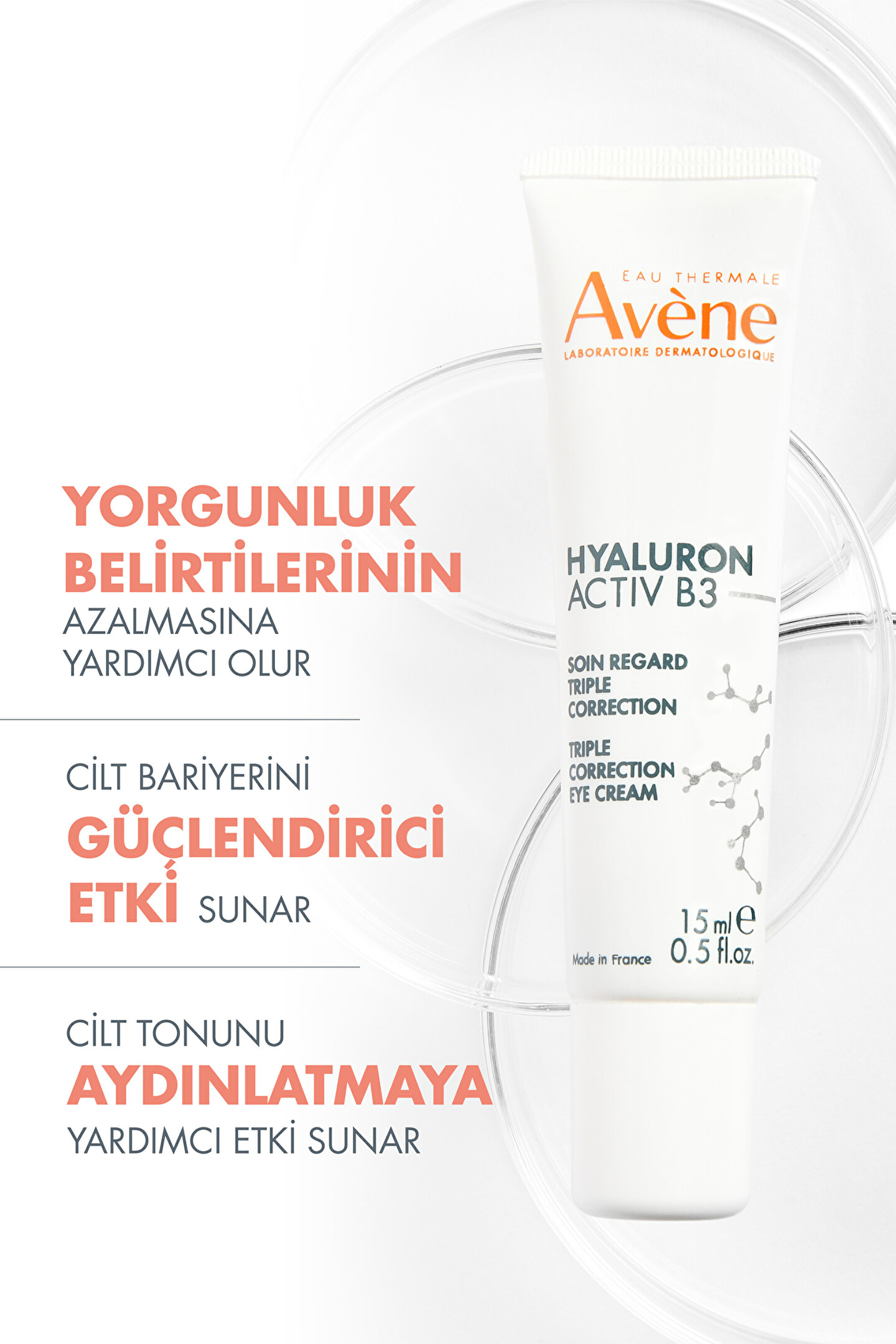 Hyaluron Activ B3 Hyaluronik Asit ve Niasinamid İçerikli Aydınlatıcı Etkili Göz Çevresi Kremi 15 ml, göz çevresindeki yaşlanma belirtilerine karşı etkili bakım sunar.;%93 doğal içeriklidir.;Hyaluronik Asit içeriği sayesinde cildi nemlendirir, pürüzsüzleştirir ve dolgunlaştırır.;Dextran Sülfat içeriği, yorgunluk belirtilerinin görünümünün azalmasına yardımcı olur.;Uzun ömrün meyvesi, doğal kaynaklı koruyucu Haritaki Ekstresi içerir.; Kırışıklık görünümünü azaltarak daha genç ve sağlıklı bir göz çevresi sunar.;Yorgunluk belirtilerinin azalmasına yardımcı olur.;Avène Termal Su içeriğiyle yatıştırır, ferahlatır ve hassasiyeti azaltır.;Hassas göz çevresi için özel olarak geliştirilmiş olup tüm cilt tipleri için uygundur.;Göz çevresinde cilt bariyerini güçlendirici etki sunar.;Cilt tonunu aydınlatmaya yardımcı etki sunar.;Sabah ve akşam göz çevresine nazik tampon hareketleriyle uygulanarak cilde emdirilmelidir.;Dermatolojik olarak test edilmiştir ve hassas ciltlerde kullanılabilir.;Hyaluron Activ B3 Üç Etkili Göz Çevresi Bakım Kremi, göz çevresini nemlendirirken aydınlatıcı ve sıkılaştırıcı etkisiyle uzun süreli bakım sunar.;Sıkılaştırıcı ve aydınlatıcı etki sunar.