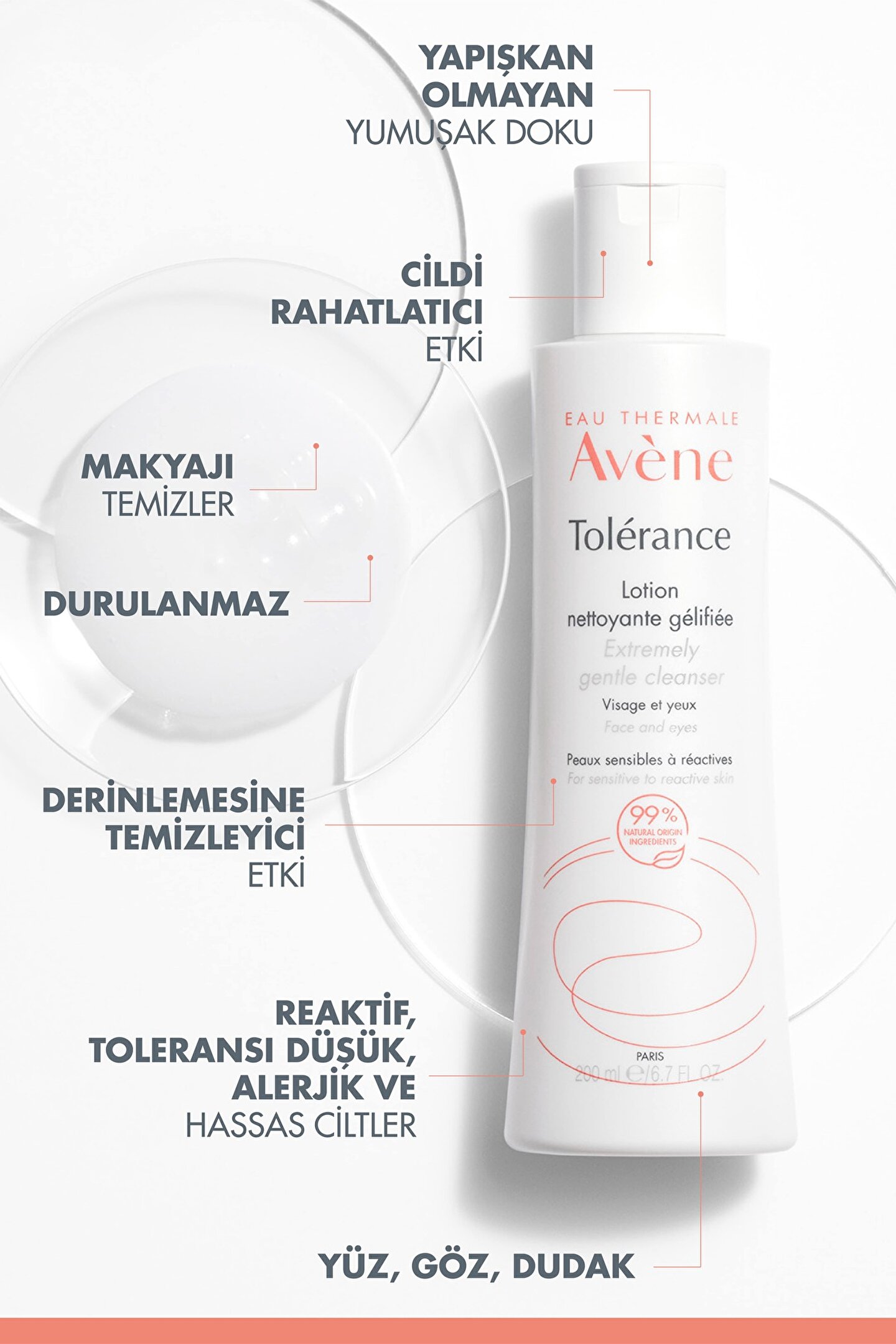 "Tolerance Lotion Hassas Ciltler İçin Temizleme Losyonu, hassas ve reaktif ciltler için özel olarak geliştirilmiş bir yüz temizleyicisidir.;Cildi tahriş etmeden nazikçe temizler ve arındırır.;Toleransı düşük, alerjik ve hassas ciltlere özel olarak formüle edilmiştir.;Durulama gerektirmeyen yapısı sayesinde cildi yormadan temizlik sağlar.;Makyaj kalıntılarını ve günlük kirleri cildi tahriş etmeden temizler.;Yapışkan olmayan yumuşak bir dokuya sahiptir.;Cilt hassasiyetini azaltmaya yardımcı olur.;İçeriğindeki Avène Termal Su, cildi yatıştırmaya ve rahatlatmaya destek olur.;D-Sensinose™ yatıştırıcı aktif madde ile hassas ciltler için uygundur.;Skualen içeriği sayesinde cildi nazikçe temizlerken nemlendirme etkisi sunar.;Yapışkan bir his bırakmadan cildi tazeler.;Yüz, göz ve dudak bölgesinde güvenle kullanılabilir.;Sabah ve akşam pamuk yardımıyla cilde uygulanması önerilir.;Nazik formülü sayesinde durulama gerektirmez.;Reaktif ve toleransı düşük ciltler için özel bakım sunar.;Kızarıklık ve tahrişe eğilimli ciltleri rahatlatmaya yardımcı olur.;Tüm cilt tiplerinde kullanılabilir, özellikle hassas ve alerjik ciltler için uygundur.; "