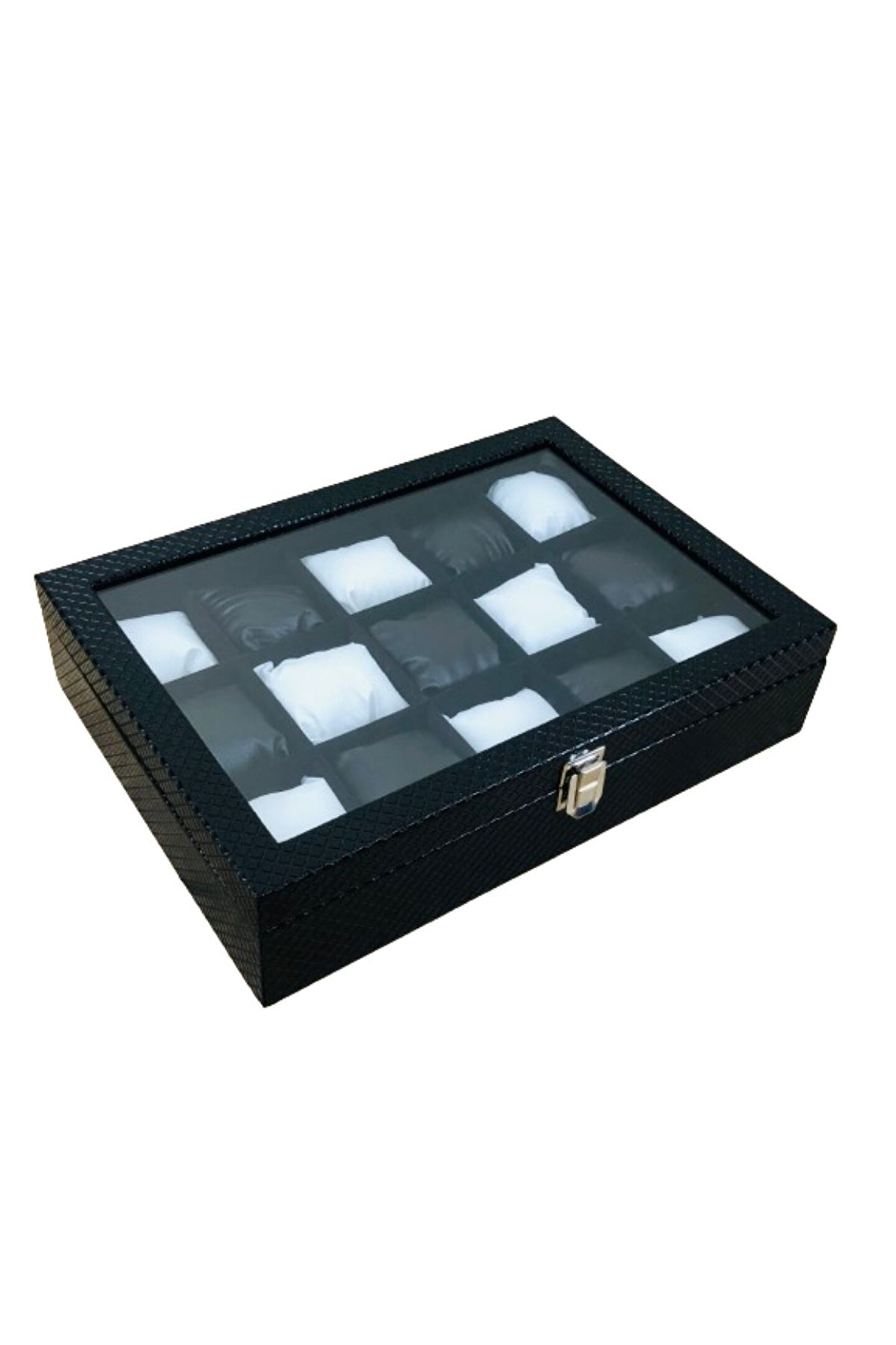 Baklava Desen Siyah Renk Deri Kaplama Ahşap Lux 15'li Saat Kutusu Siyah Beyaz Yastıklı