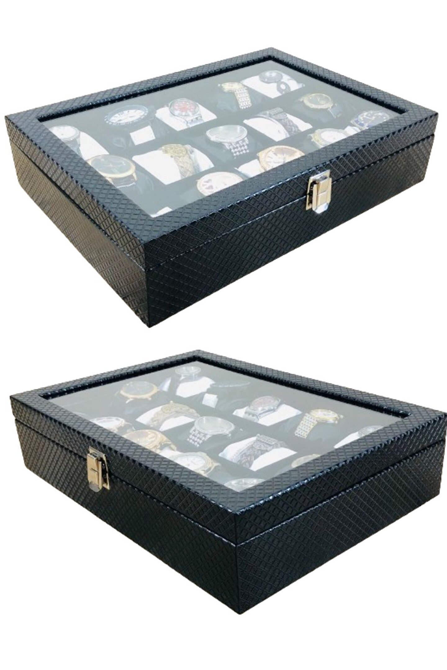 Axe Tools Baklava Desen Siyah Renk Deri Kaplama Ahşap Lux 15li Saat Kutusu Siyah Beyaz Yastıklı