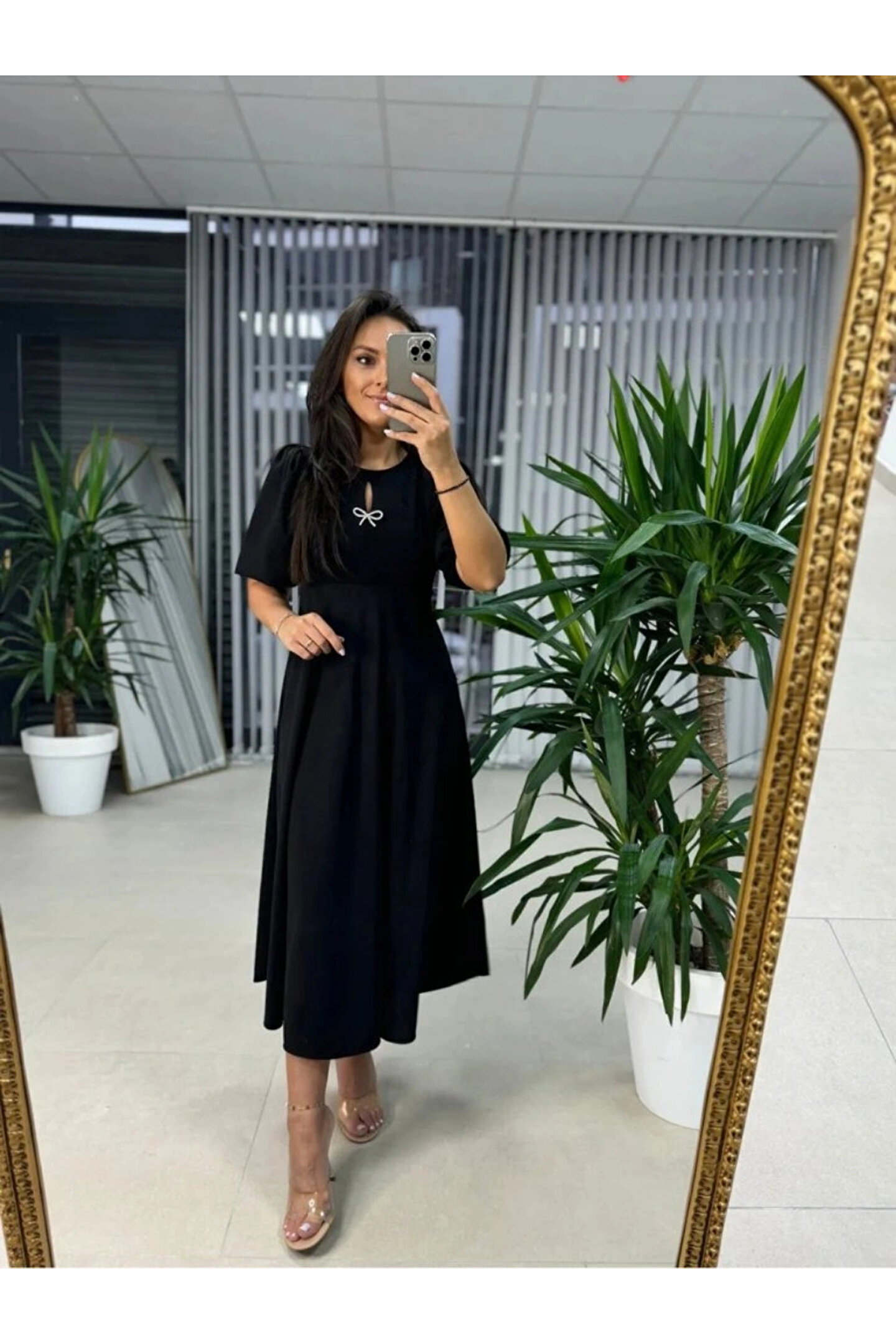 Aydoganticaret44 Kadın Kısa Kollu Bisiklet Yaka Fiyonk Broşlu Midi Janjan Krep Elbise