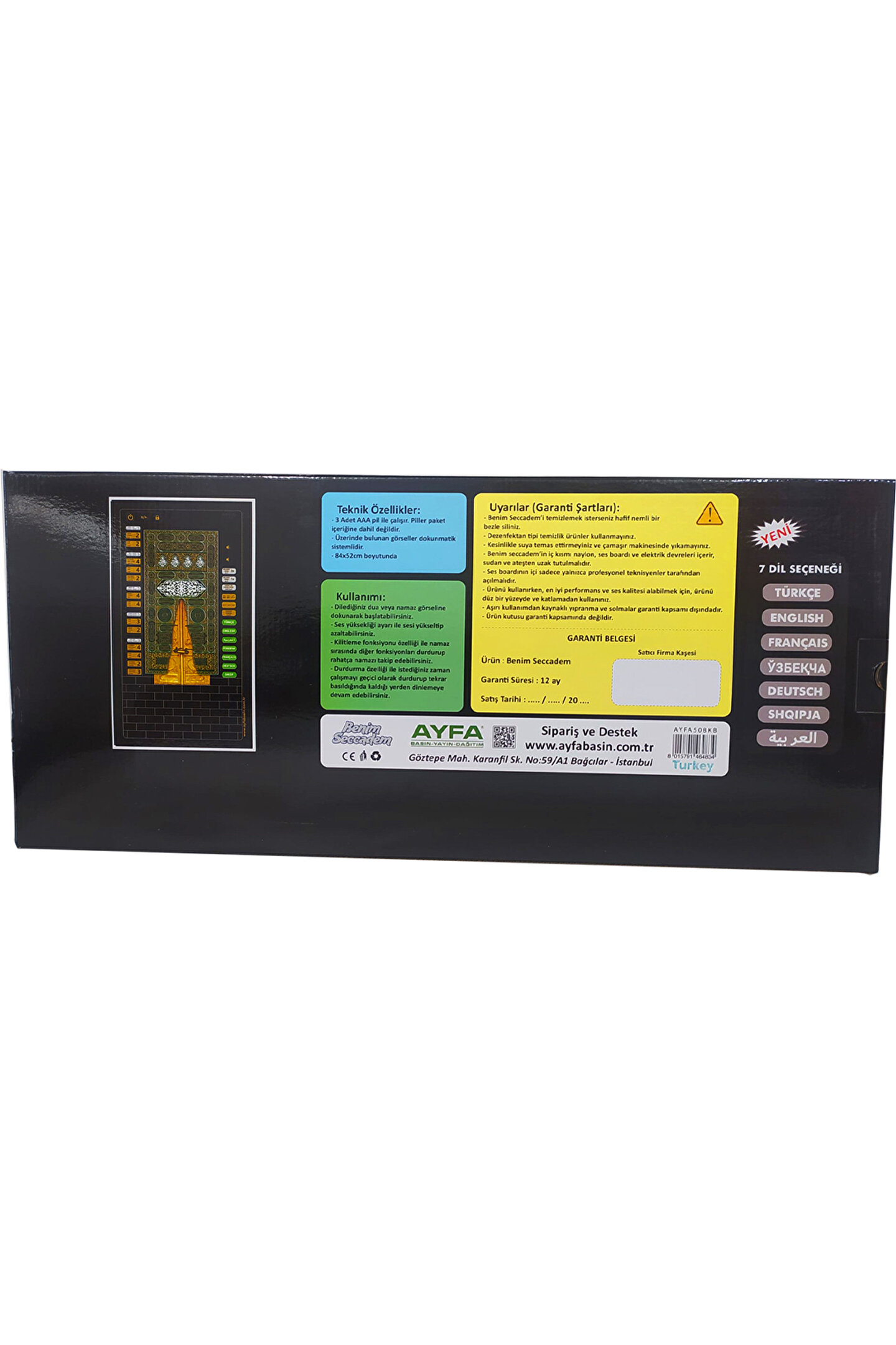 Rabbimizin emri olan namazı çocuklarımızın namazlarını kılmaya alışmalarında ve ilk öğrenme aşamalarında eksiksiz ve en doğru şekilde namazlarını kılmalarını kılmayı öğrenmeleri için hazırlanmış bu eşsiz ürün ile çocuklarınız namaz kılmayı eğlenerek öğrensin; PAKET İÇERİĞİ: 1 Adet Benim Seccadem Sesli Eğitici Çocuk Seccadesi İLK SECCADEM ÇOCUKLAR İÇİN NAMAZ KILMAYI ÖĞRETEN SECCADE TEKNİK ÖZELLİKLERİ: Benim Seccadem iç kısmı naylon, ses boardı ve elektrik devreleri içerir, sudan ve ateşten uzak tutulmalıdır; Ses boardının içi sadece yalnızca profesyonel teknisyenler tarafından açılmalıdır; Ürünü kullanırken, en iyi performans ve ses kalitesi alabilmek için, ürünü düz bir yüzeyde ve katlamadan kullanın; İlk Seccademi temizlemek isterseniz hafif nemli bir bezle siliniz; Kesinlikle suya temas ettirmeyiniz ve çamaşır makinasın da yıkamayınız KULLANIMI: 3 Adet AAA pil ile çalışır; Piller paket içeriğine dahil değildir; Üzerinde bulunan görseller dokunmatik sistemlidir; Dilediğiniz dua veya namaz görseline dokunarak başlatabilirsiniz; Ses yüksekliği ayarı ve durdurma özelliğine de sahiptir; ÜRÜN BOYUTU: 88 Cm x 52 Cm Not: Garanti süresi, ürünün teslim tarihinden itibaren başlar; Ürün 1 yıl garantilidir; Teslimat Bilgileri Kargonuz teslim edildiğinde, ürünün paketinde deformasyon veya ürüne zarar verebilecek bir durum söz konusu ise, kargo görevlisi ile birlikte paketi açarak ürünlerinizin durumunu kontrol ediniz; Ürünlerinizde bir hasar gördüğünüz takdirde, kargo yetkilisinden tutanak tutmasını isteyiniz ve paketi teslim almayınız; ;;